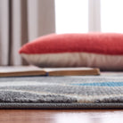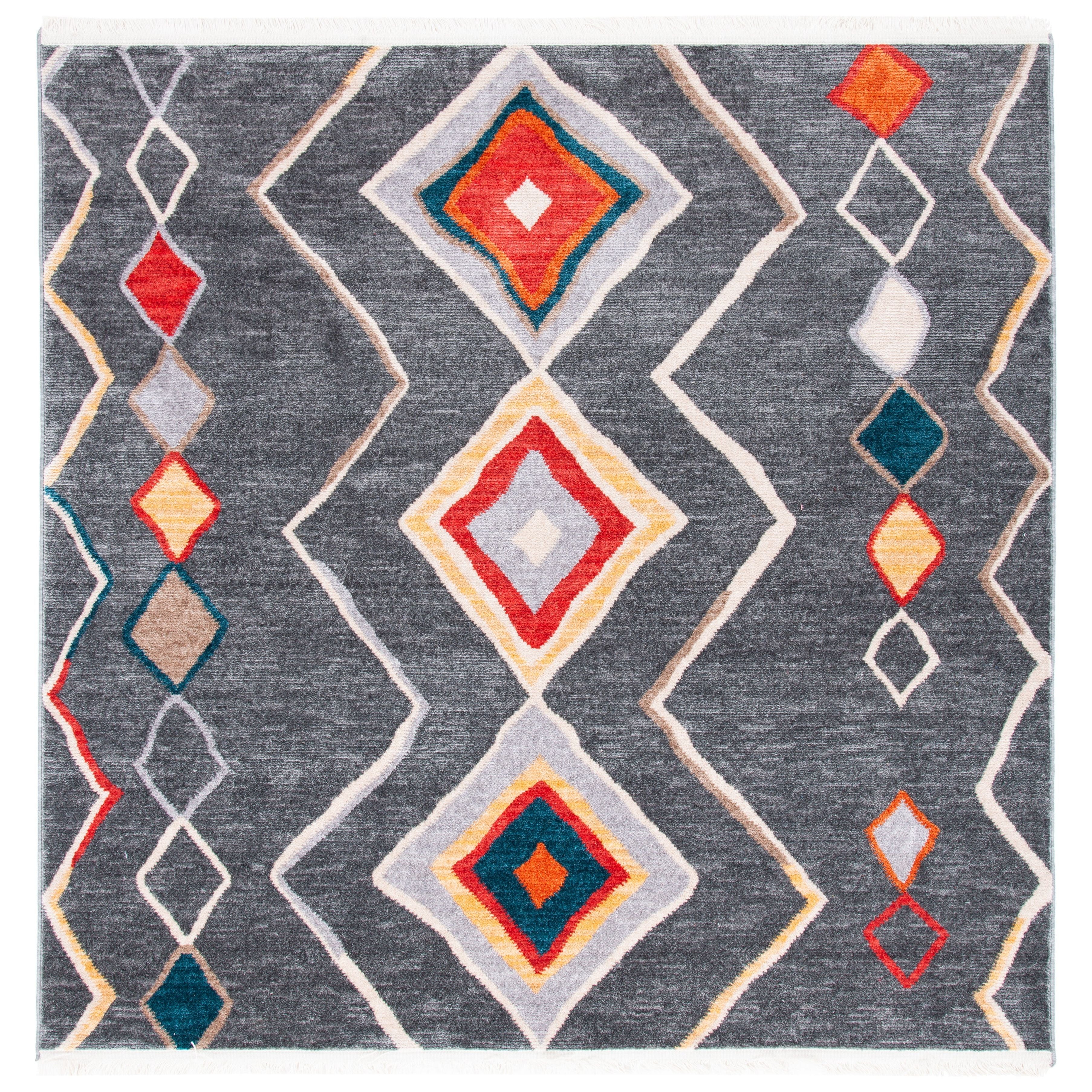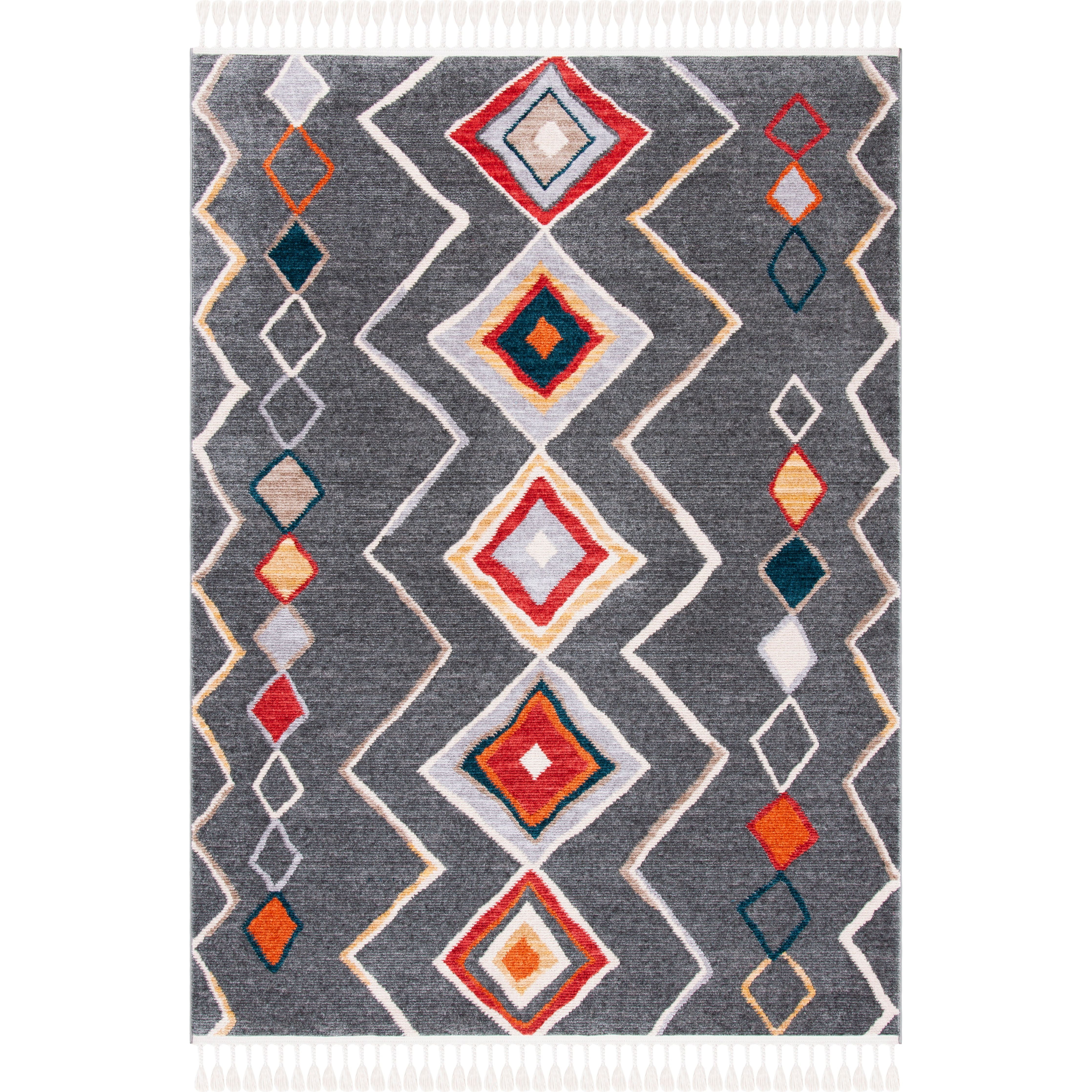 Farmhouse FMH599F rug, designed to bring a touch of modern farmhouse charm to your space. This bohemian-inspired rug features braided tassels on each end, adding a stylish yet effortless look. The rug showcases a beautiful blend of blue, orange, yellow, and red hues reminiscent of traditional southwestern colors. Crafted with a super smooth polyester pile, this rug is versatile and can be layered over a natural fiber rug for a trendy aesthetic or placed on its own under furniture in various rooms such as the living room, bedroom, or dining area. With an approximate thickness of 0.25 inches, it offers both comfort and style.