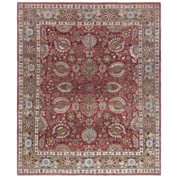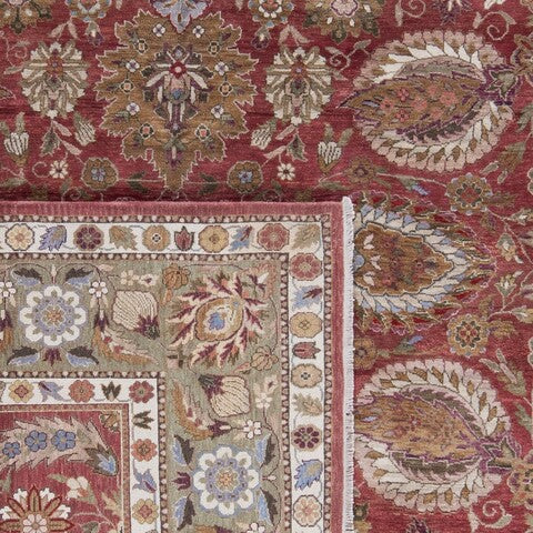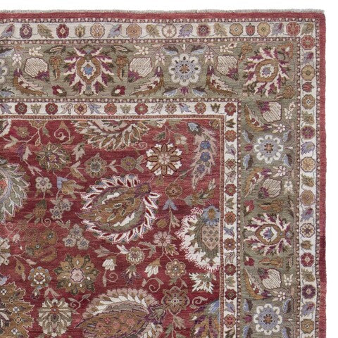 exquisite Old World OW117A Copper Green rug, a masterpiece inspired by 19th Century Agra designs. This unique collection features a special hand-spun heathered yarn that gives each rug a distinct aged character and heirloom quality. The Old World rugs are meticulously crafted with tightly woven, small knots that create a luxurious plush pile, ensuring exceptional durability and longevity.