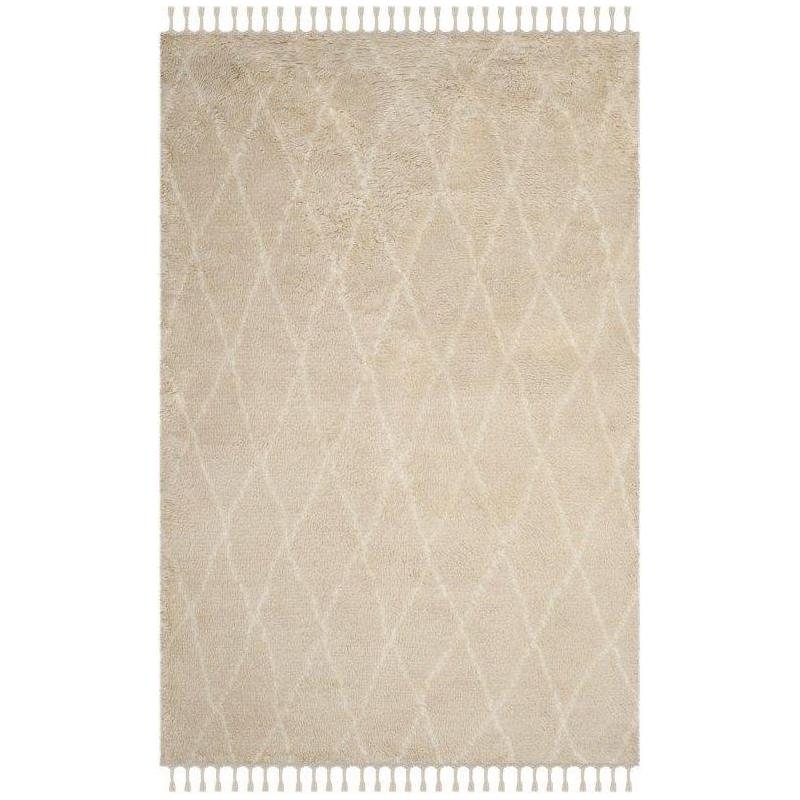 Casablanca CSB145C rug from Safavieh's Casablanca Collection, inspired by the minimalistic designs of Moroccan Beni Ourain rugs. This rug features a timeless mosaic pattern of navy and ivory geometrics on a soft washed blue shag pile, creating a rustic yet modern look. Hand-tufted with premium New Zealand wool, this rug offers the luxurious feel and appearance reminiscent of classic Middle Eastern Flokati-style floor coverings.
