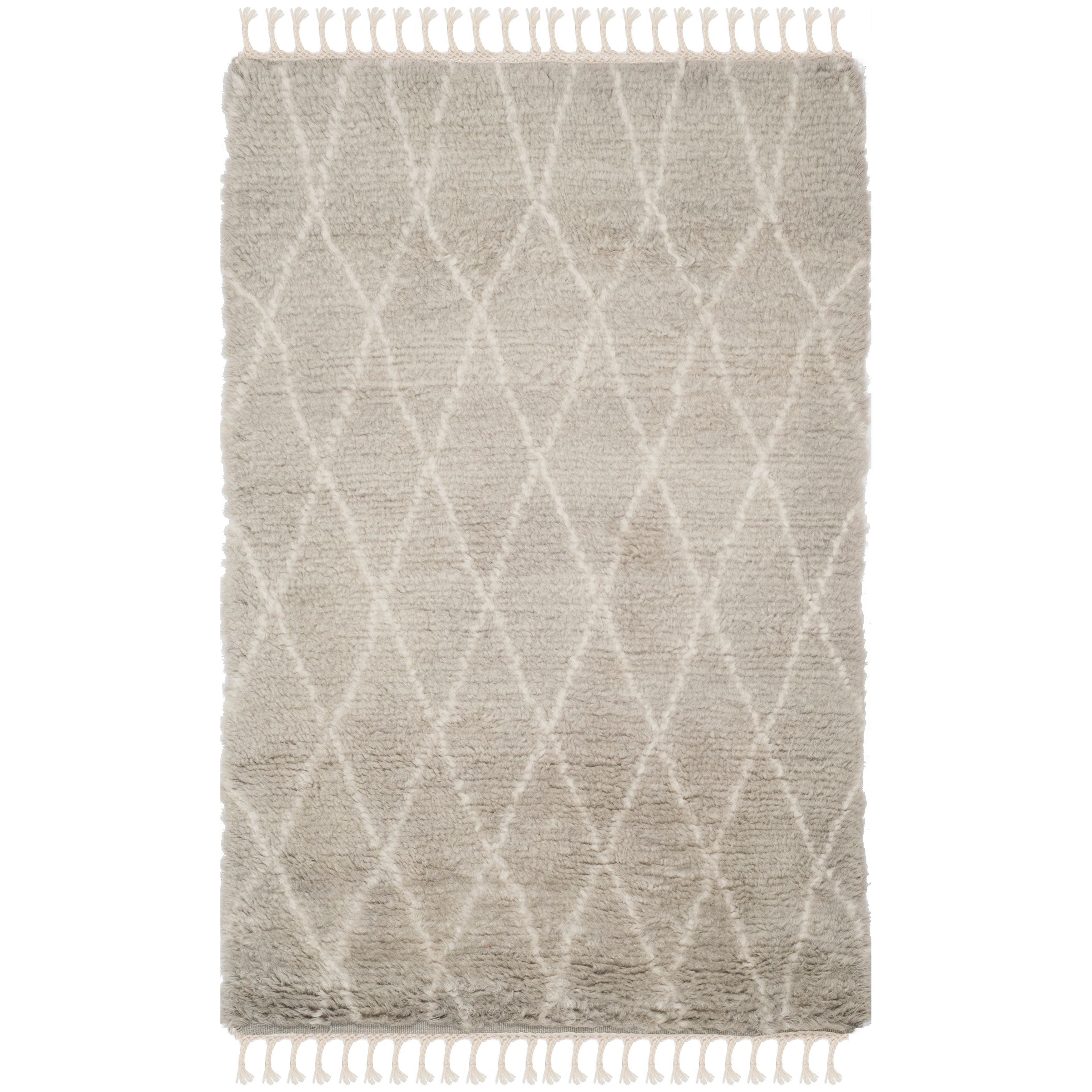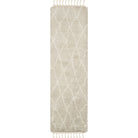Casablanca CSB145D, a stunning addition to Safavieh's Casablanca Collection inspired by the minimalistic designs found in Moroccan Beni Ourain rugs. This rug features a classic mosaic pattern of nave and ivory geometrics set into a washed blue shag pile, bringing a soft and rustic touch to modern metropolitan interiors.