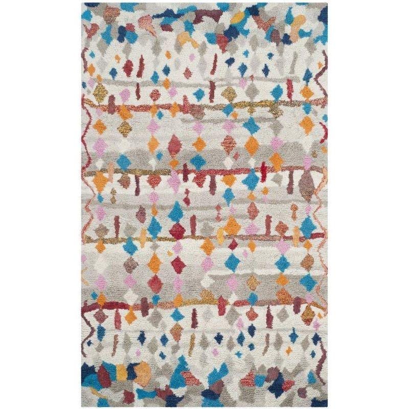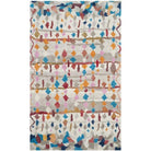 Casablanca CSB216A, a modern interpretation of the Moroccan Beni Ourain rugs found in Safavieh's Casablanca Collection. This rug features a timeless mosaic pattern with navy and ivory geometrics on a washed blue shag pile, adding a soft and rustic charm to contemporary interiors. Hand-tufted with luxurious New Zealand wool, it mimics the classic Middle Eastern Flokati style for an authentic look and feel.