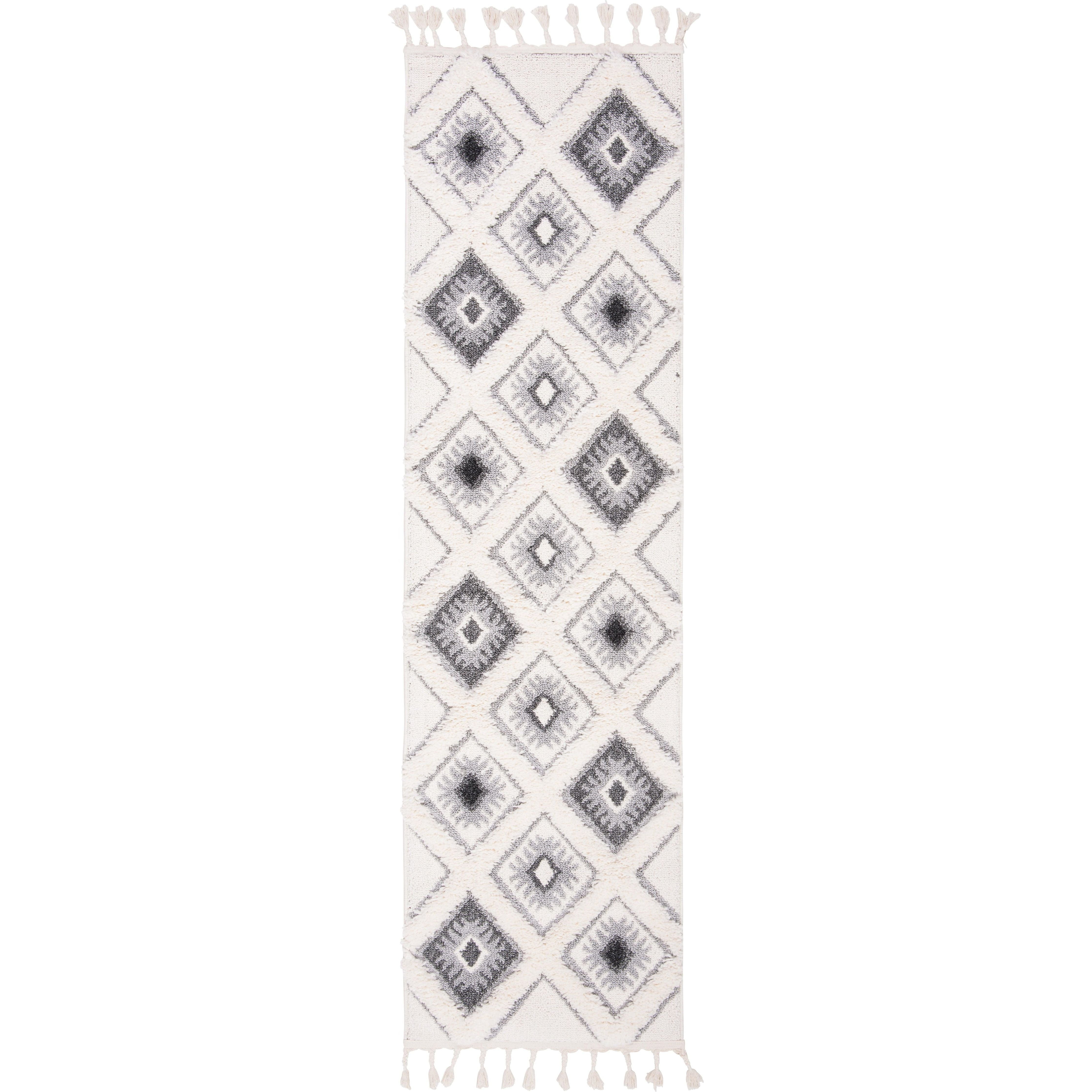 Moroccan Tassel Shag MTS664G, a luxurious addition to any home decor. This thick shag rug from SAFAVIEH's Moroccan Tassel collection features intricate diamond designs and plush textures, exuding Old World charm with a rustic-chic twist. The braided fringe detail adds a whimsical touch to these nomadic-inspired floor coverings.