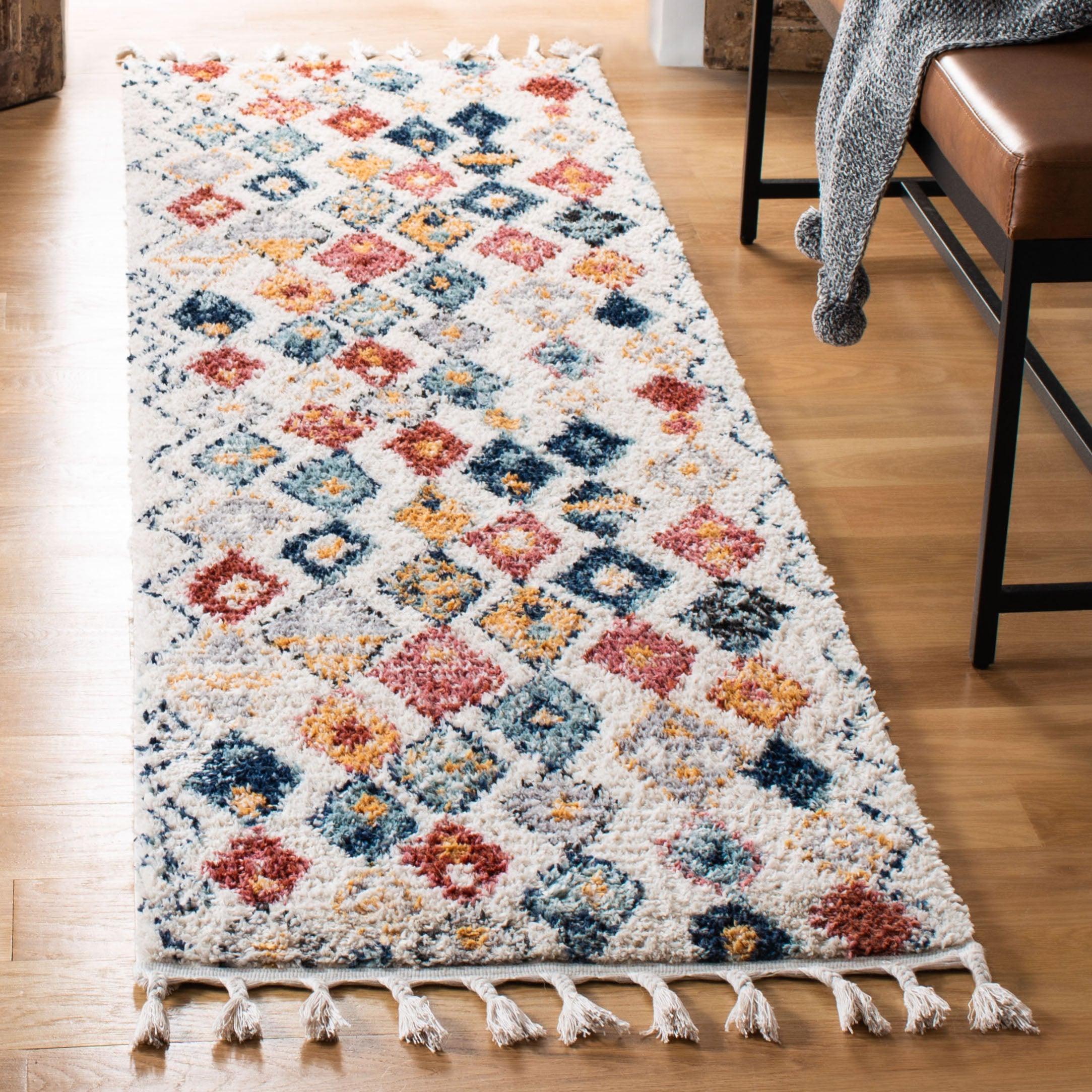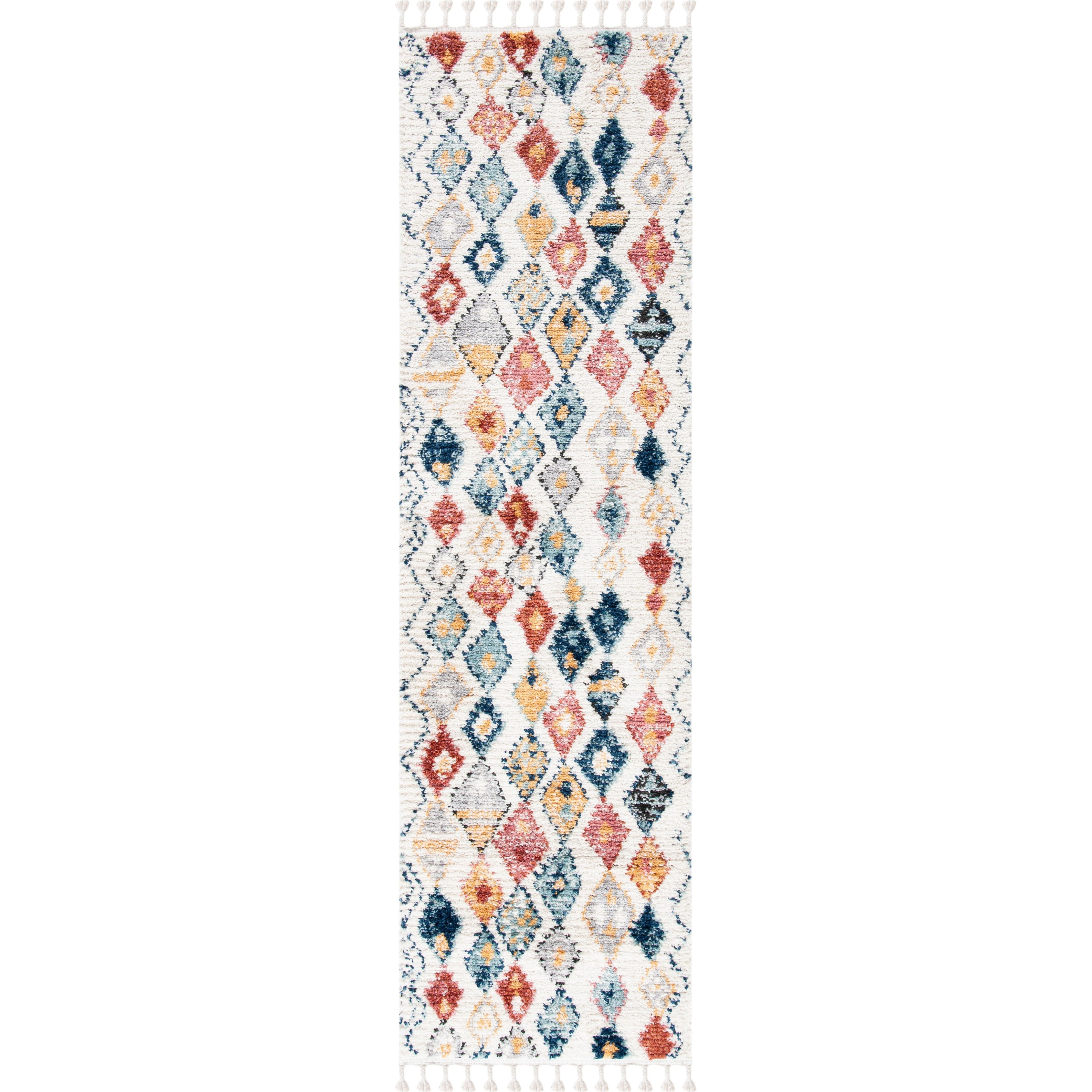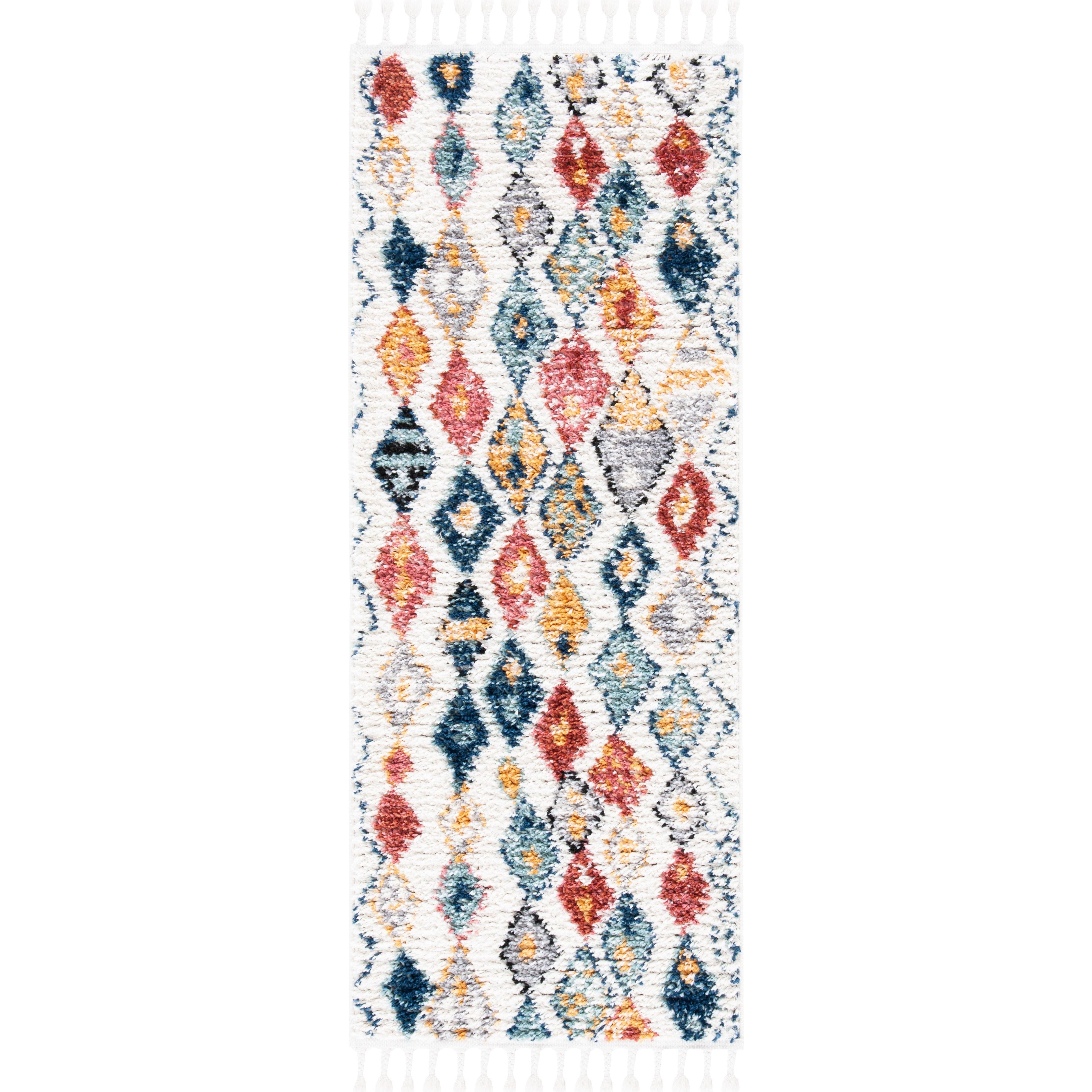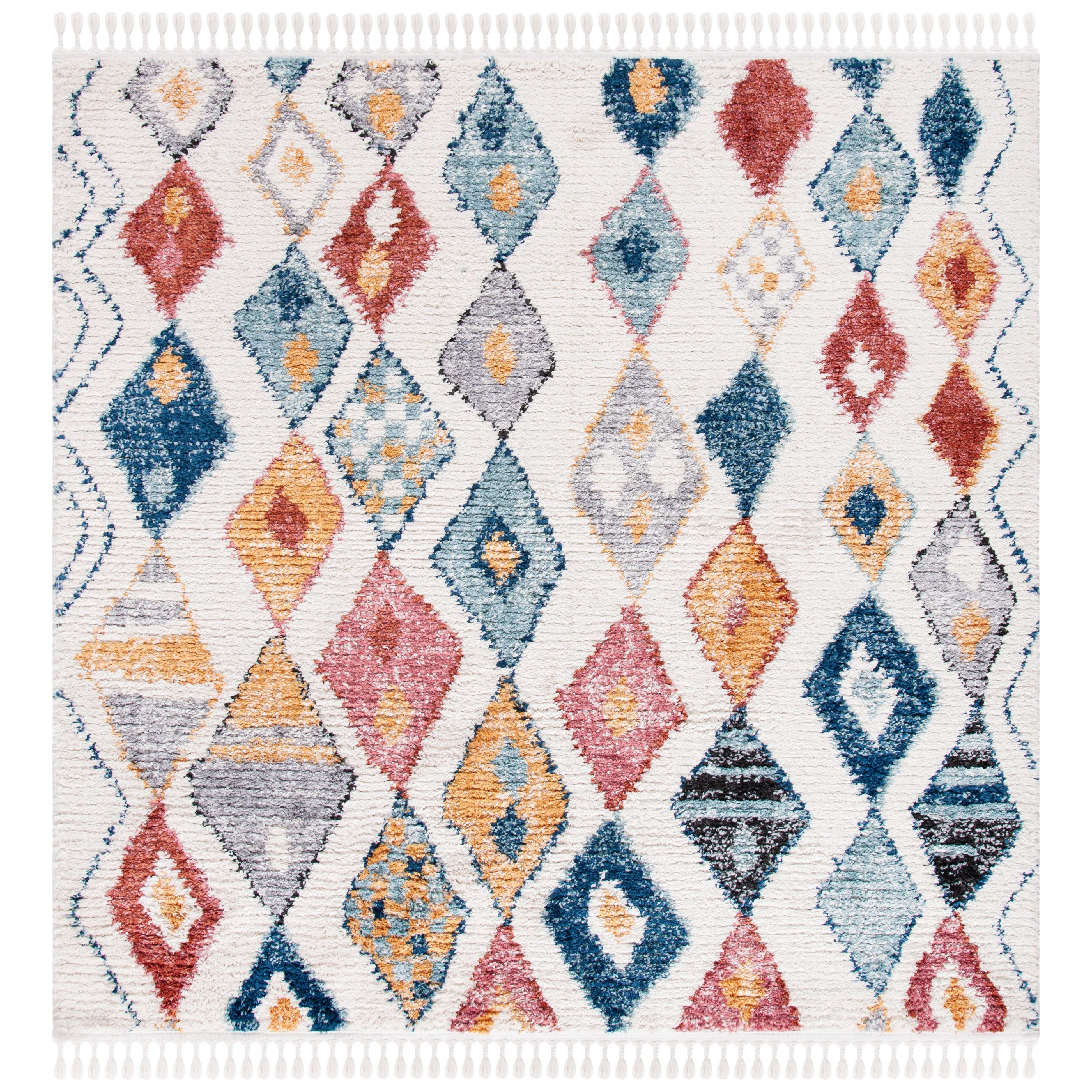 Elevate your home decor with the Morocco MRC924A area rug from SAFAVIEH's exquisite collection. Featuring eye-catching diamond motifs in an array of colors and delicate tassels for a bohemian flair, this rug is a perfect blend of style and comfort. Crafted from premium synthetic fibers with a plush pile, it adds a touch of luxury to any room with its approximate thickness of 0.79 inches.