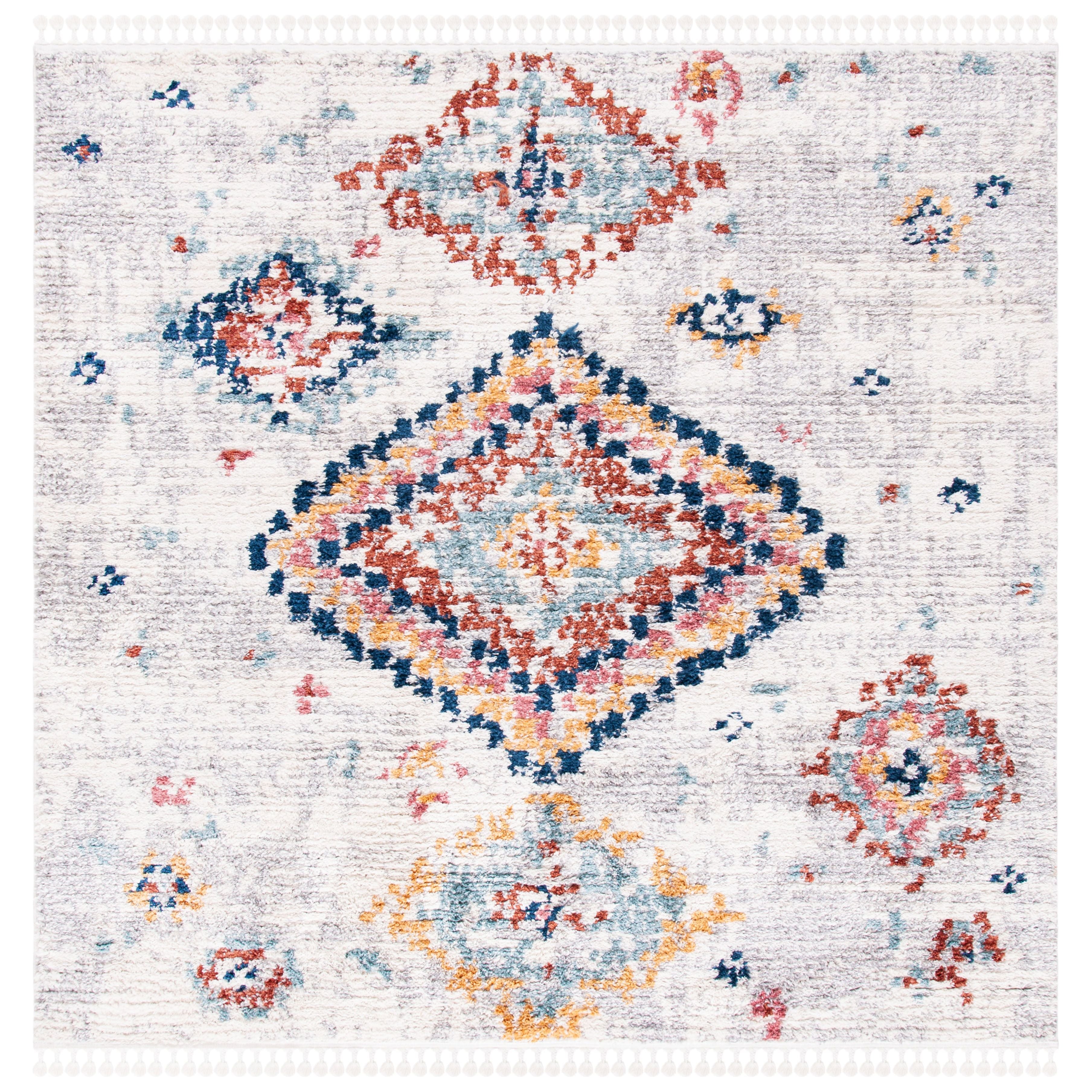 Elevate your home decor with the Morocco MRC954A area rug from SAFAVIEH's exclusive collection. Featuring eye-catching diamond motifs in a variety of colors, this rug exudes a trendy yet bohemian chic vibe with its slim tassels. Crafted from premium synthetic fibers, it offers a soft and durable pile that adds both comfort and elegance to any room. With an approximate thickness of 0.79 inches, this rug is the perfect statement piece for your living space.
