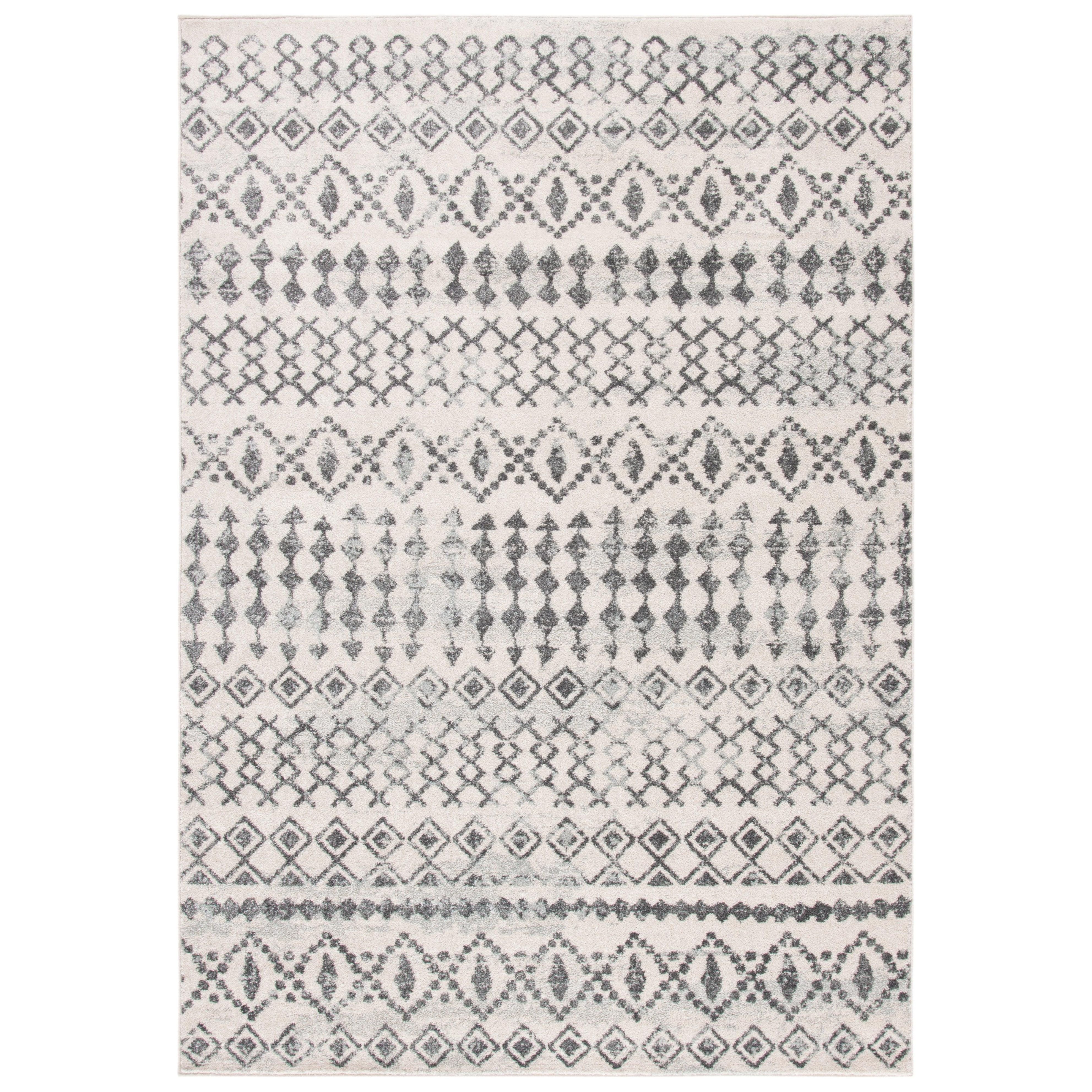 Tulum TUL240A rug from the SAFAVIEH Collection, where soft hues meet rustic patterns for a refreshing and inviting look. These boho-chic area rugs blend modern colors with craft art-inspired designs, adding warmth and character to any room decor. Crafted from soft synthetic yarns, the Tulum rug offers both a distinctive appearance and a comfortable feel underfoot, with an approximate thickness of 0.4 inches.