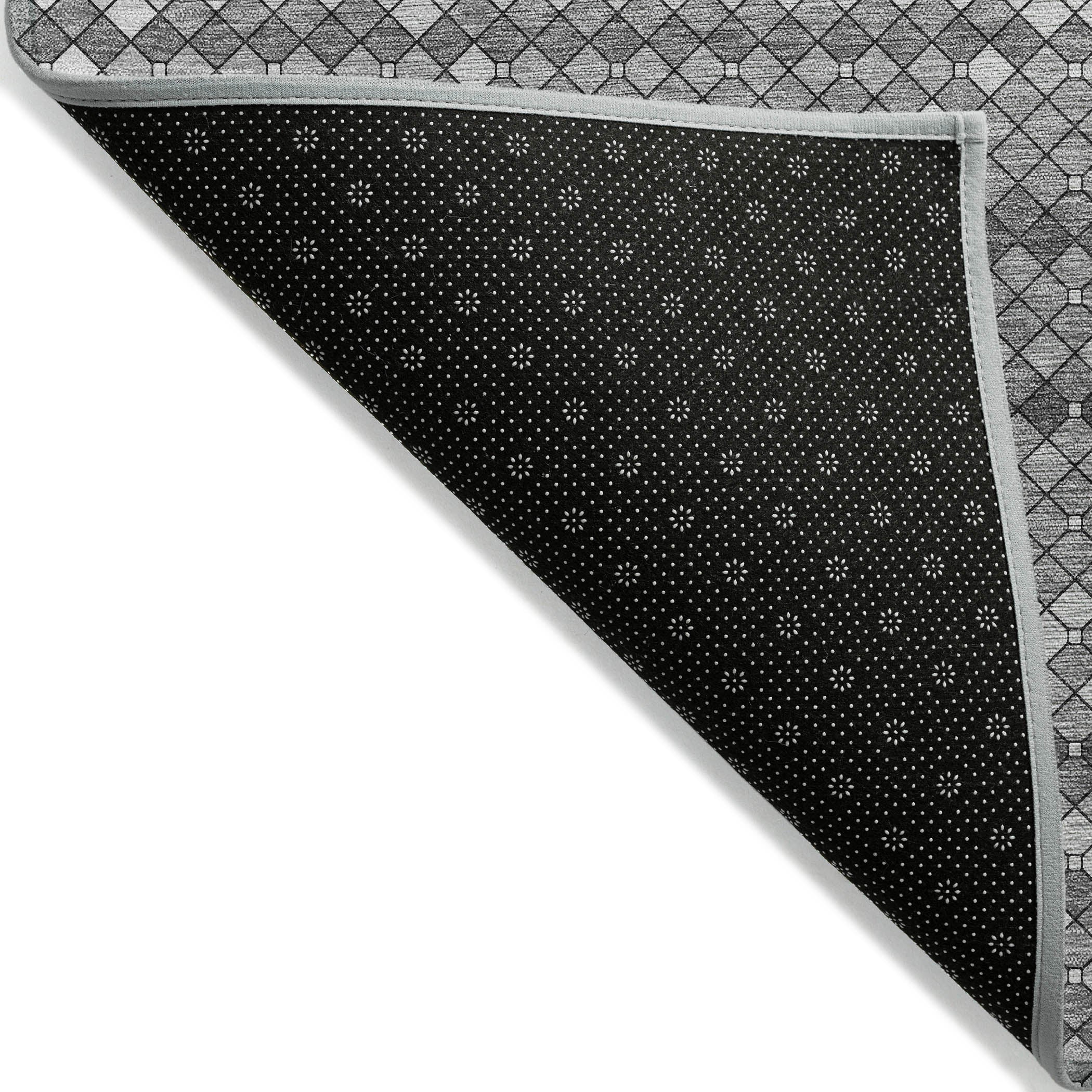 Elevate your decor with the chic lattice pattern with small diamond motifs in this transitional rug. The pattern adds a refined and modern touch to your space. UV stabilized for versatile use, it features an ultra-thin construction. This machine-washable rug is both family and pet-friendly, ensuring convenience and durability.