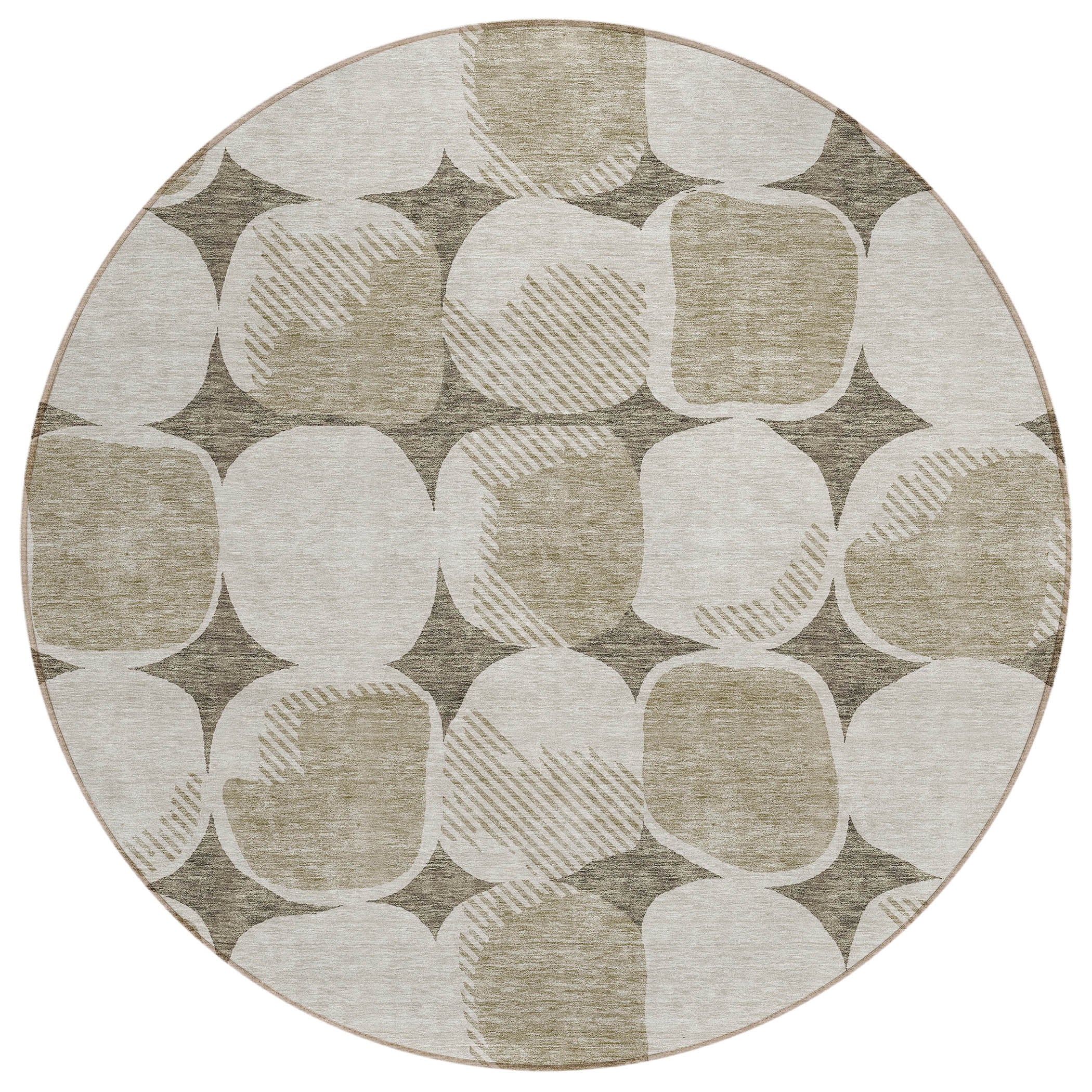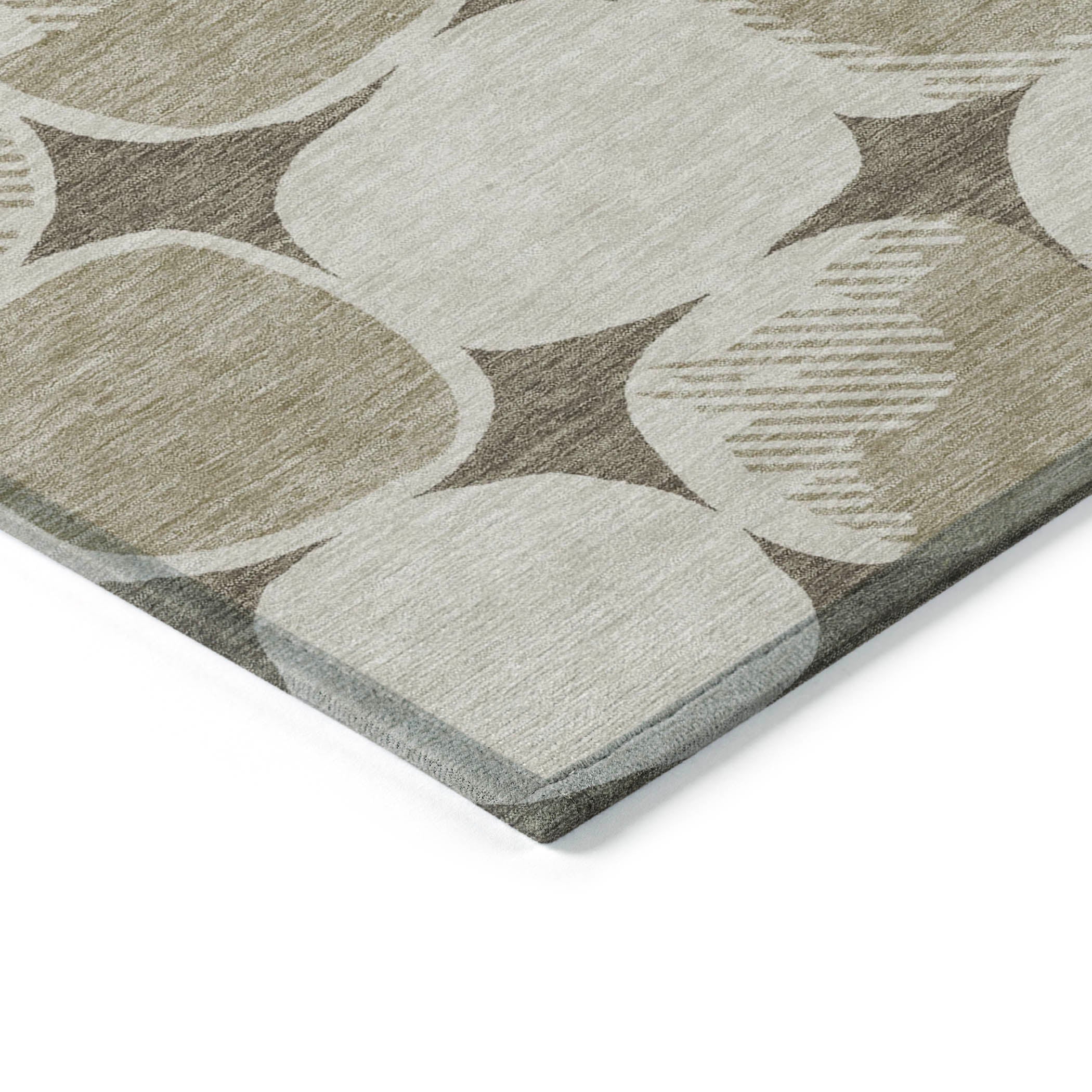 Elevate the ambiance of your home with the Chantille ACN870 Taupe area rug. Its unique design showcases large stone-shaped circles arranged in a seamless pattern, bringing a sense of harmony and transition to any room. The intricate circle motif adds a touch of sophisticated charm to your interior decor, creating a serene and elegant atmosphere.