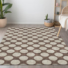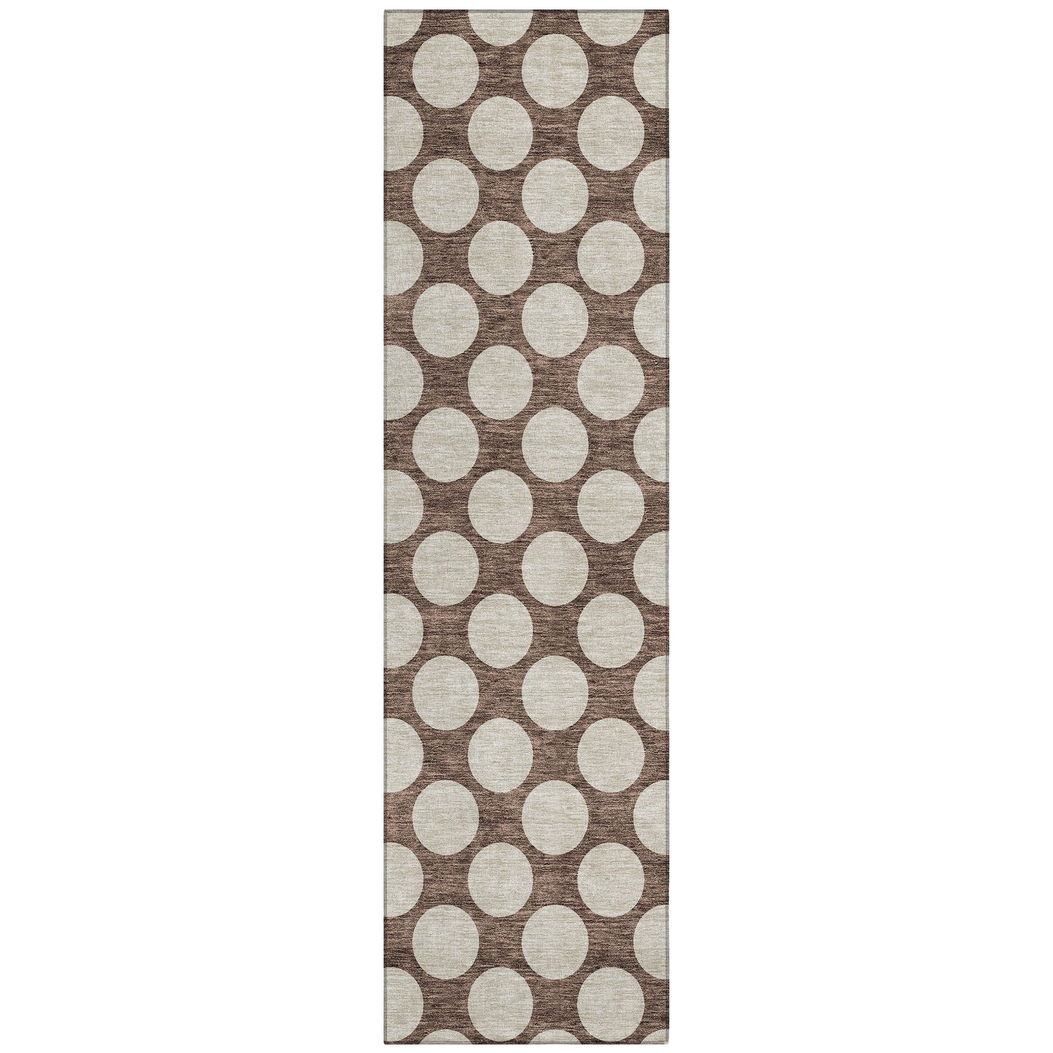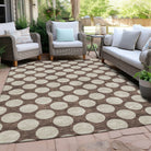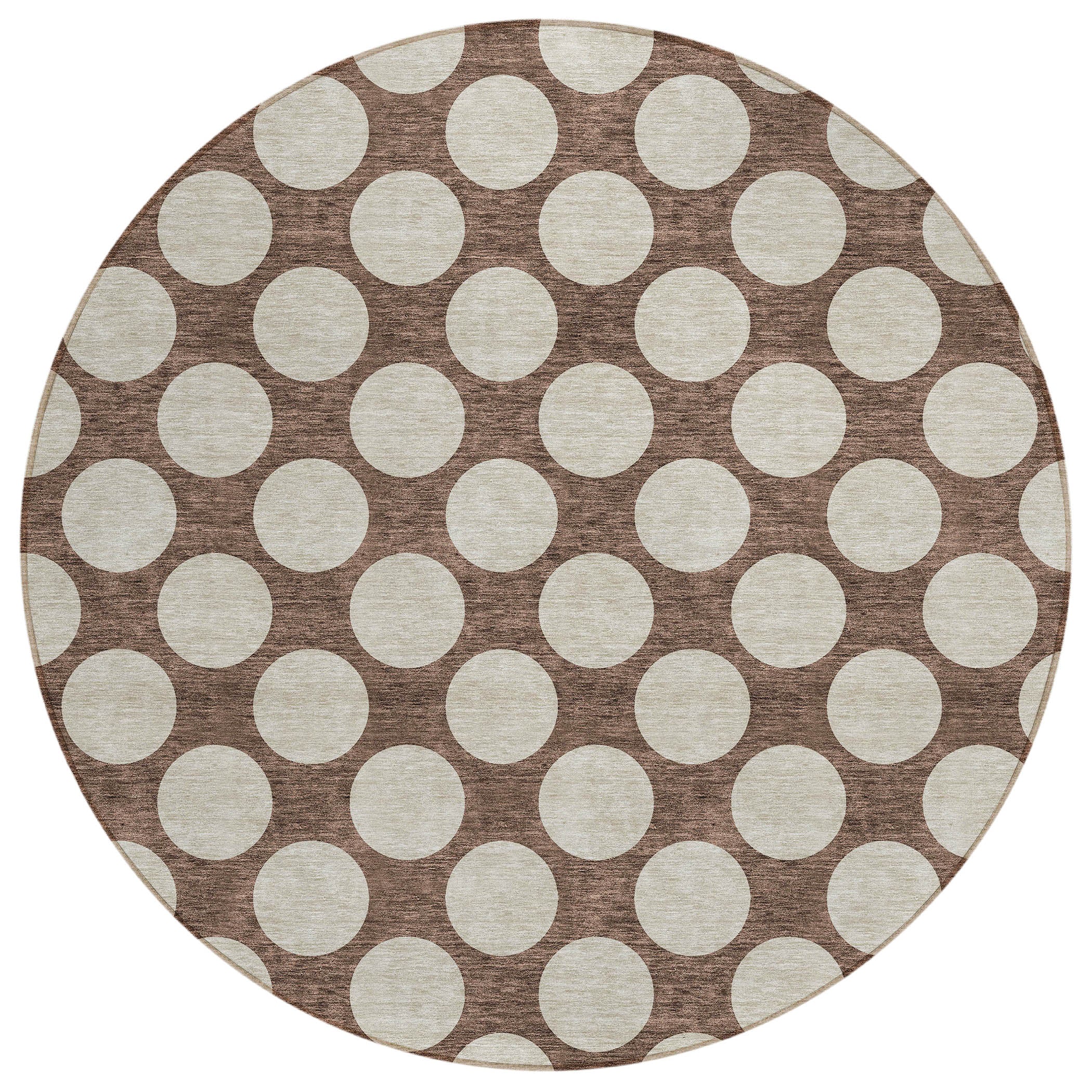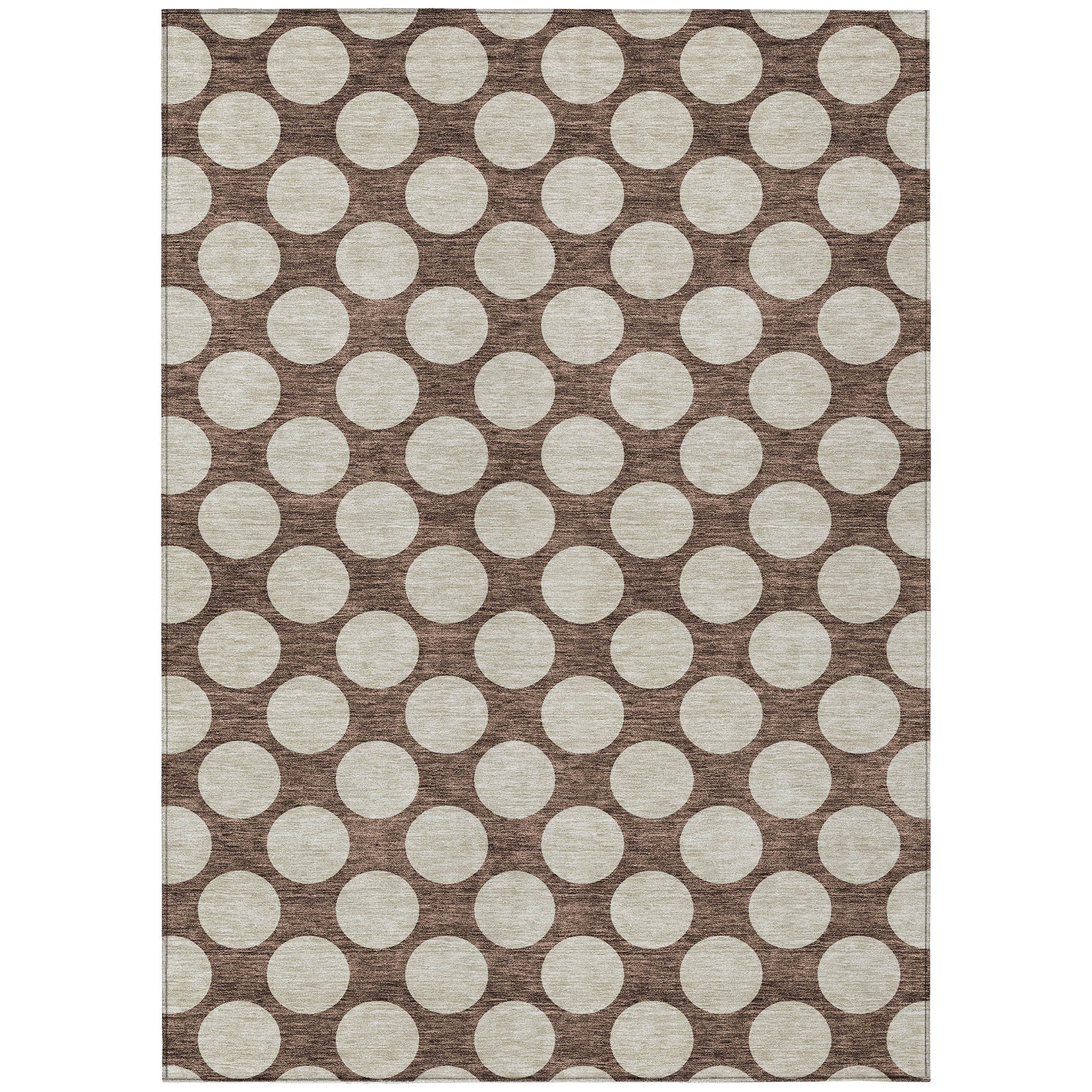 Chantille ACN921 Brown area rug, a stylish addition to any space. This rug features medium-sized circles forming a charming polka dot design, blending fun and sophistication seamlessly. Versatile for any setting, it is UV stabilized for both indoor and outdoor use, making it perfect for all areas of your home. The ultra-thin profile of this rug makes it ideal for high-traffic areas, while its machine-washable feature ensures easy maintenance, especially for households with pets and kids. Elevate your decor with this chic and practical rug that combines style and functionality effortlessly.