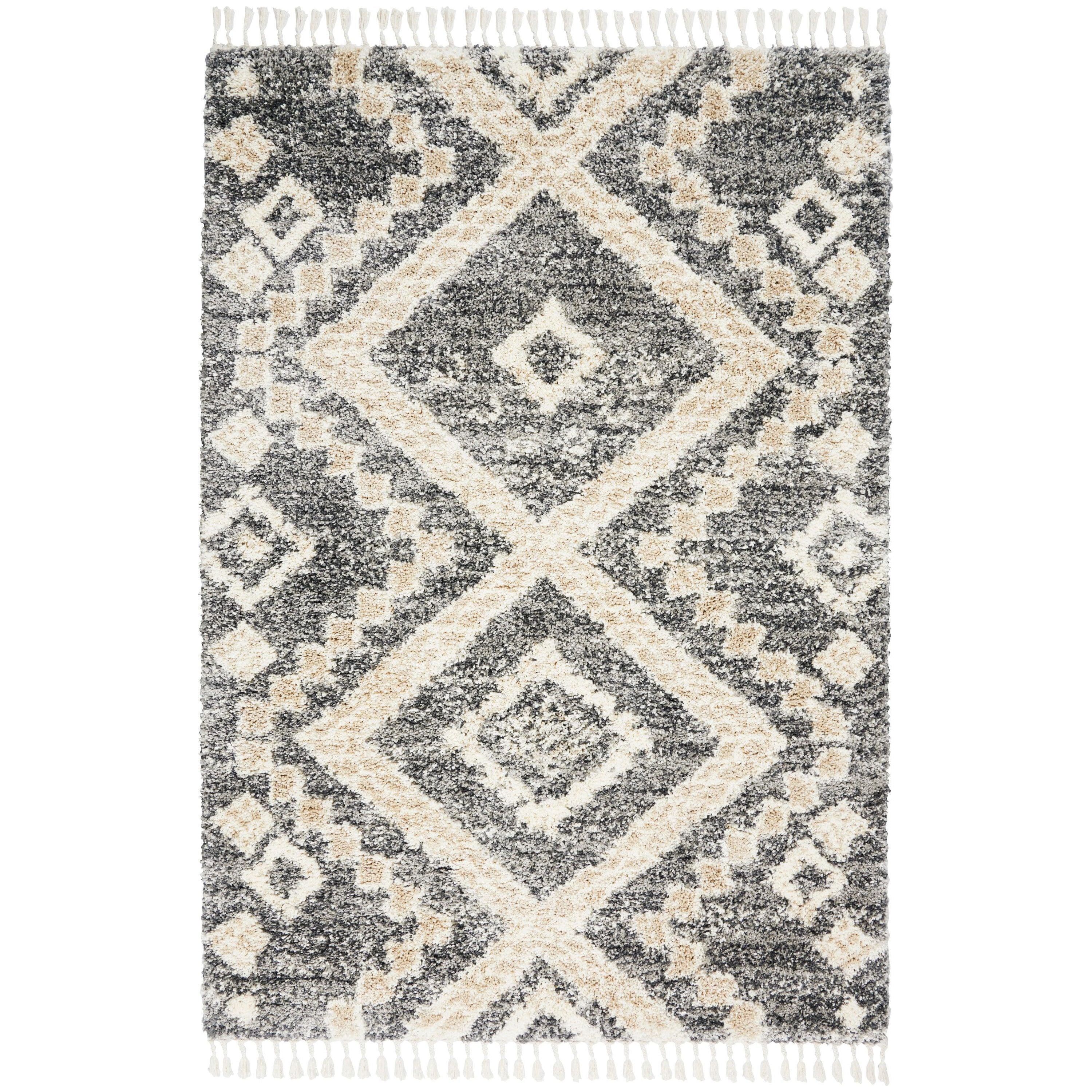 Oslo Shag OSL02 Grey Ivory rug from Nourison's Oslo Collection, inspired by Scandinavian design. These shag rugs boast a modern color palette and sleek lines that bring a touch of elegance to any room. Crafted with soft, durable fibers, these rugs are easy to maintain and have a charming twisted fringe for an authentic tribal vibe. The collection showcases intricate lattice and diamond patterns in tones of rich greys and calming neutrals, adding depth and sophistication to your decor.