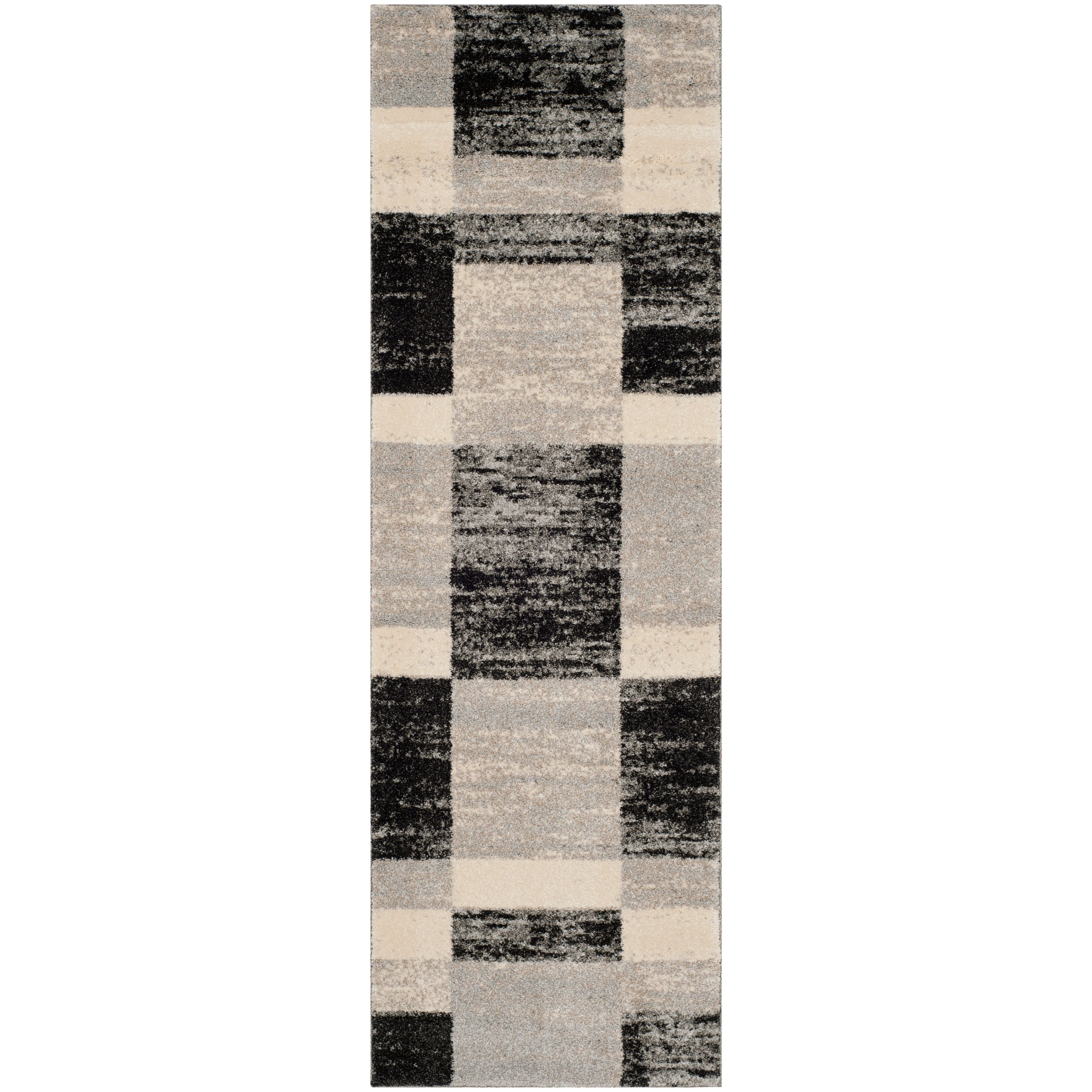 Retro RET2692 9079 by Safavieh, a trendy floor covering that pays homage to the Sixties era. This collection brings a fresh twist to mid-century modern style, making it the ideal match for sleek, clean-lined furniture. Featuring chic black and white designs that seamlessly transition into shades of gray, silver, and ivory, these rugs offer a variety of patterns inspired by Pollack's abstract art and modern graphics. Crafted in Turkey using 100% polypropylene, the Retro Shag rugs are machine-loomed to perfection with a low-pile construction for both beauty and easy maintenance.
