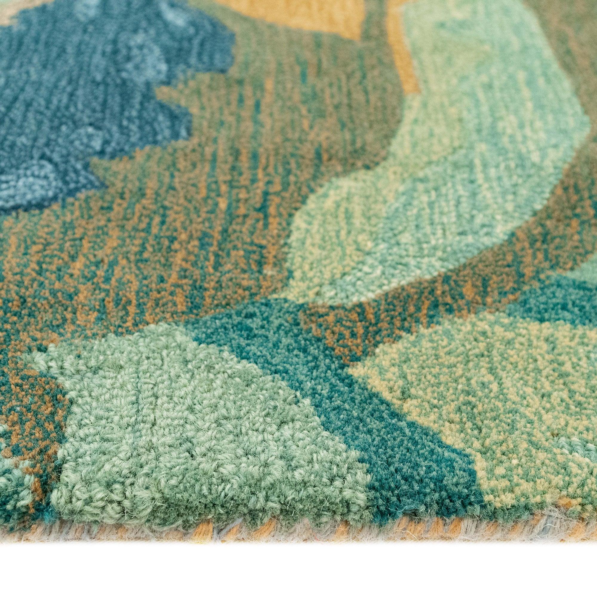 Corsica Panorama Blue, a stunning rug that effortlessly combines bold design with luxurious comfort. Crafted from 100% wool and expertly hand-tufted, this collection exudes elegance and durability. The unique cut and loop pile blend creates a visually captivating pattern that will enhance any room's decor.