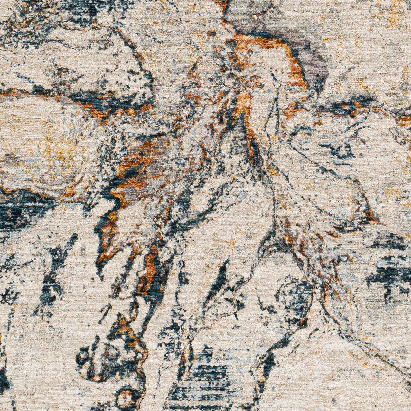 Detailed Colors: Teal, Burnt Orange, Saffron, Medium Gray, Beige, Cream
