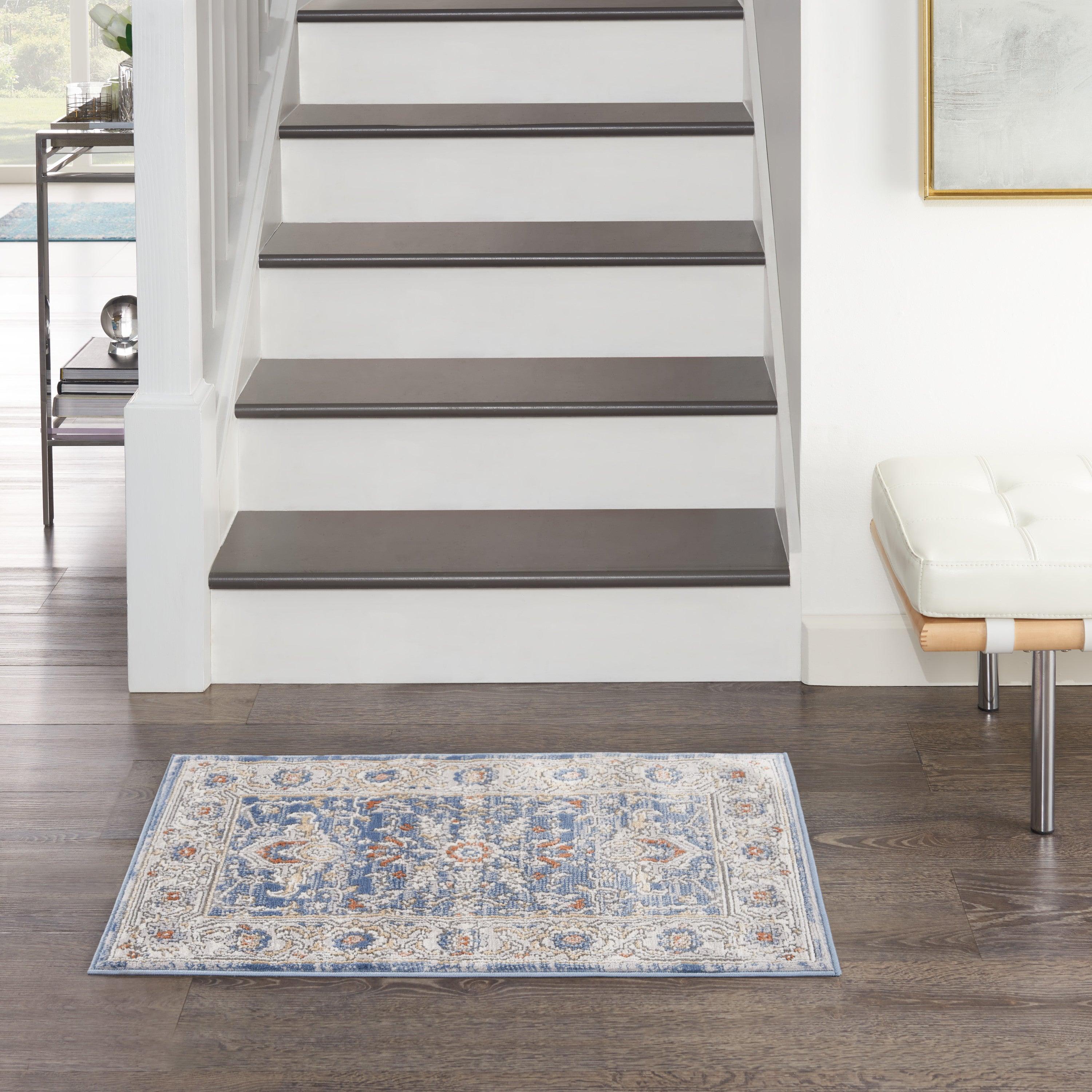 Series 4 SR402 Light Blue Grey rug from the Nicole Curtis Collection. Each piece in this collection adds a touch of unique charm to your space with classic Persian designs and an abrash color effect that mimics the appearance of a cherished antique. The low-profile construction of these vintage-inspired rugs is crafted from easy-clean fibers, ensuring both style and practicality in any room of your home.