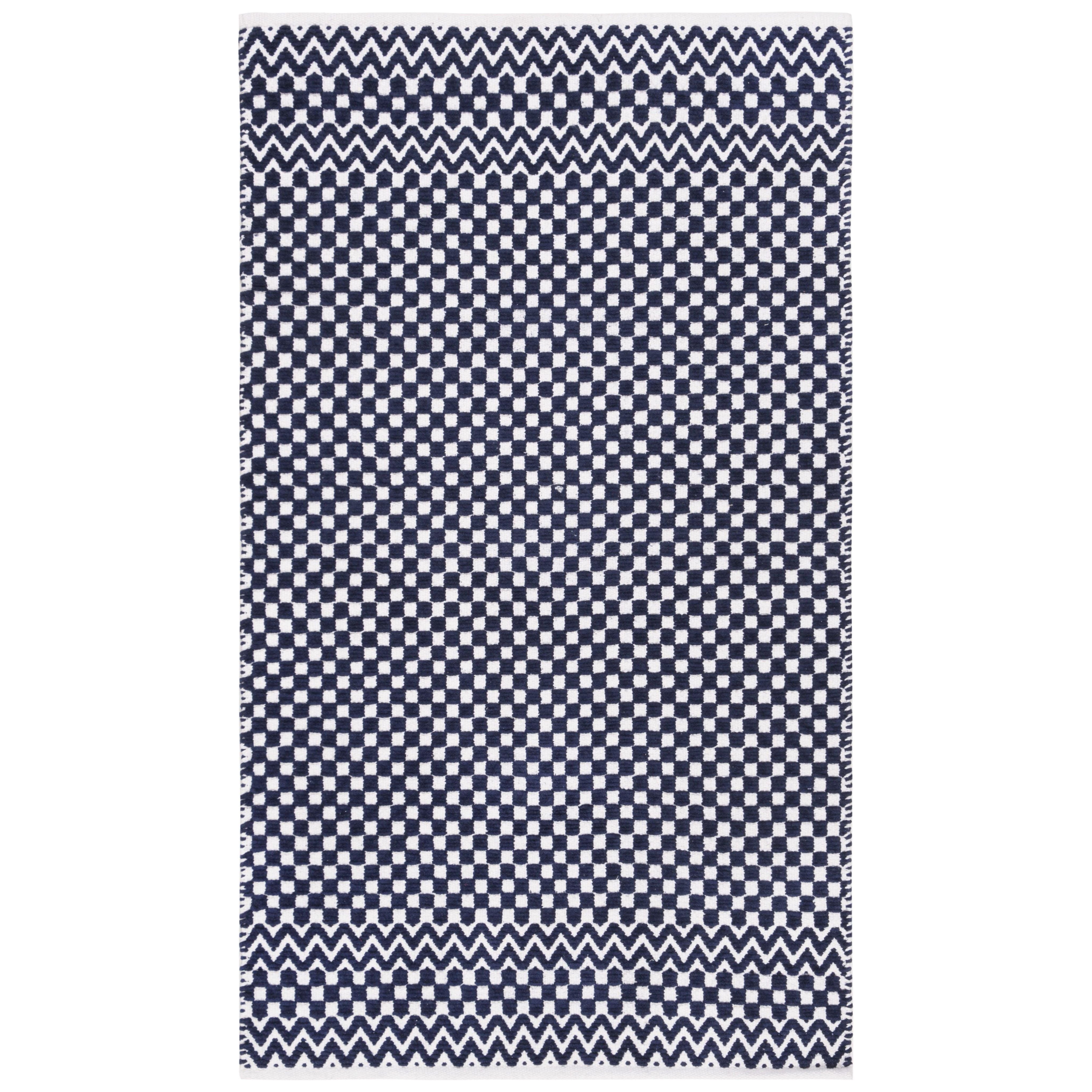 Boston BOS686N rug from the SAFAVIEH Boston Collection, a luxurious addition to any interior space. Crafted from 100% pure cotton, this hand-woven rug offers unparalleled softness and vivid color clarity. With its versatile design featuring geometric motifs and fashion-forward colors with creamy white accents, this rug effortlessly complements a range of decor styles from coastal to country and sophisticated suburban settings. Measuring approximately 0.5 inches in thickness, it provides comfort underfoot while adding visual interest to any room.