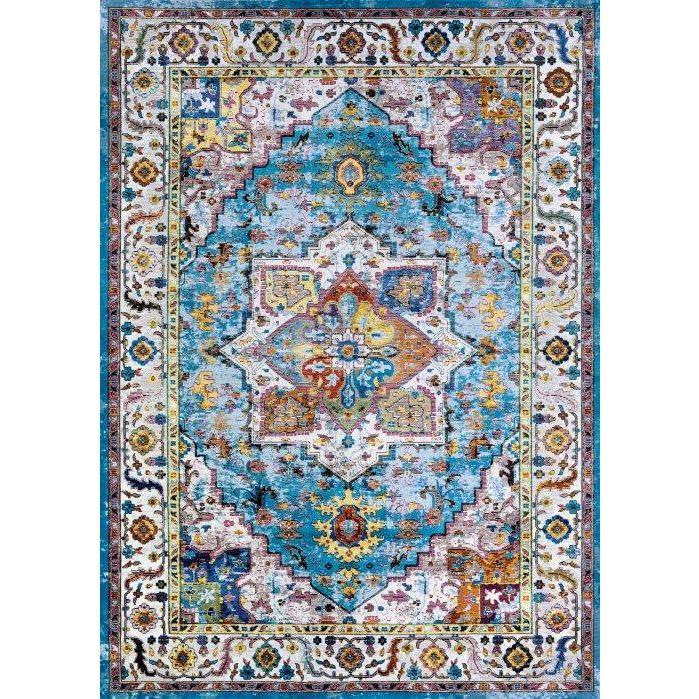 captivating Gypsy Ely Aqua Multi Ivory rug, a stunning addition to any space. Crafted with 100% Heat-Set Courtron Polypropylene™ material, this rug offers both durability and style. Its unique cross-woven design on Wilton looms creates a beautiful pattern that will enhance the ambiance of your room.