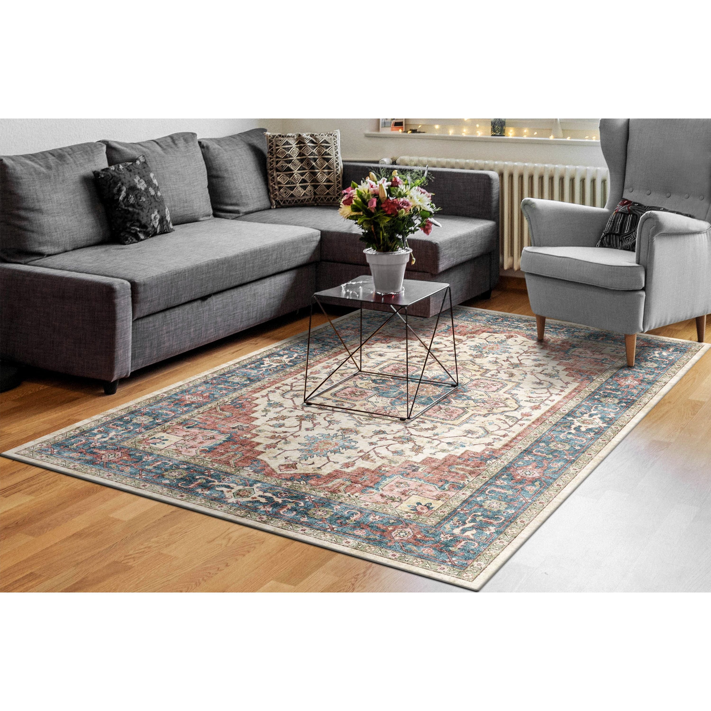 Elise 6302 Red Blue Beige rug, featuring digitally-printed distressed and rustic patterns for a modern twist on traditional designs. The earthy clay tones bring a touch of the outdoors into your home, creating an adventurous yet sophisticated ambiance. Southwestern-inspired motifs are trending in interior decor, making the Elise collection a stylish choice for any space.