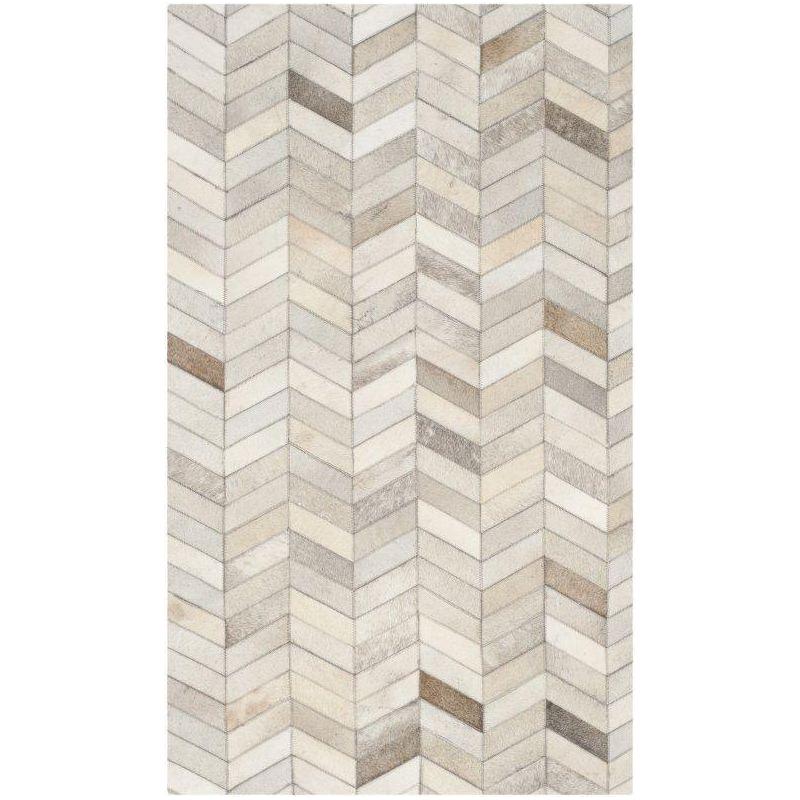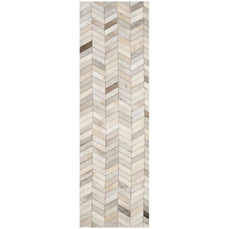 Studio Leather STL312A rug, a chic and tactile addition to your home decor. Made by Safavieh, these rugs are expertly crafted using premium cowhides and leather for a luxurious feel. The collection showcases a variety of designs, from traditional square patchwork patterns to modern styles with geometric cutouts appliqued onto the surface.