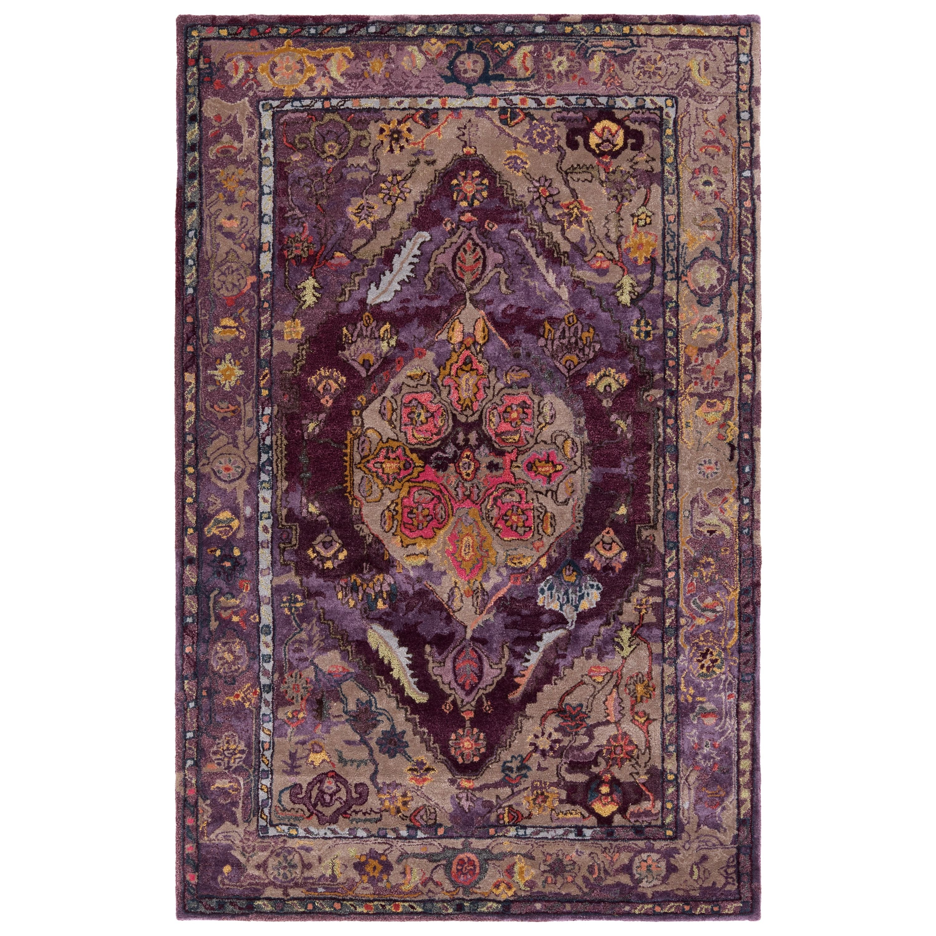 The Citrine collection is an assortment of distressed Old World patterns reinterpreted for modern design. The hand-tufted Raisa rug features an antiqued center medallion in stunning hues of purple, gray, red, white, taupe, and dark turquoise. Made of wool and viscose, this timeless rug boasts an ultra-soft feel and elegant sheen.