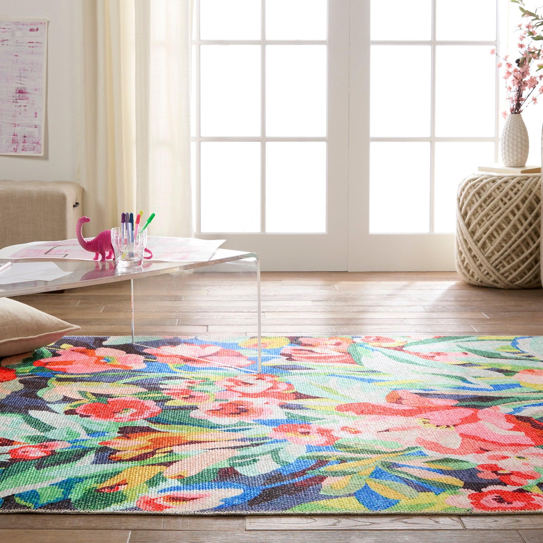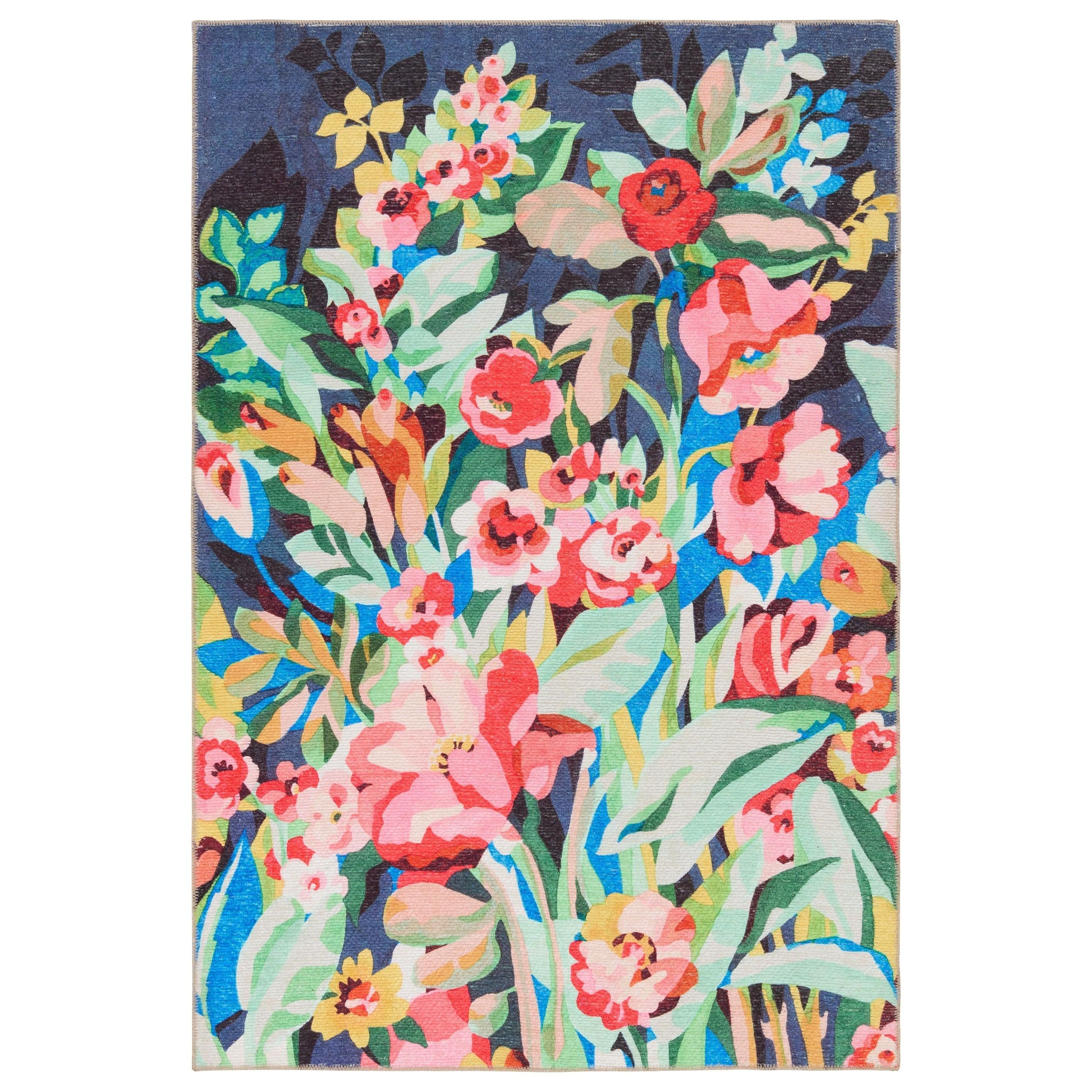 Ibis IBS01 Lavatera from the vibrant Ibis collection, designed to add a bold pop of color and pattern to any space, be it indoors or outdoors. Crafted from durable polyester, this rug boasts statement-making designs that are built to last. The Lavatera rug showcases a lively floral motif in striking shades of pink, green, yellow, gold, navy, mint, peach, and black.