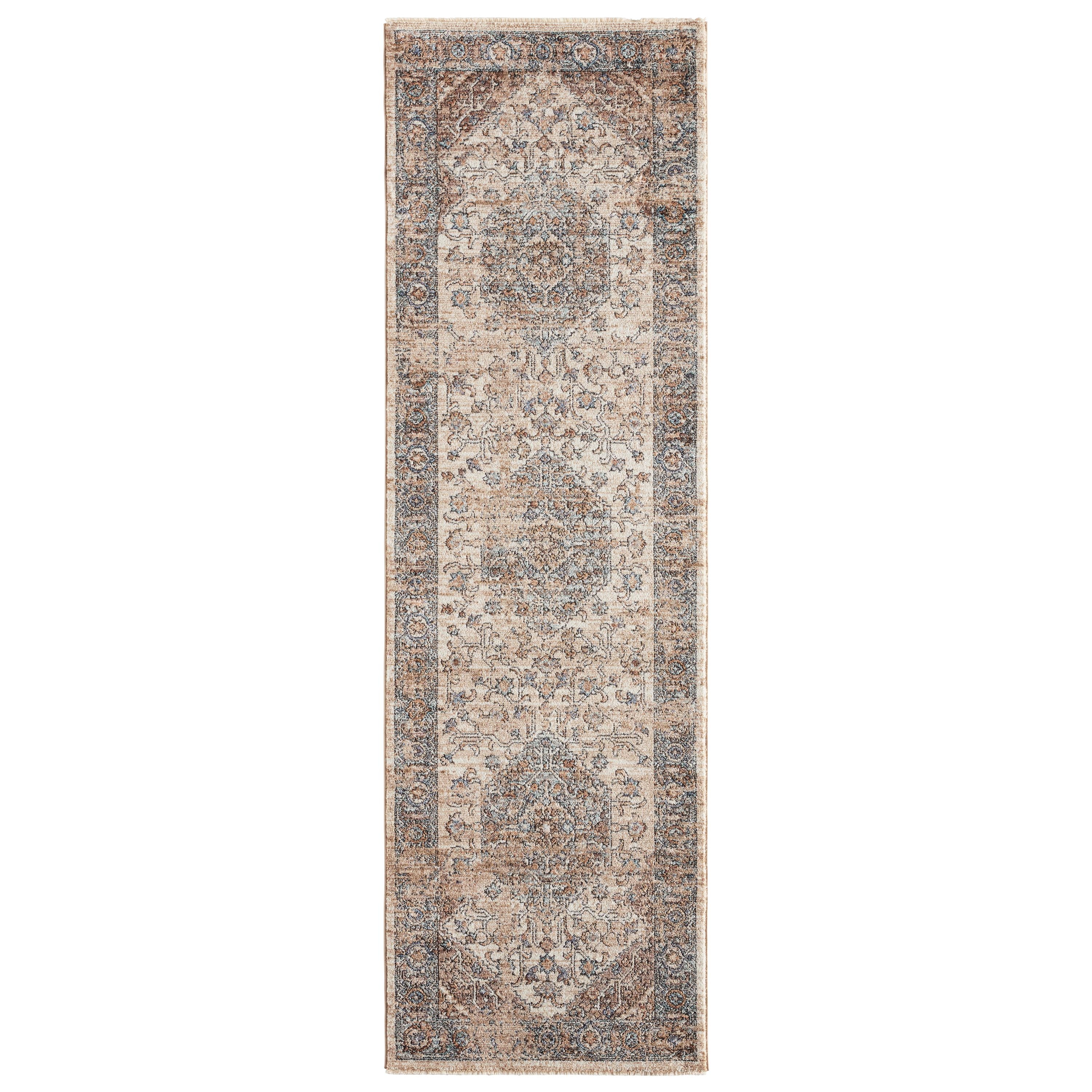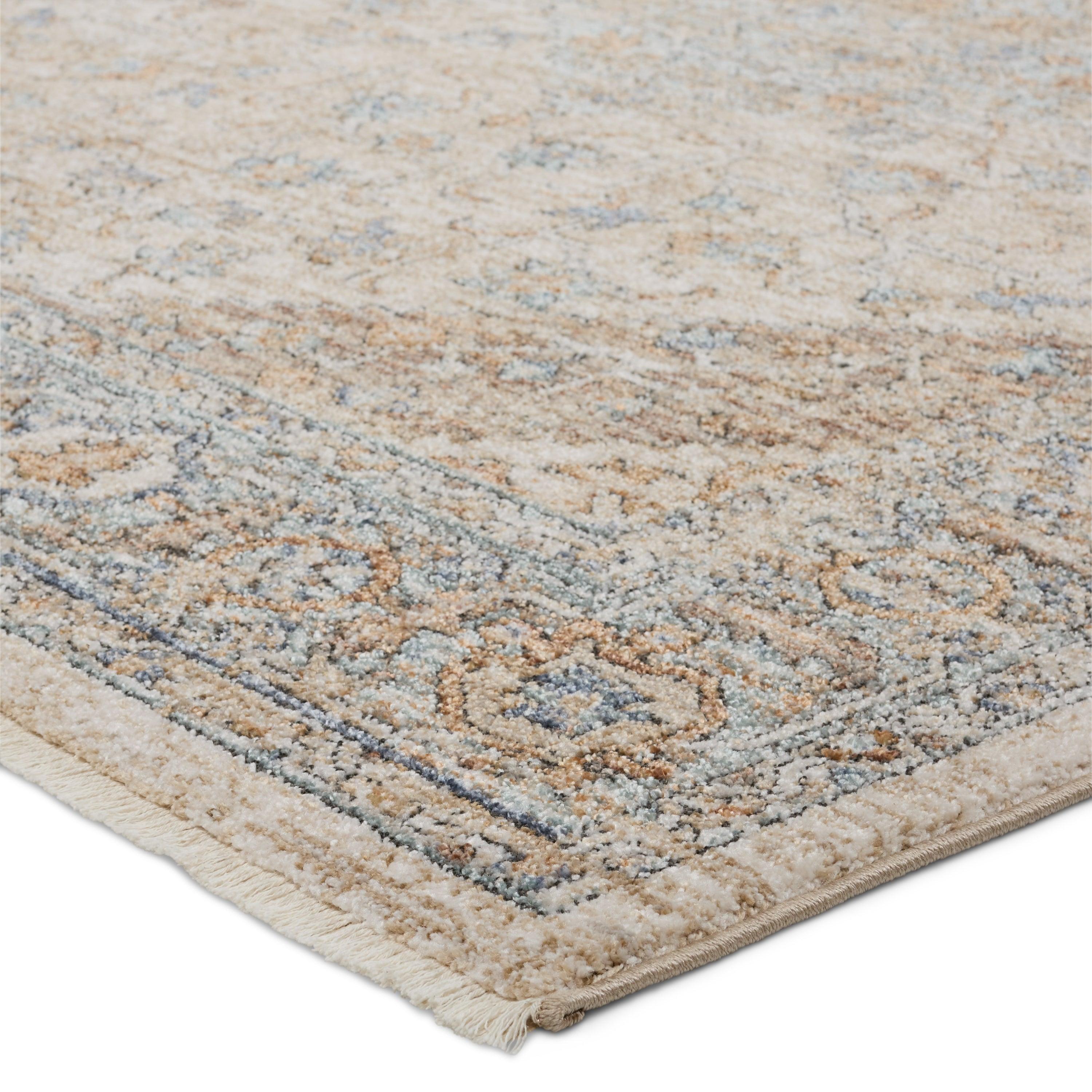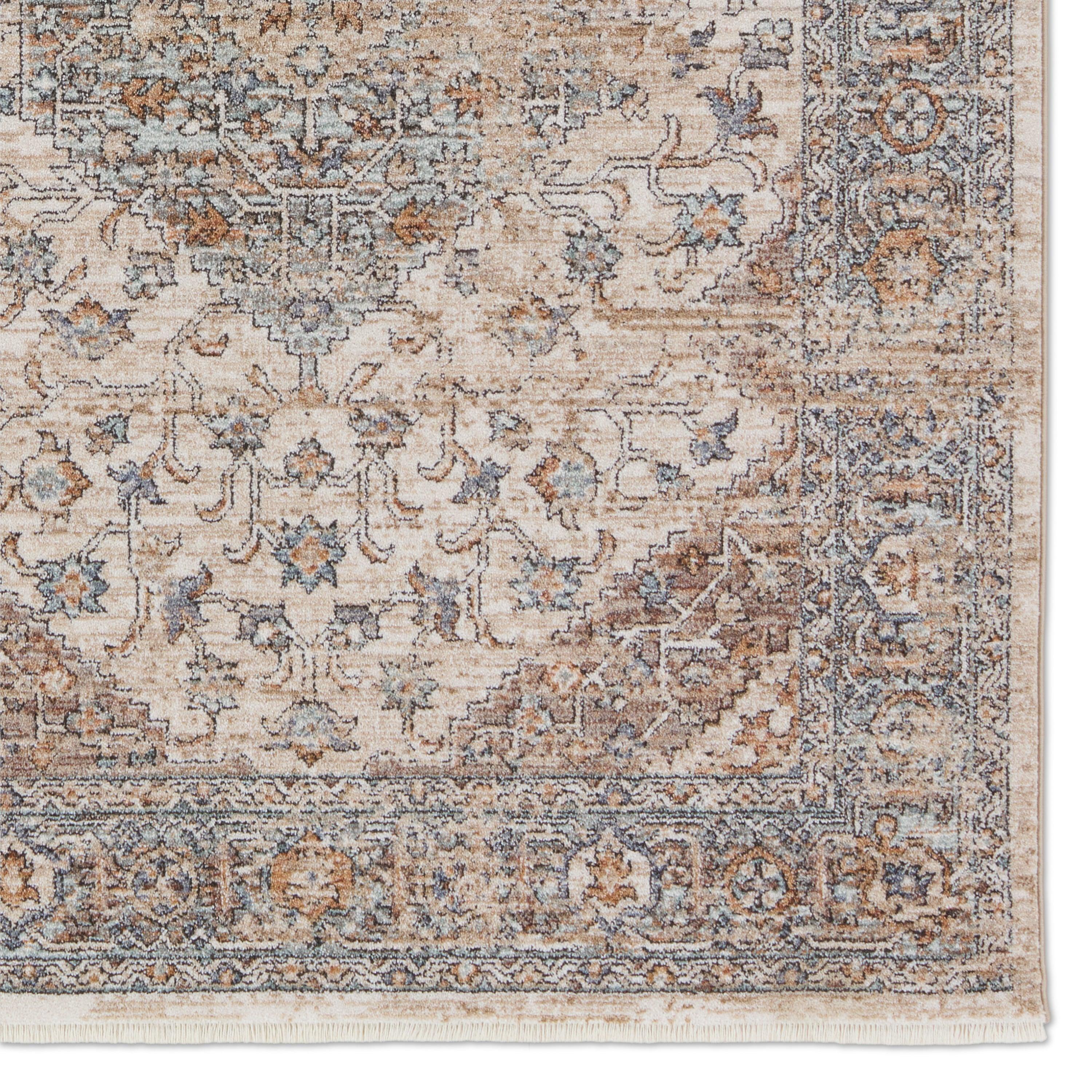 Inspired by the distressed perfection of antique textiles, the Lark collection is warm and inviting with rich, updated hues. The updated traditional Heir area rug showcases an intricate medallion and border design paired with short, cream fringe. The floral details spring to life in hues of beige, blue, cream, orange, light brown, and hints of gray. This indoor rug thrives in high and low trafficked areas of the home such as living rooms, halls, entryways, bedrooms, and dining areas.