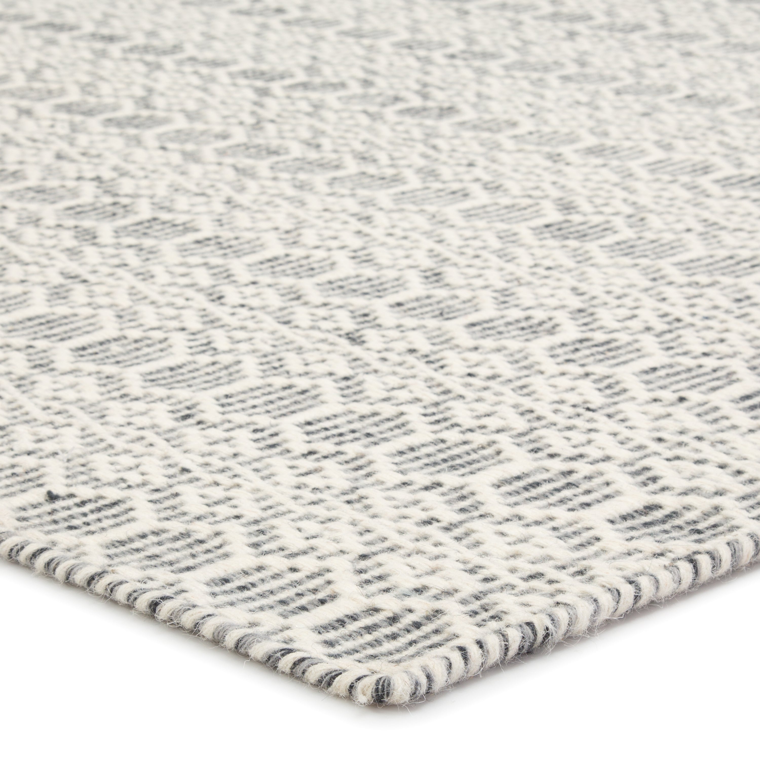 Enclave ENC01 Calliope - a stunning addition to any modern space. Crafted from 100% wool, this rug from the Enclave collection is all about intricate details and effortless style. The Calliope dhurrie rug features a charming geometric lattice design, showcasing honeycomb and diamond shapes in neutral ivory and gray tones.