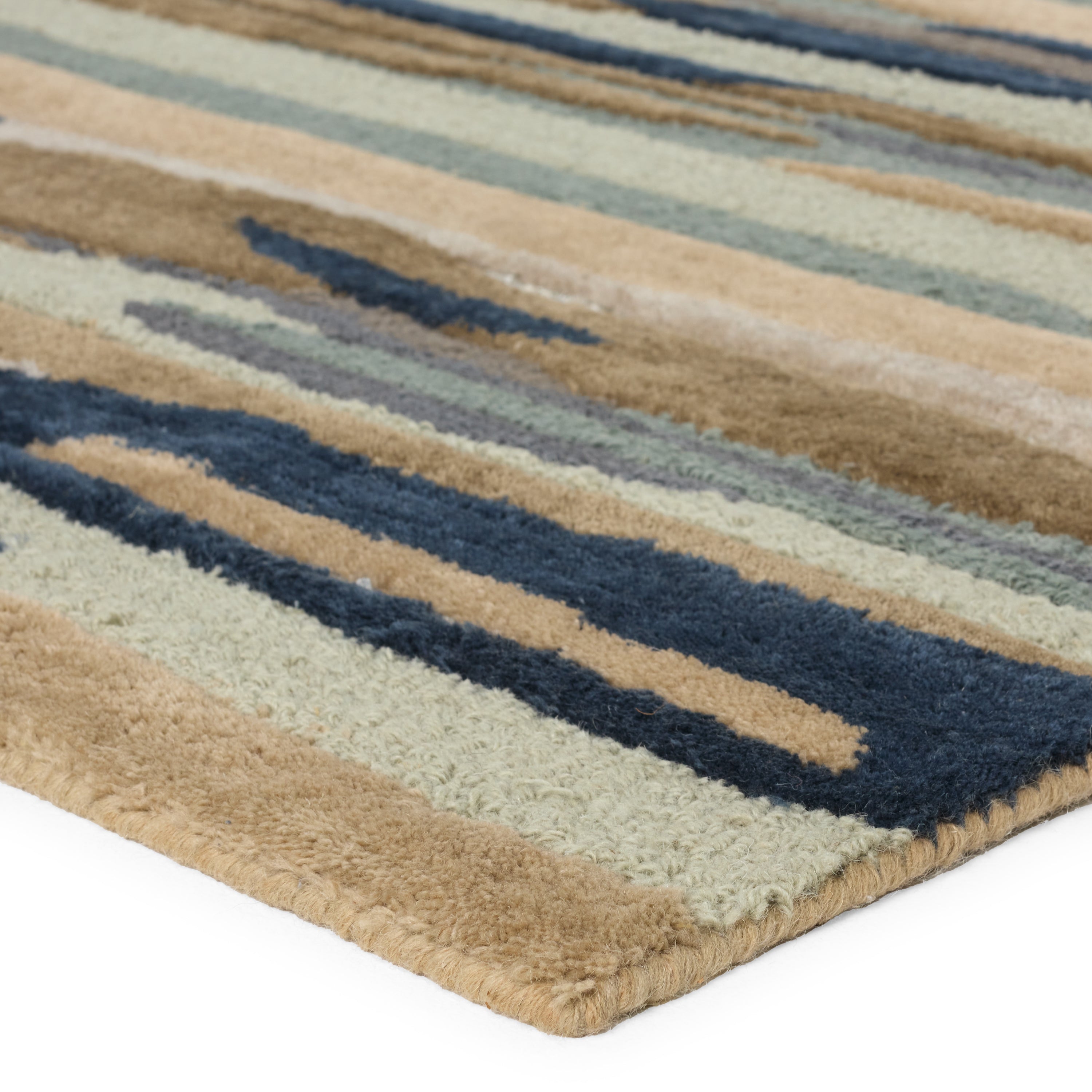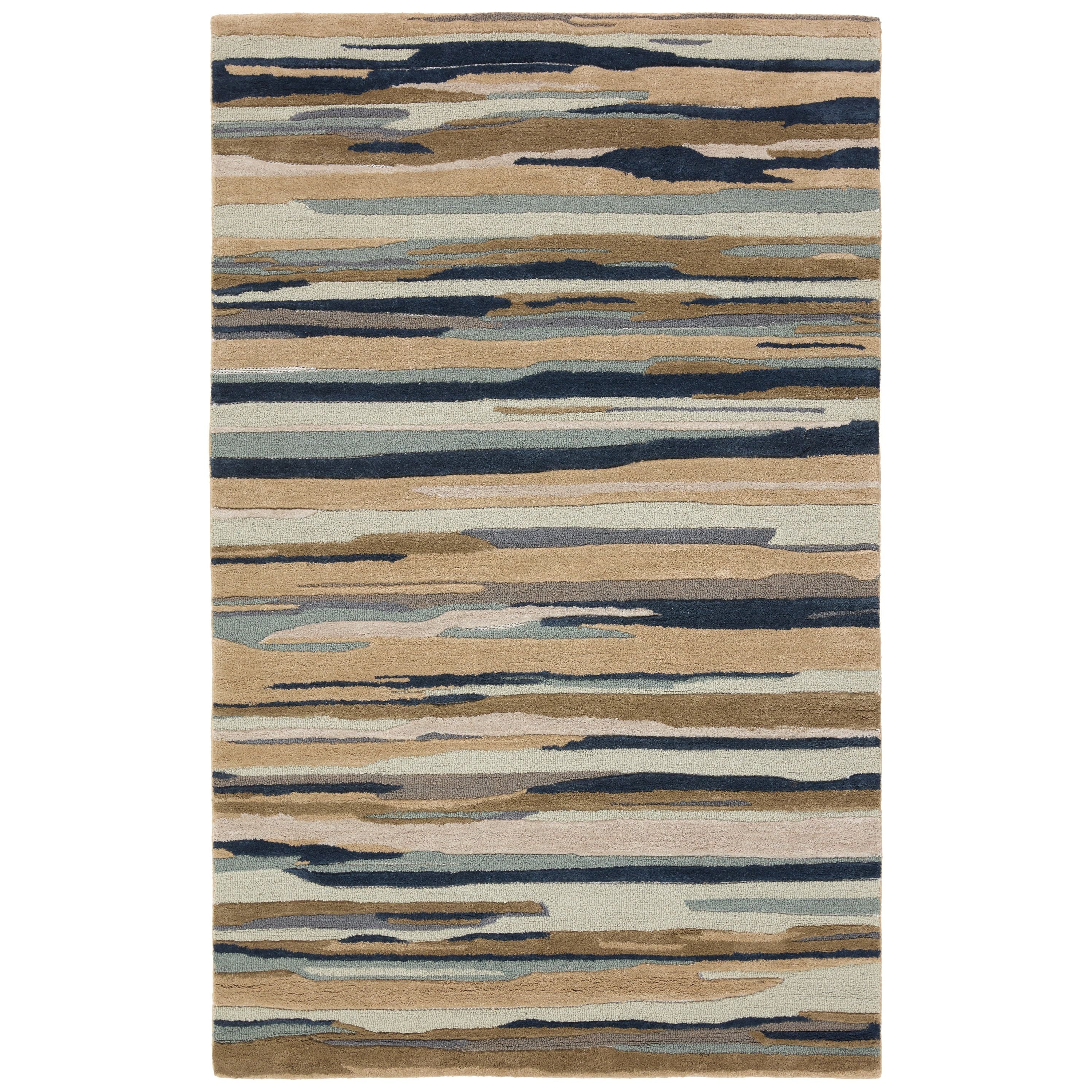 exquisite Fragment FRG05 Rhine rug from the hand-tufted Fragment collection. This stunning piece showcases nature and mineral-inspired motifs, adding a touch of patterned intrigue to contemporary spaces. The Rhine rug boasts a captivating linear abstract design in a calming color palette of slate blue, beige, gray, ivory, and taupe.