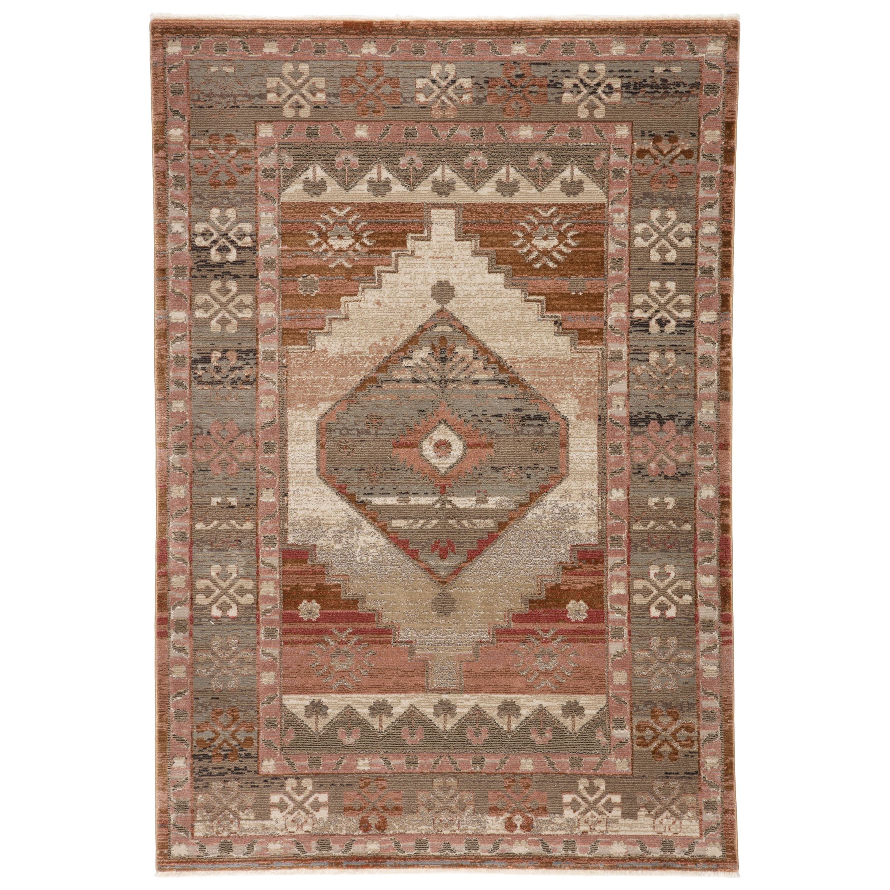 Myriad MYD09 Constanza rug, a stunning addition to your home decor. Inspired by the timeless beauty of sun-drenched Turkish patterns, this collection exudes warmth and charm with its faded yet rich color palette. The Constanza rug showcases a beautifully distressed tribal medallion in soft dusty pink, tan, and gray tones, accented by ivory fringe trim for a touch of elegance.