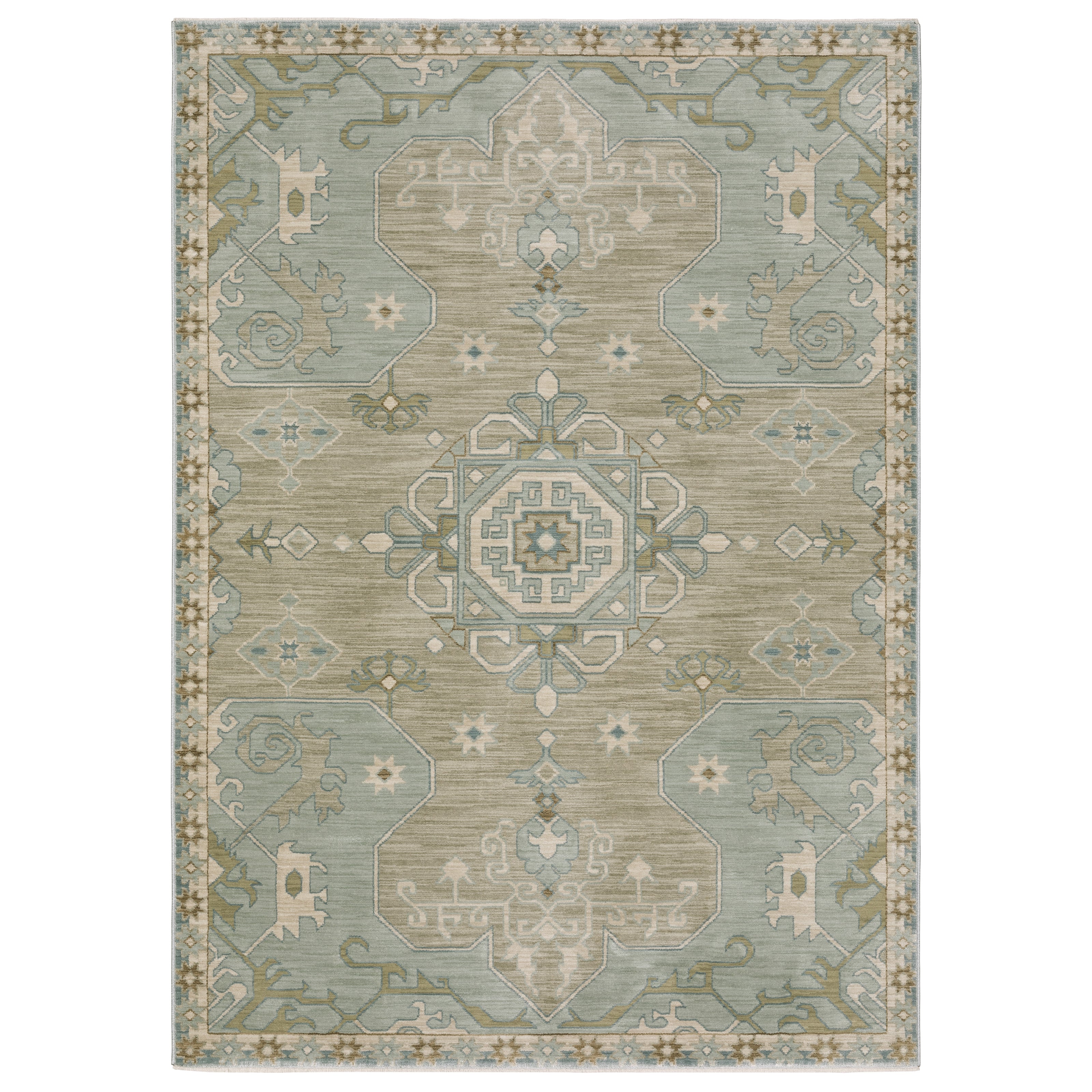 The Maeve collection features subtly pigmented color palette features neutral tones of ash brown, oat milk and sustained gray as well as mineral-based blues, matcha green, sunbaked clay and antique gold. The quietly modern color palette gives fresh appeal to traditional Persian and block print patterns with a touch of bohemian flair. It is power-loomed of super-soft, space-dyed polypropylene.