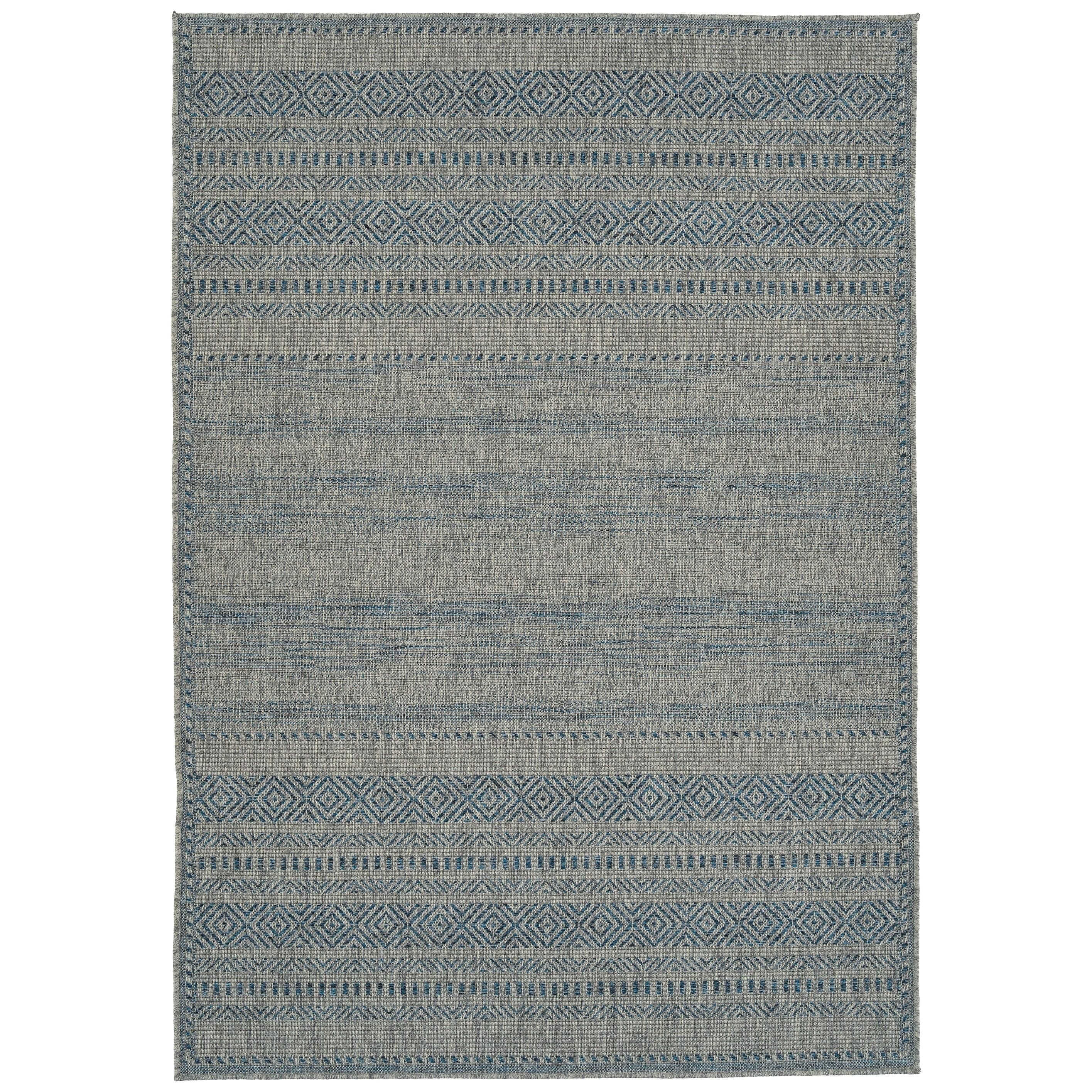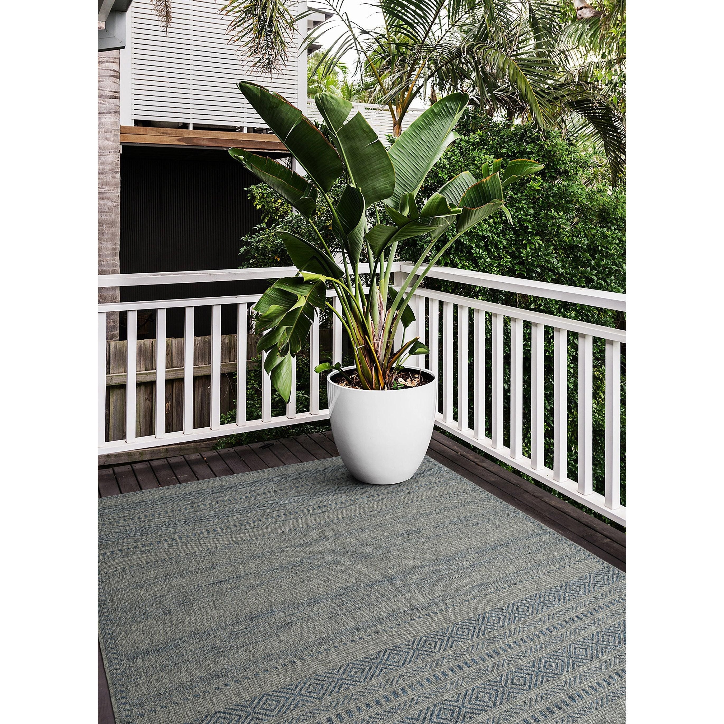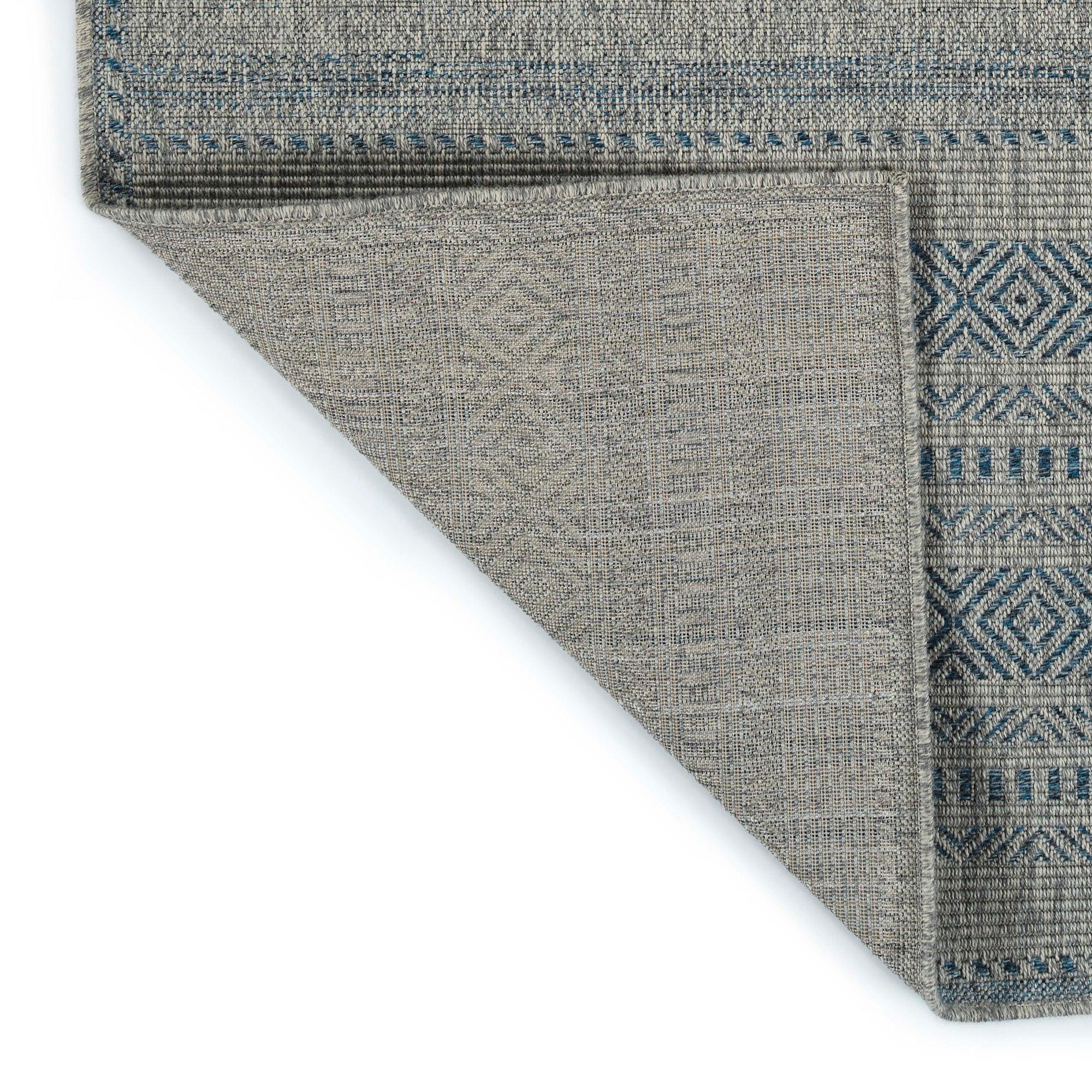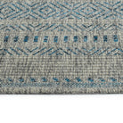 Bacalar BAC07 17 Blue Rug, a blend of windswept sophistication and allure inspired by ancient coastal cultures. This collection features intricate designs in warm greys, stony blacks, and sandy tans that evoke the earth's natural beauty. Crafted in Egypt using 100% Polypropylene, these rugs are made to enhance any outdoor space with durability and style.