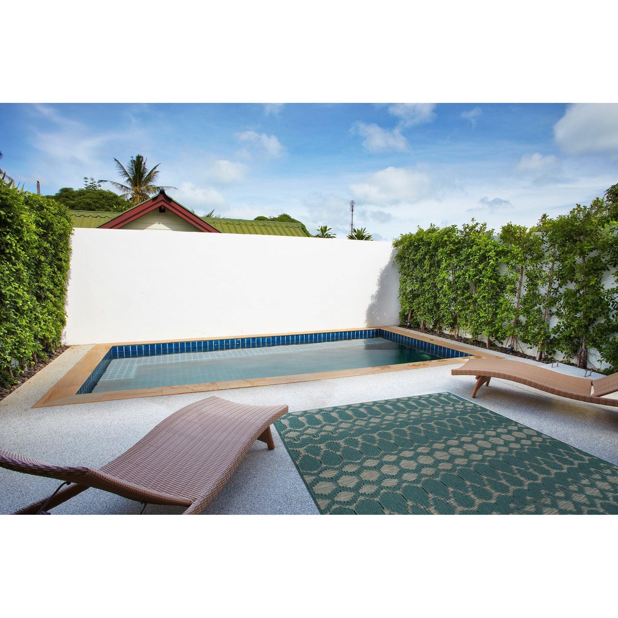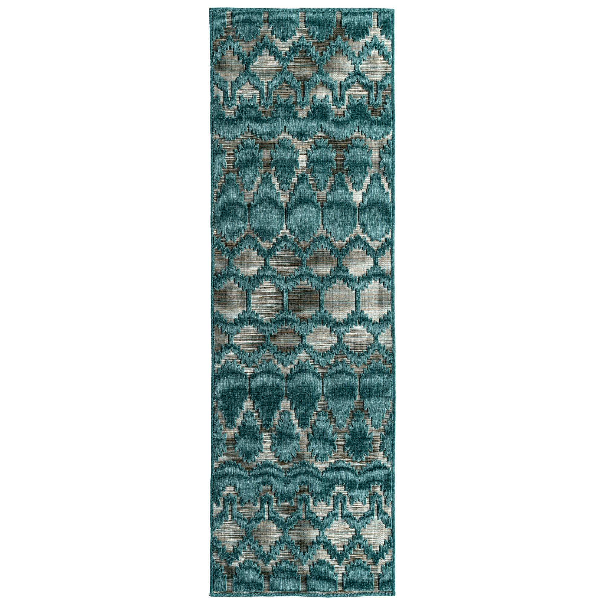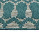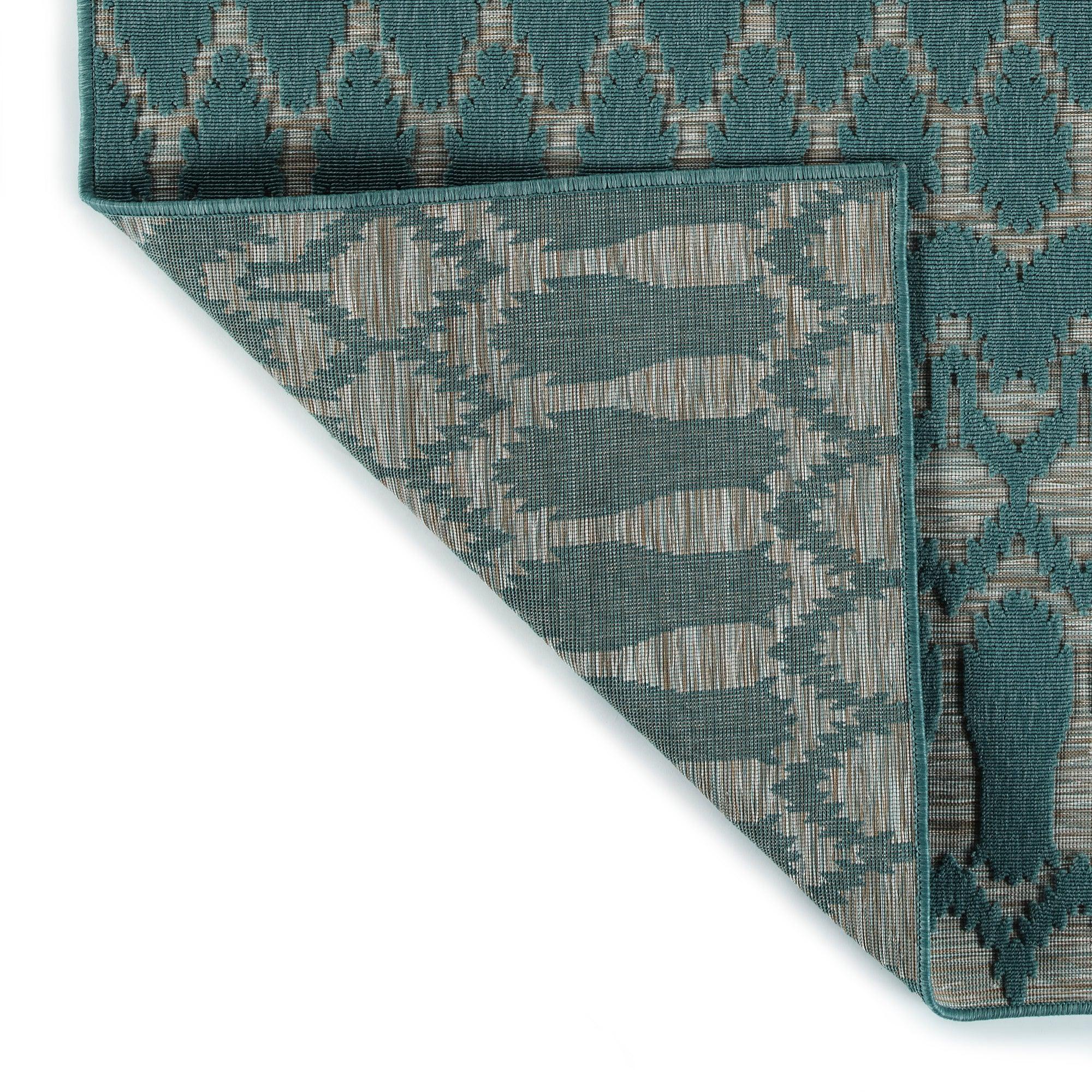 Cove COV03 91 Teal, a rug from the Cove collection that captures the essence of blue lagoons and sandy beaches in Tahiti. Its simple yet captivating geometric designs, available in a range of vibrant nature-inspired colors, bring a touch of the outdoors into your living space. Crafted in Turkey using 100% Polypropylene, this rug is designed to withstand outdoor elements while complementing any setting.