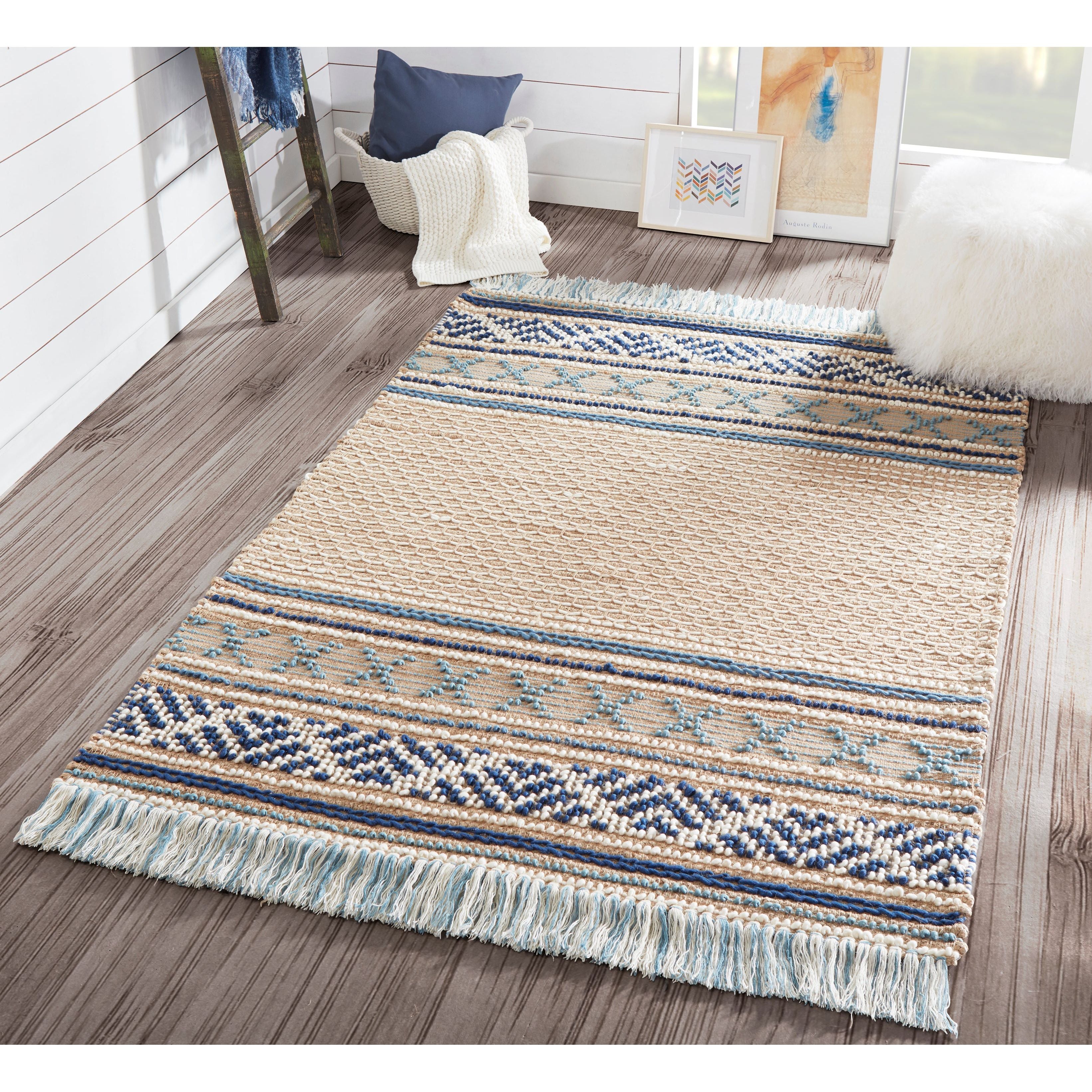 Esme Esm 4 Blue area rug, where humble materials blend effortlessly with a high-fashion aesthetic. This modern rug collection showcases a beautiful fusion of natural jute, cotton, and wool fibers, creating a tapestry of textural tribal designs and geometric motifs. Handwoven with intricate braided, loop, and threaded techniques, each rug is a finely crafted masterpiece. The addition of fringed embellishments adds a touch of relaxed elegance to the overall design.