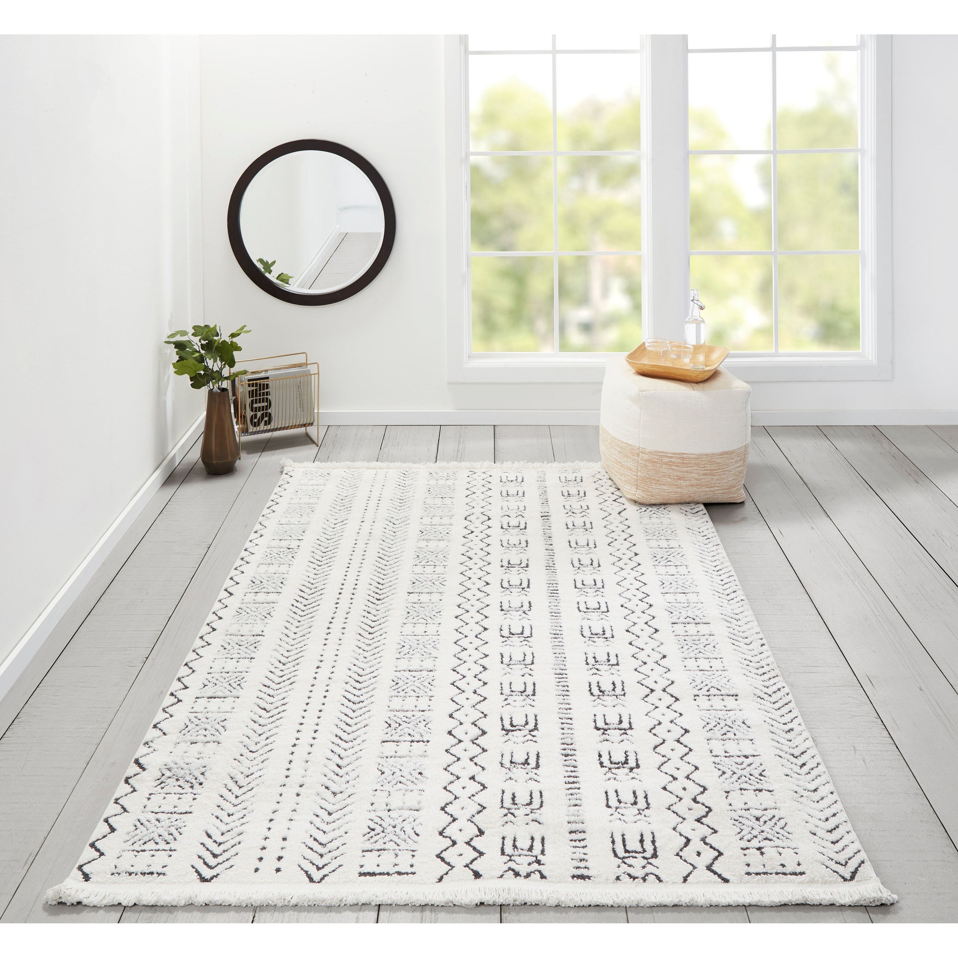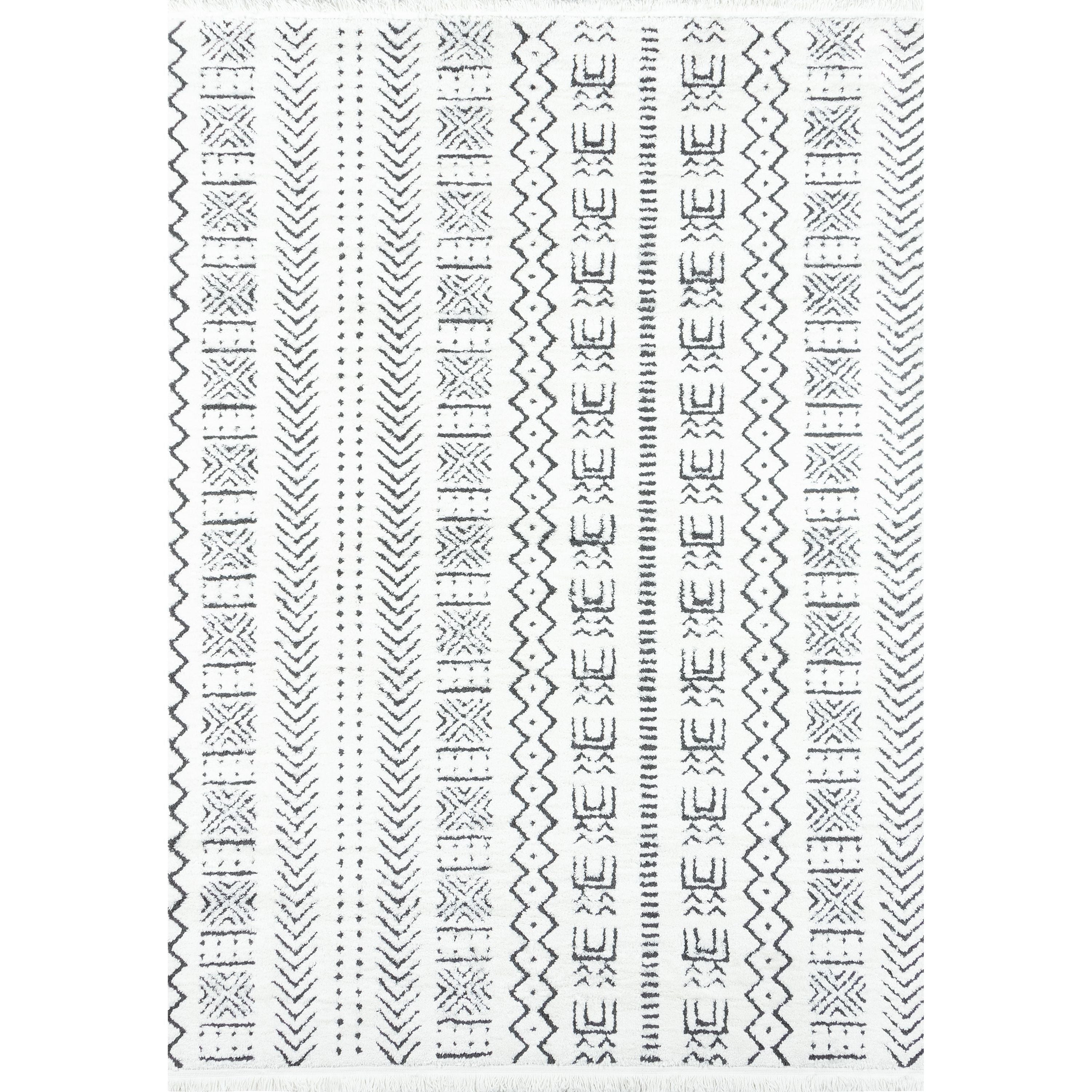 Ferris Frr 2 Ivory rug from Novogratz by Momeni, where symbols and simple geometric shapes take center stage. The Ferris Collection offers a versatile and modern design that can effortlessly complement any room in your home. Whether you have a busy household with kids and pets or simply want a durable option, this machine-made rug is up to the task. Its thick pile provides plush comfort underfoot, while the elegant fringe adds a touch of sophistication without breaking the bank.