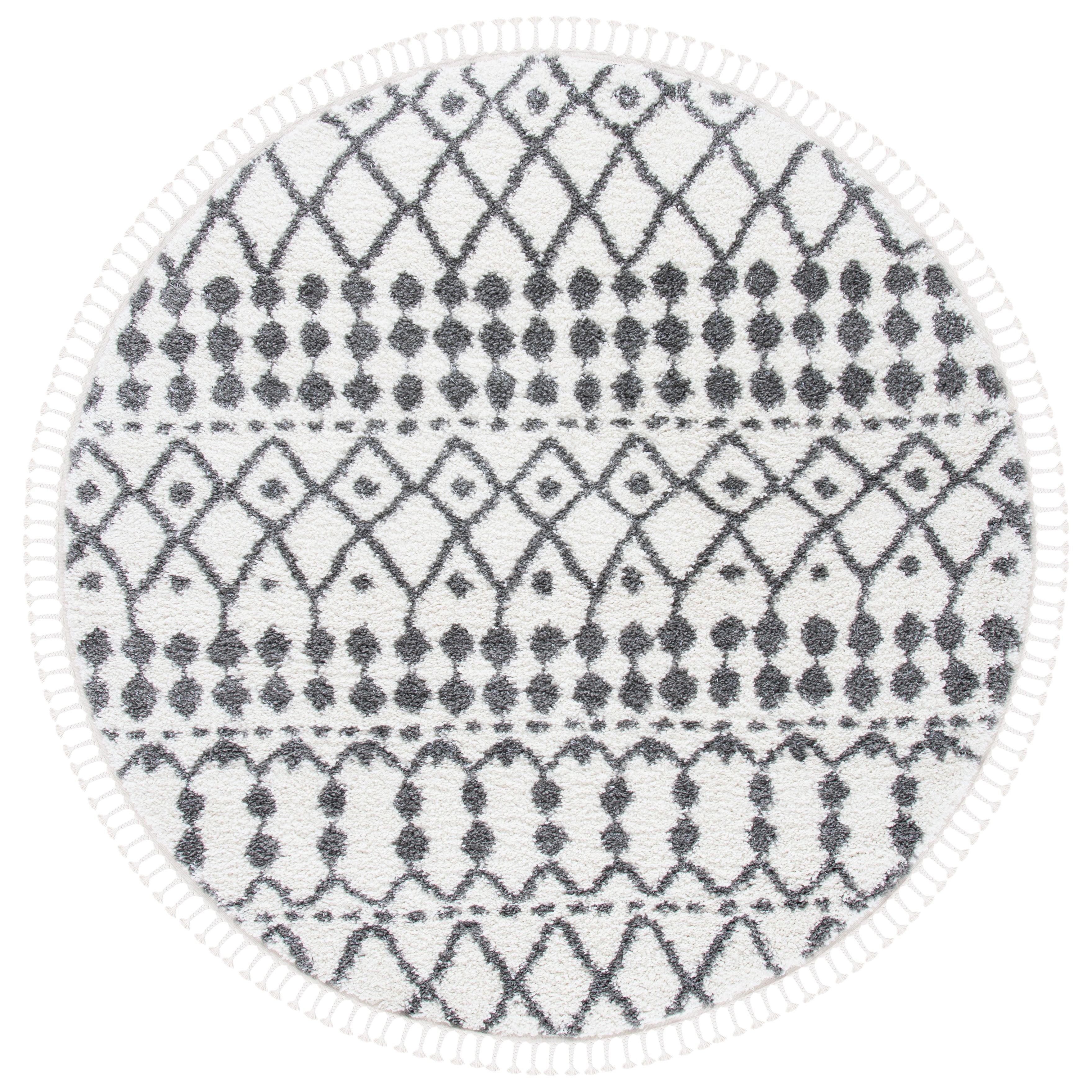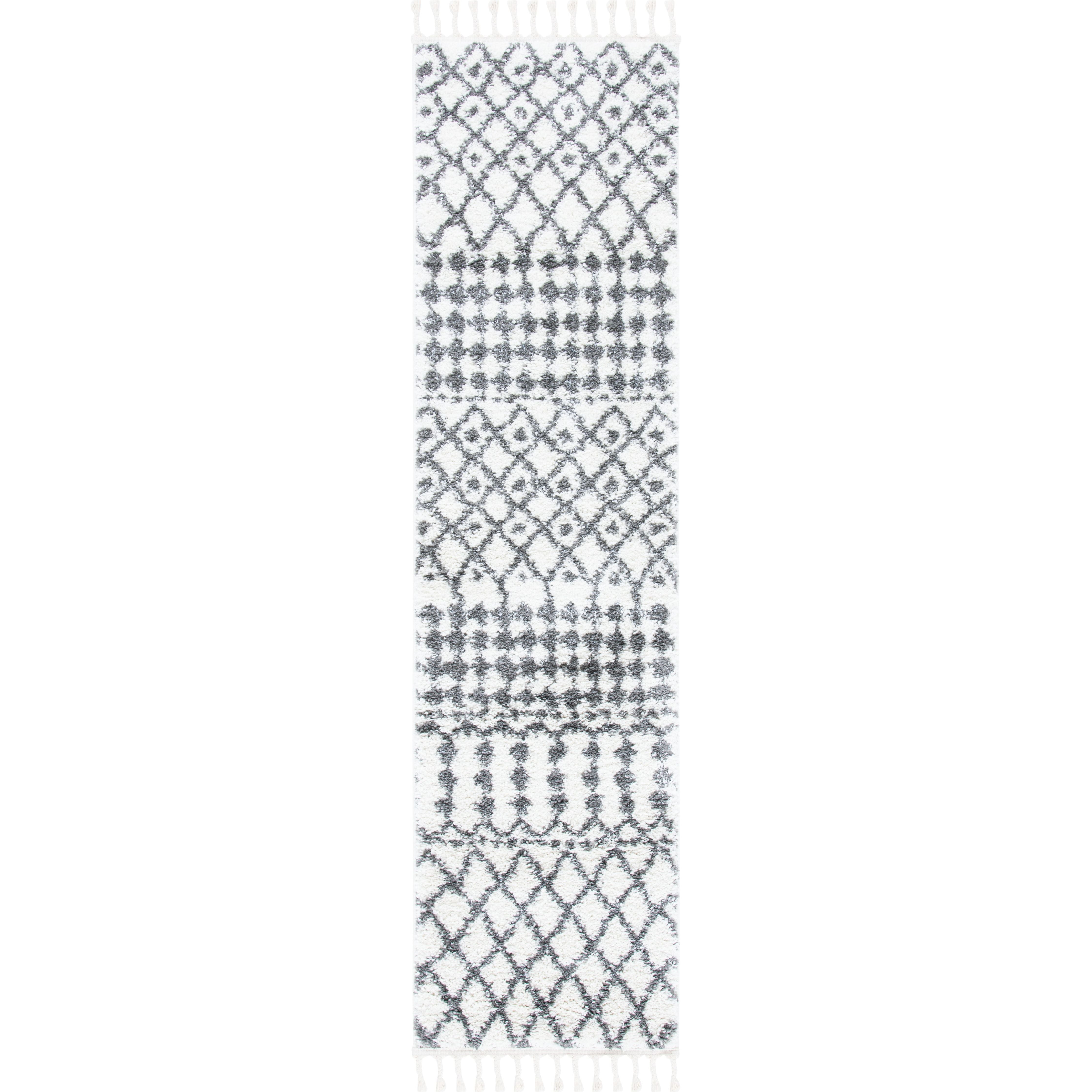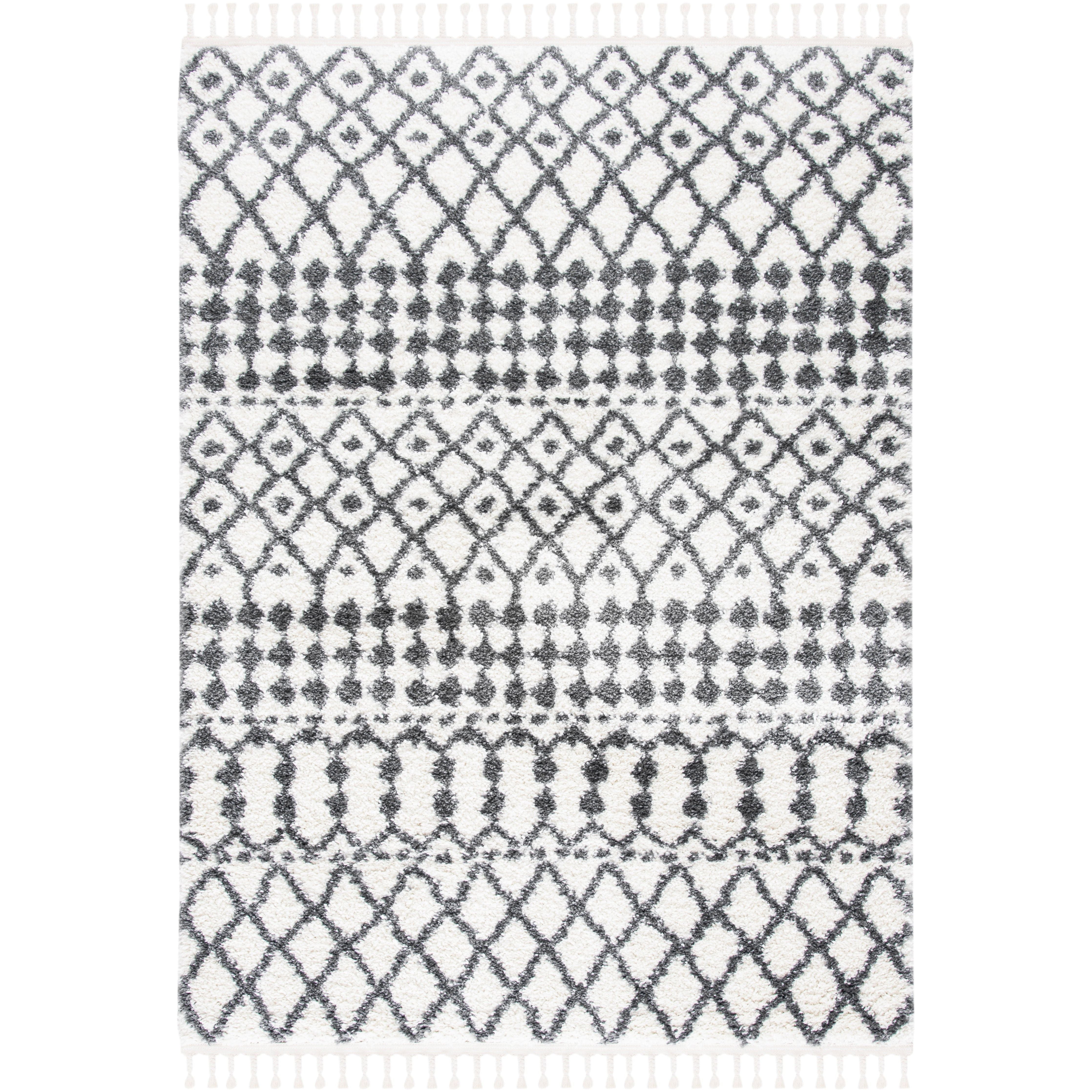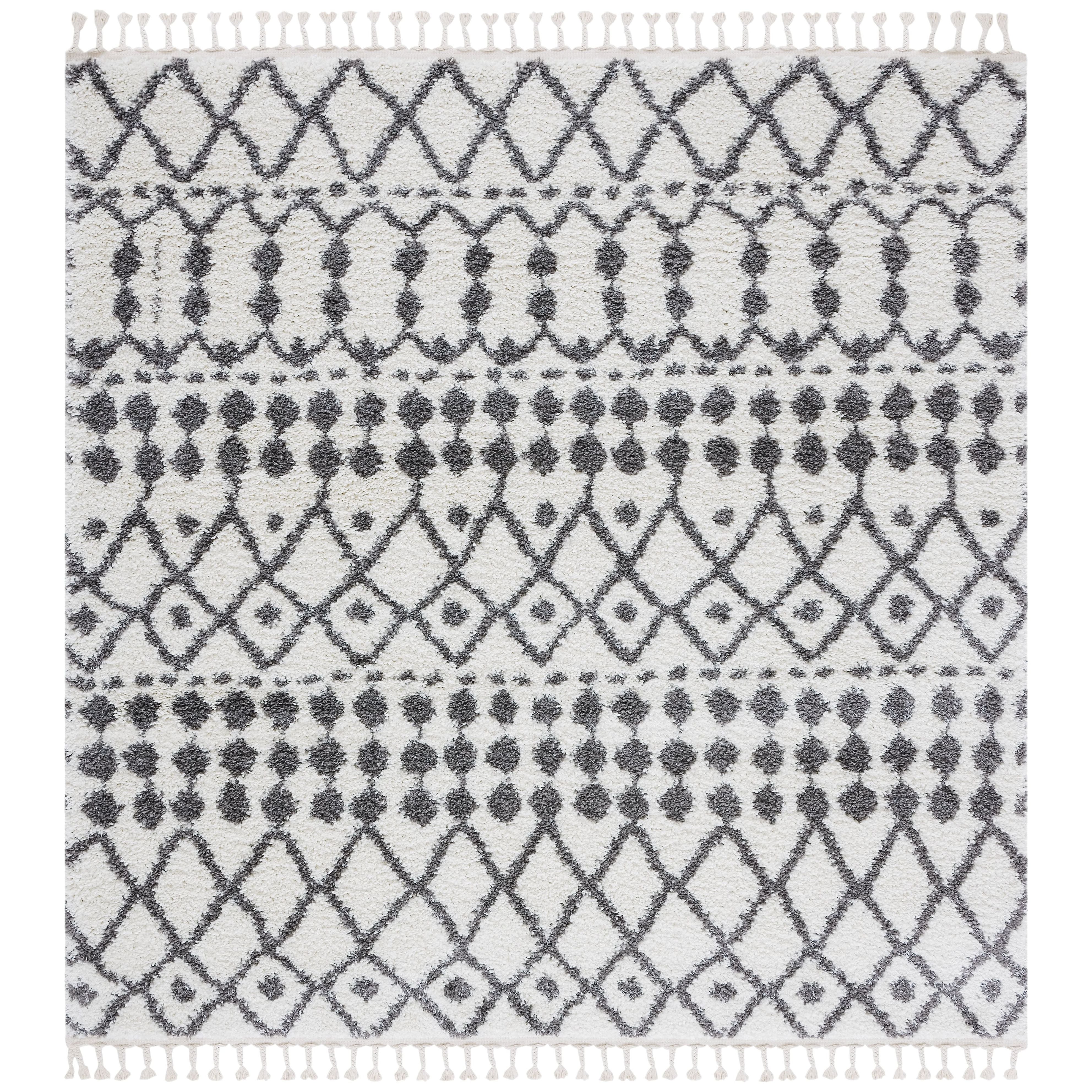 Berber Fringe Shag BFG538A rug, a blend of traditional Moroccan designs with a modern twist. These rugs pay homage to the past while incorporating easy-care fibers to minimize shedding. The distinctive fringe detailing and variations on the classic trellis pattern add character and charm to any space, with an approximate thickness of 1.2 inches.