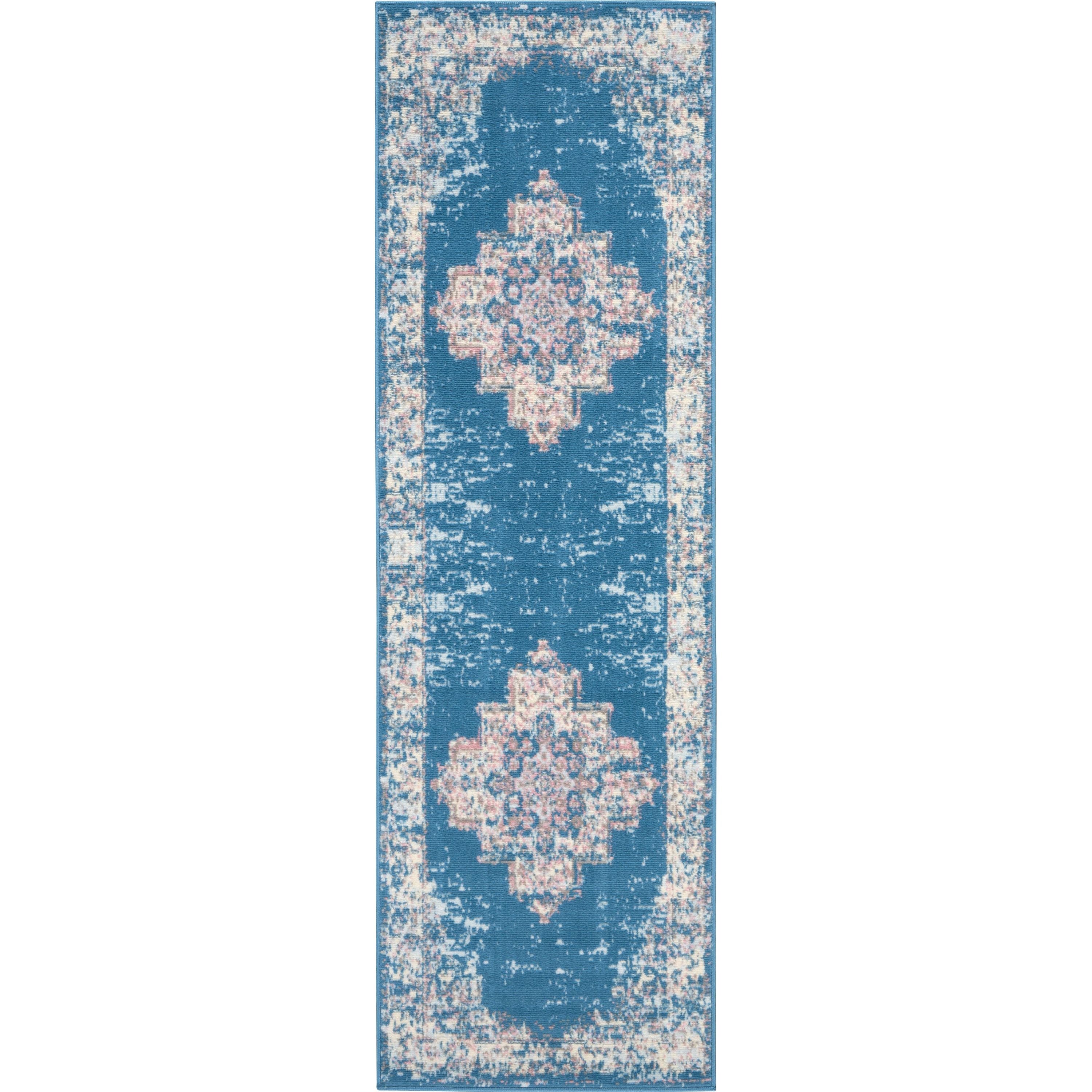 Grafix GRF14 Blue area rug, a stunning addition to your home decor. The soothing shades of blue and ivory, complemented by subtle pink accents, create a sense of peaceful elegance in any room. With a beautifully-bordered central medallion design, this rug is sure to elevate the style of your space effortlessly.