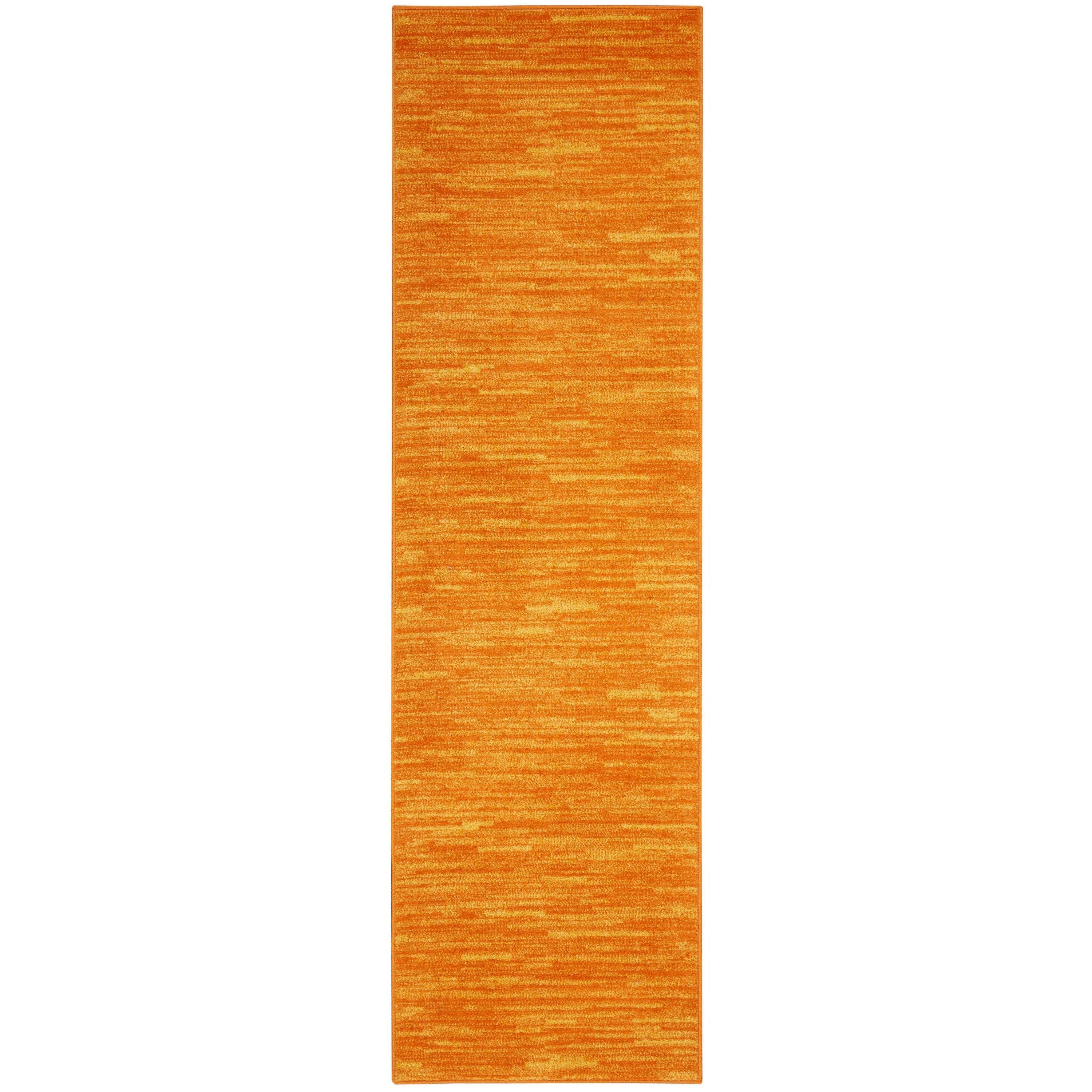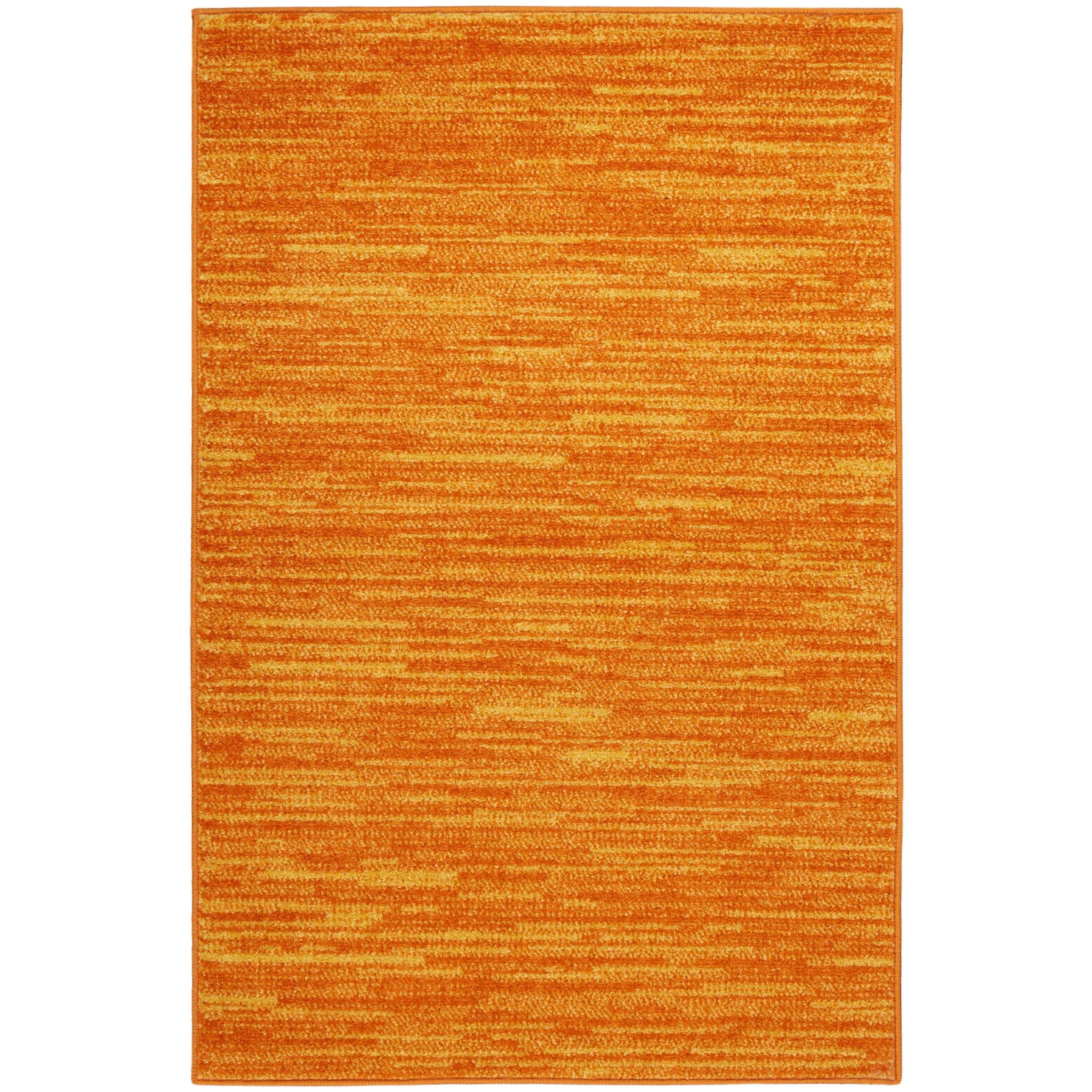 Nourison Essentials NRE01 Sunburst, a vibrant addition to your indoor or outdoor space. This sunburst orange rug from the Essentials Collection is designed for those with busy lifestyles, offering both style and practicality. Its solid pattern with subtle tonal variations and soft texture make it versatile for any room in your home. Whether used as a standalone piece or layered with other rugs, this modern rug is machine-made with durable polypropylene yarns that are easy to clean. With its low-profile construction, it can withstand heavy traffic without shedding, making maintenance a breeze - simply vacuum or hose rinse for long-lasting beauty.
