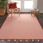 Otto DS600 Orange rug from Nourison's Otto Collection, a perfect blend of casual style and effortless decor. This flat weave rug features a stunning ivory base interwoven with contemporary hues, complemented by an ornate bound edge and charming tassels for a touch of sophistication.