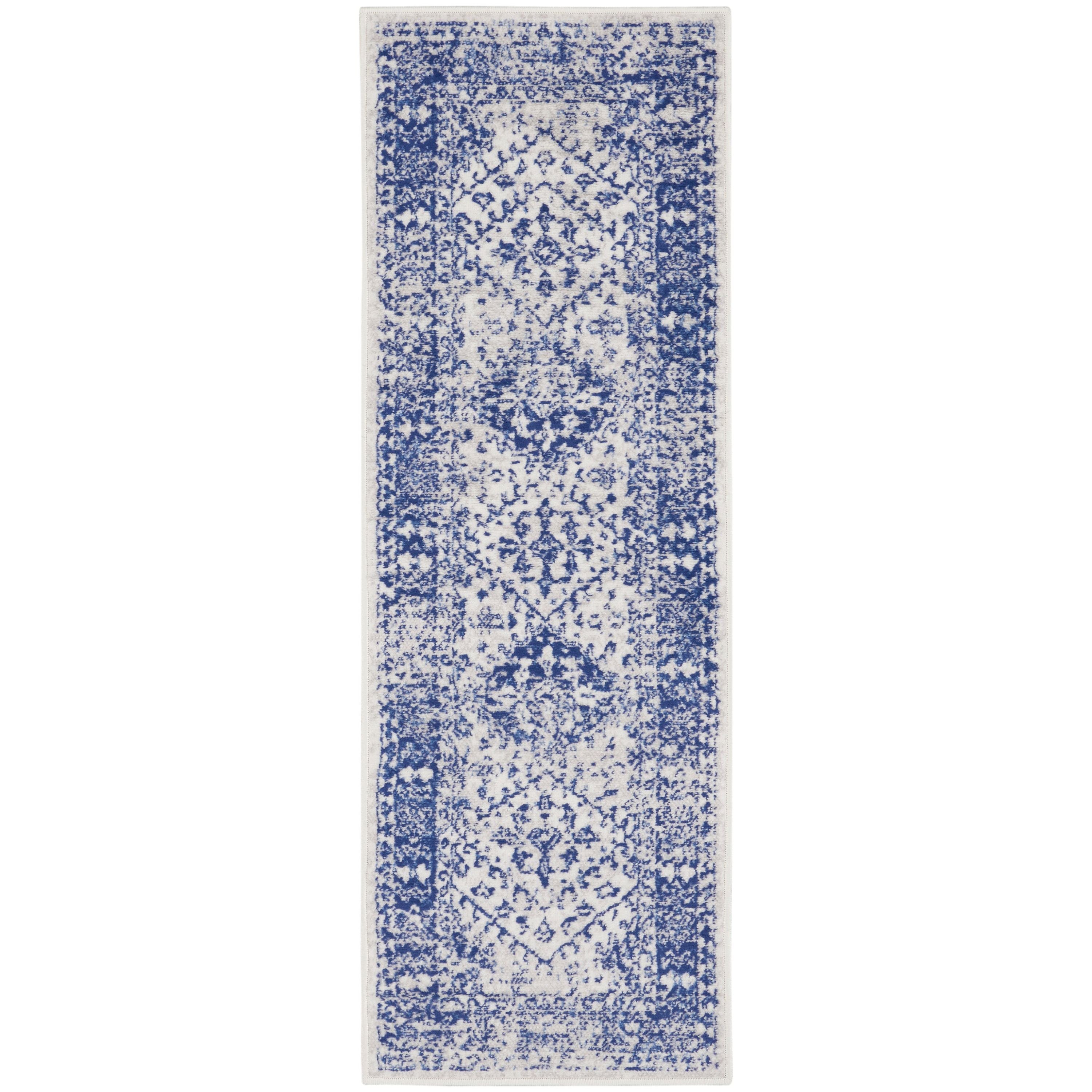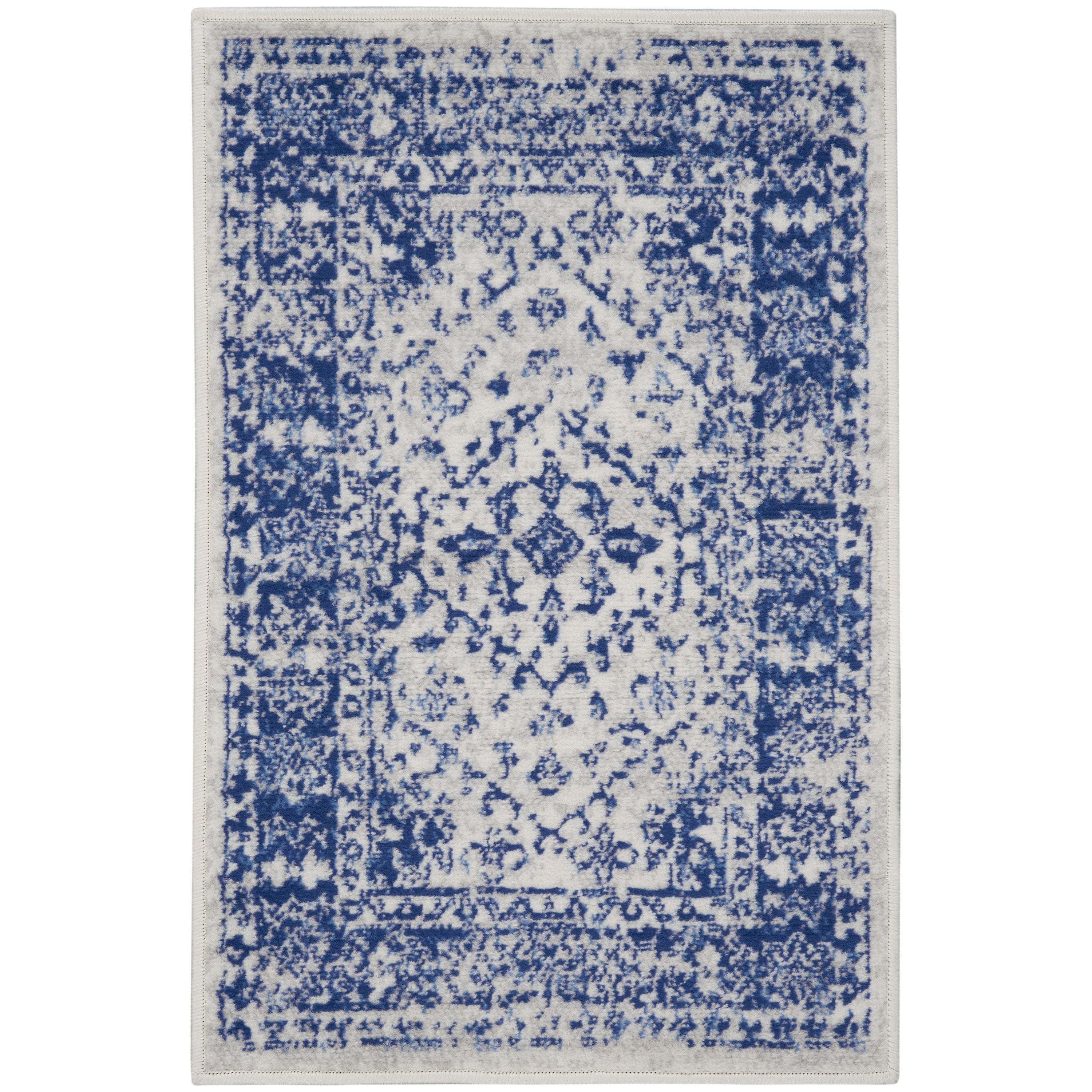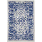 charming Whimsicle WHS15 Ivory Navy rug from our eclectic collection. Embrace true bohemian flair with a mix of tribal, geometric, and classic floral designs. The vintage patinas in neutral shades give a stylish touch to any decor theme. Crafted expertly with soft polyester, these low-profile rugs are perfect for your living room, bedroom, dining area, or home office.