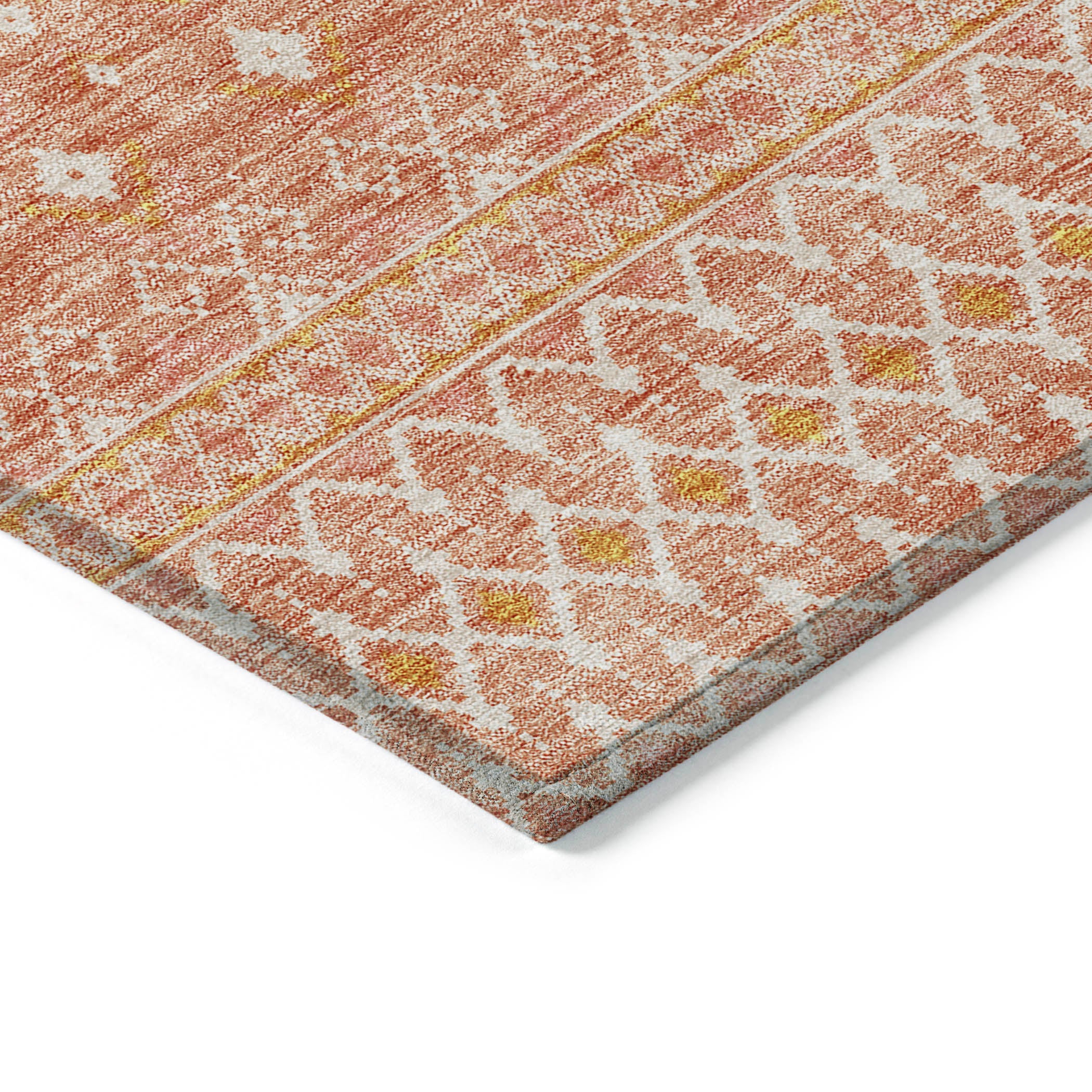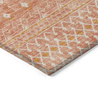 Chantille ACN709 Salmon rug, a stunning piece that embodies the essence of bohemian design. Adorned with intricate diamond patterns, this rug effortlessly combines the timeless appeal of transitional styles with boho chic flair. Whether placed in a cozy lounge or on an outdoor terrace, its UV-protected fabric guarantees long-lasting charm.