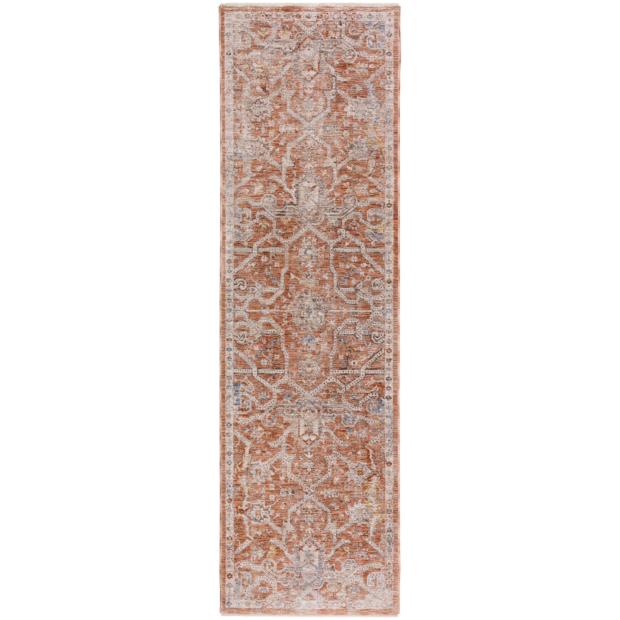 Introducing Vienna VI1 Spice, a stunning addition to the Vienna collection that will elevate your living space effortlessly. These traditional designs are meticulously woven using an innovative space-dying technique, creating a captivating visual depth and unique shading for each rug. Crafted to withstand the test of time, these rugs feature a durable polyester pile on a sturdy cotton foundation, complemented by graceful short fringe detailing.
