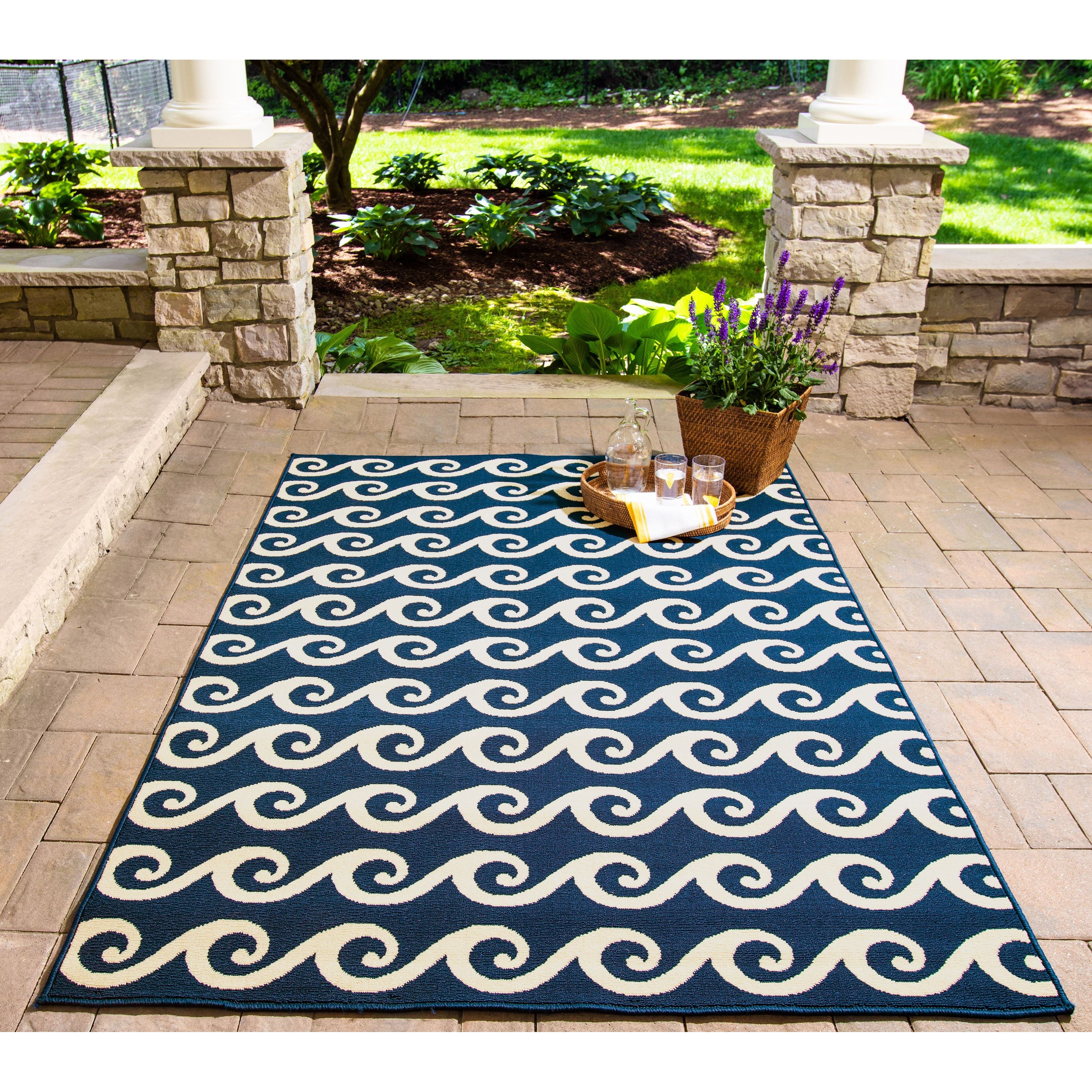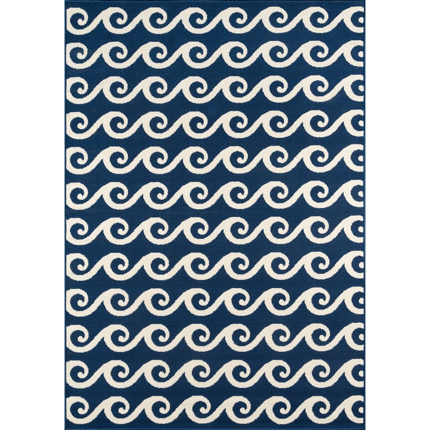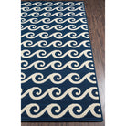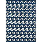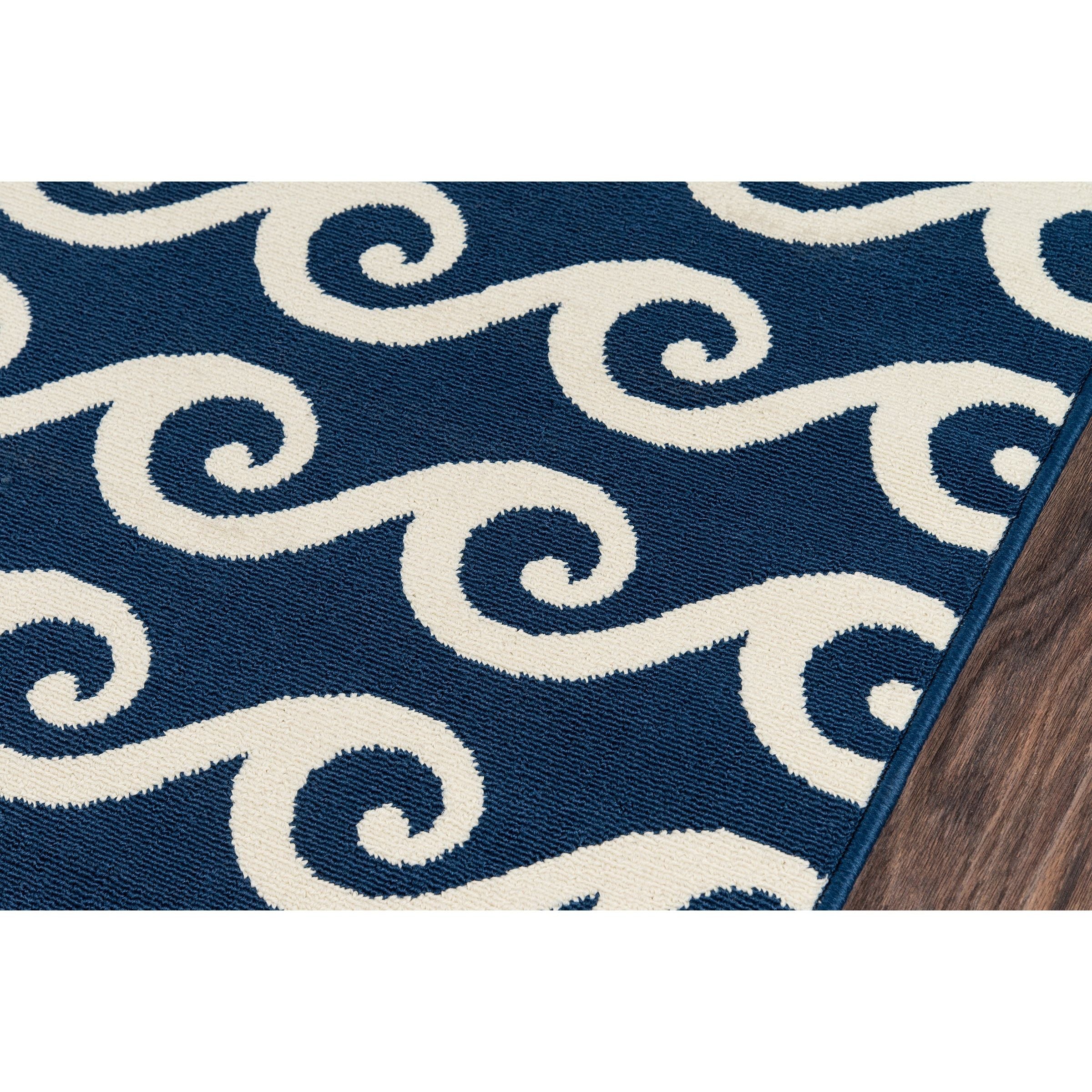 Baja BAJ14 Navy area rug, a versatile and stylish addition to any indoor or outdoor space. This all-weather rug features a blend of stripes, diamonds, trellis, and arabesque patterns intertwined with nautical elements like ropes, anchors, and waves. Perfect for patios, porches, and pool decks, this rug adds a touch of luxury to your living areas.
