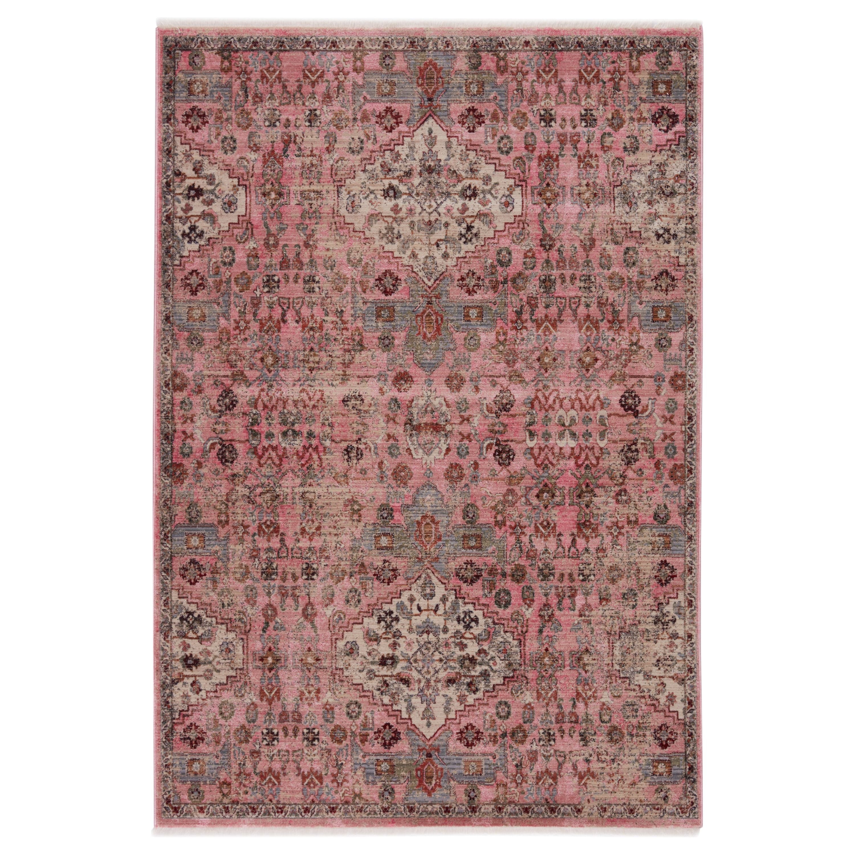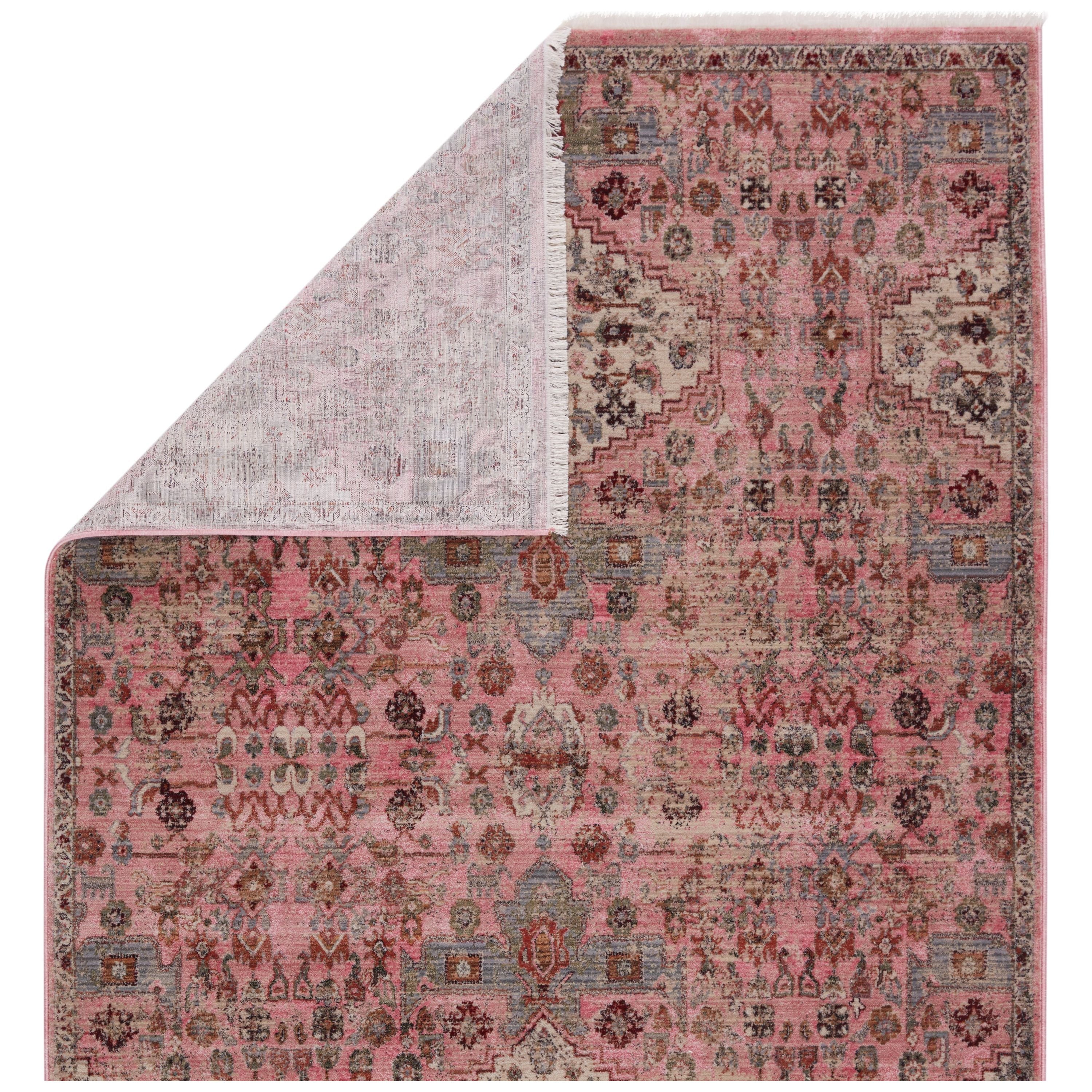 Inspired by the vintage perfection of sun-bathed Turkish designs, the Zefira collection showcases detailed traditional motifs that have been updated with on-trend, saturated colorways. The Kerta rug boasts a distressed traditional pattern in tones of pink, beige, and gray. This power-loomed rug features cotton fringe detailing, a natural result of weft yarns, that echoes hand-knotted construction and adds brilliant texture to the plush, durable polypropylene pile.