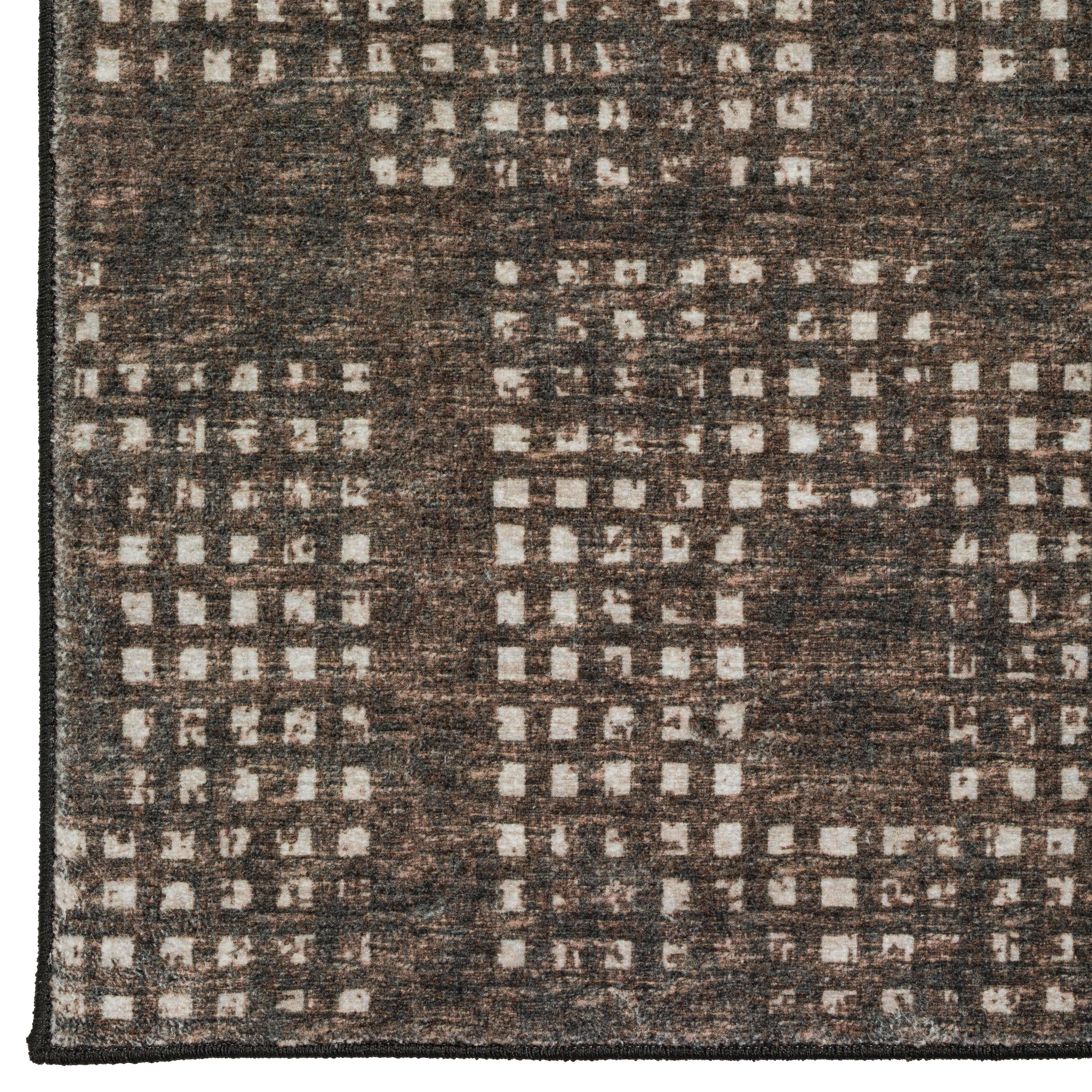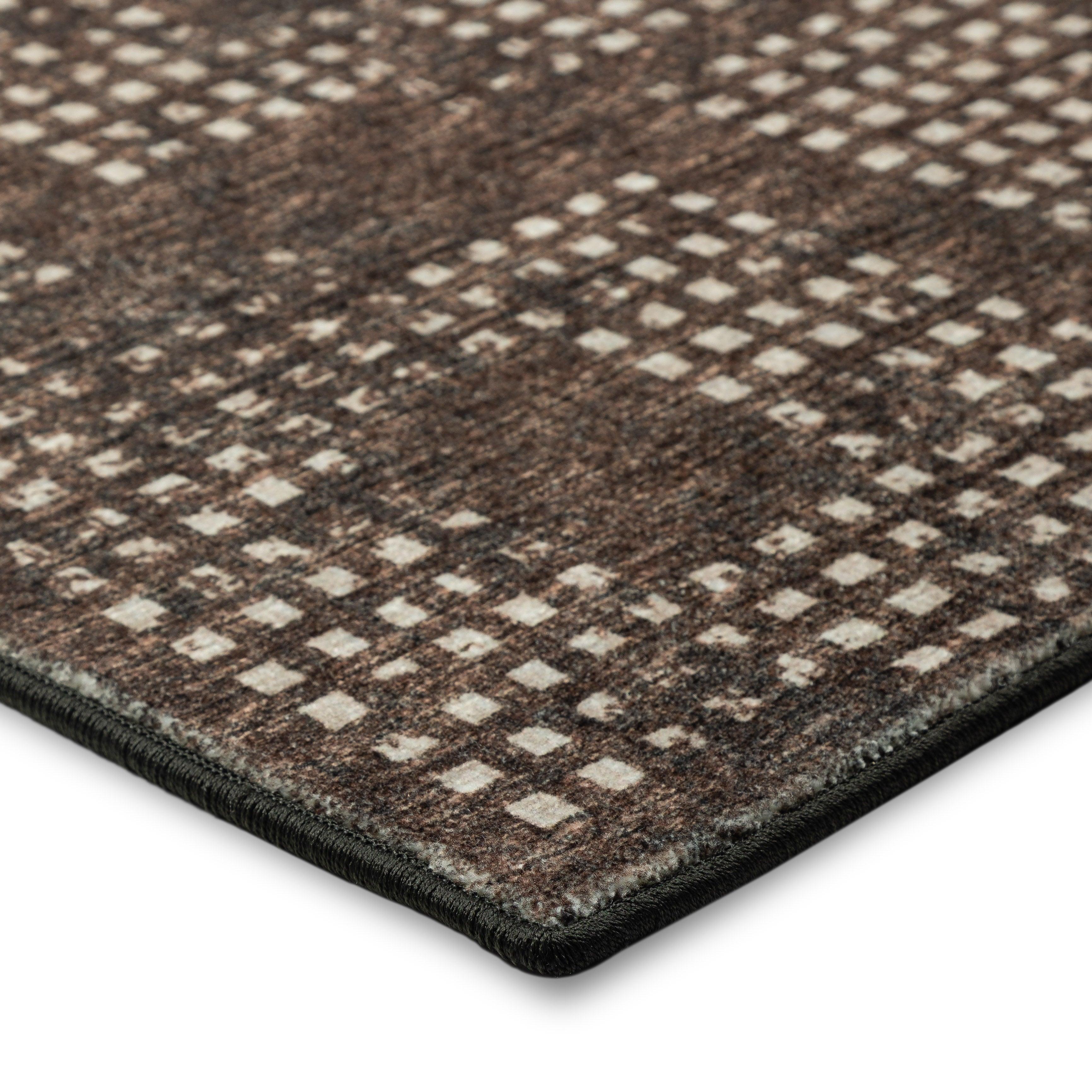 Delano DA1 Chocolate area rug, part of the Delano collection featuring a subtle multi-tonal geometric style. Utilizing cutting-edge prismatic processing technology, each rug boasts a unique color scheme with thousands of combinations and shading variations. Crafted in the USA using a combination of foreign and domestic materials, these rugs are built to last with UV stabilization and fade-resistant properties. The dense pile offers a soft cushioning feel, while the non-skid rubber backing ensures stability. Perfect for households with pets and children, this rug is easy to maintain - simply vacuum regularly or shake out. For spot cleaning, use clear water and avoid aggressive cleaning methods.