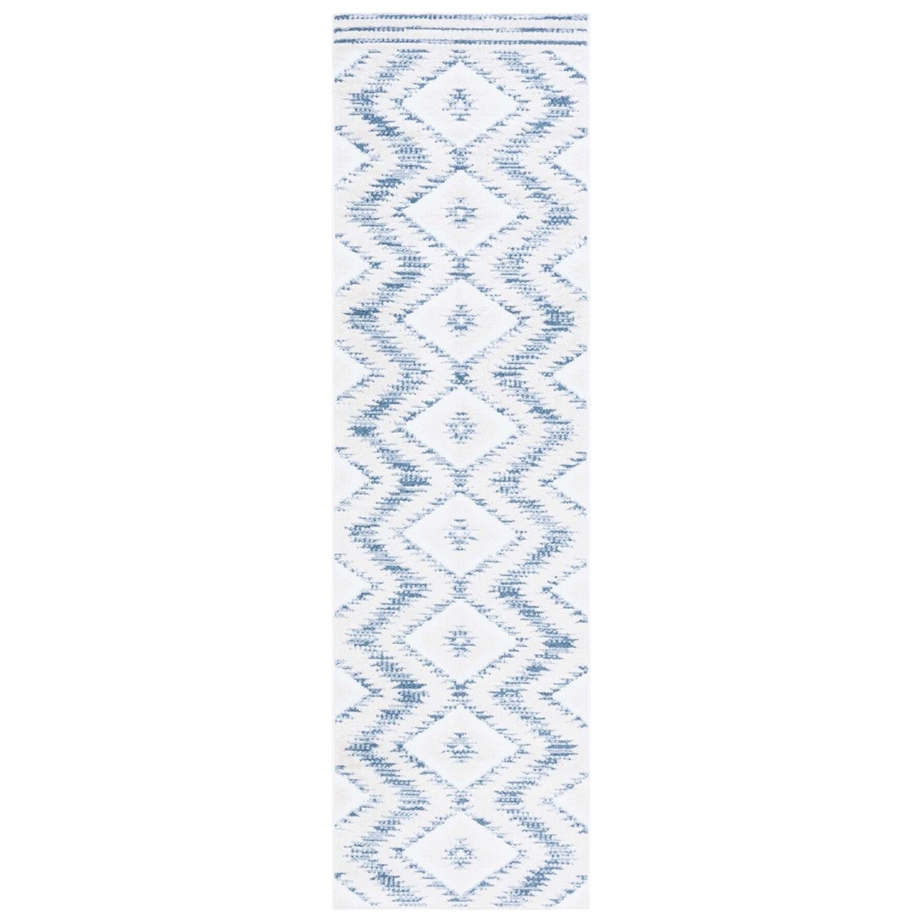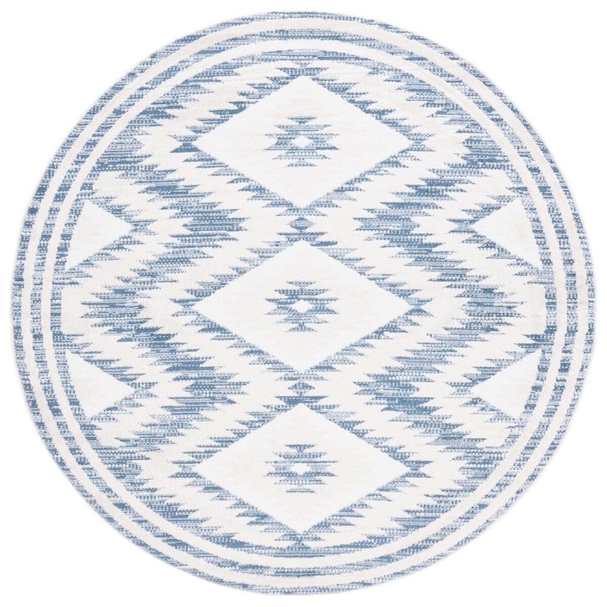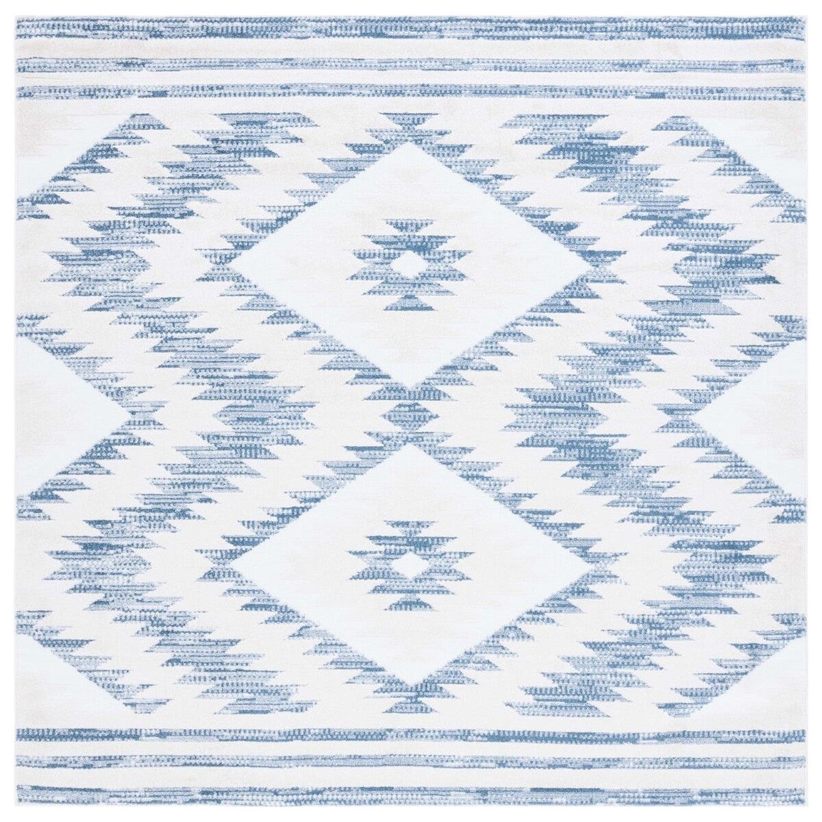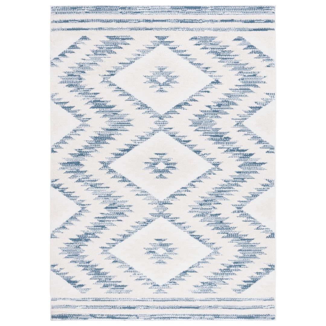 Alamo ALM737M Ivory Blue rug, a perfect blend of boho-modern style and captivating colors. Crafted with durable synthetic yarns, this flat weave rug from the Alamo Collection is designed to bring charm and character to any space.