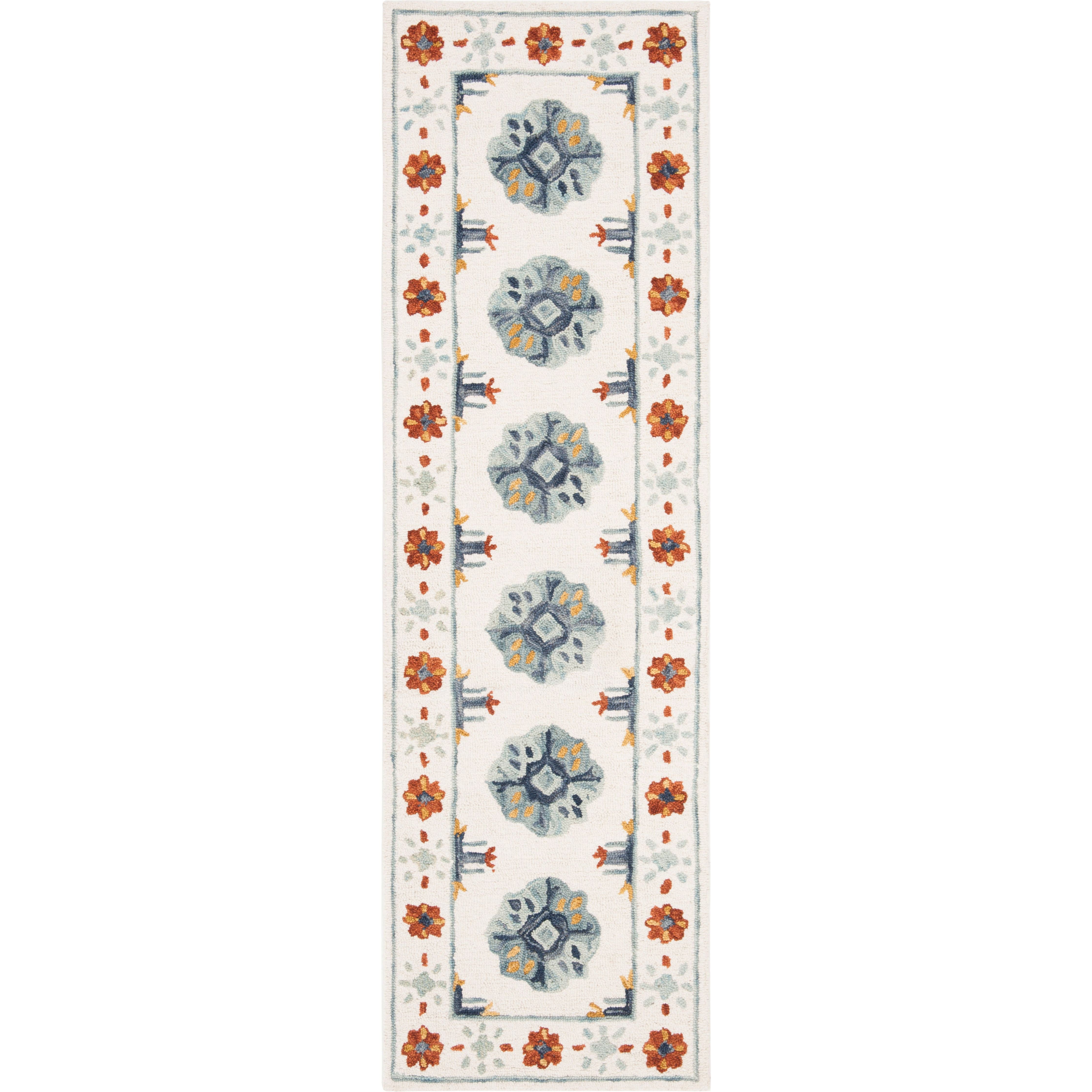 Blossom BLM901A Blue Ivory rug from Safavieh's exquisite Blossom Collection. This collection is inspired by the beauty of nature, showcasing modern floral patterns that bring an elegant touch to any room in your home. Handmade with 100% premium wool, these rugs are crafted using advanced hand-tufting techniques for enhanced durability.
