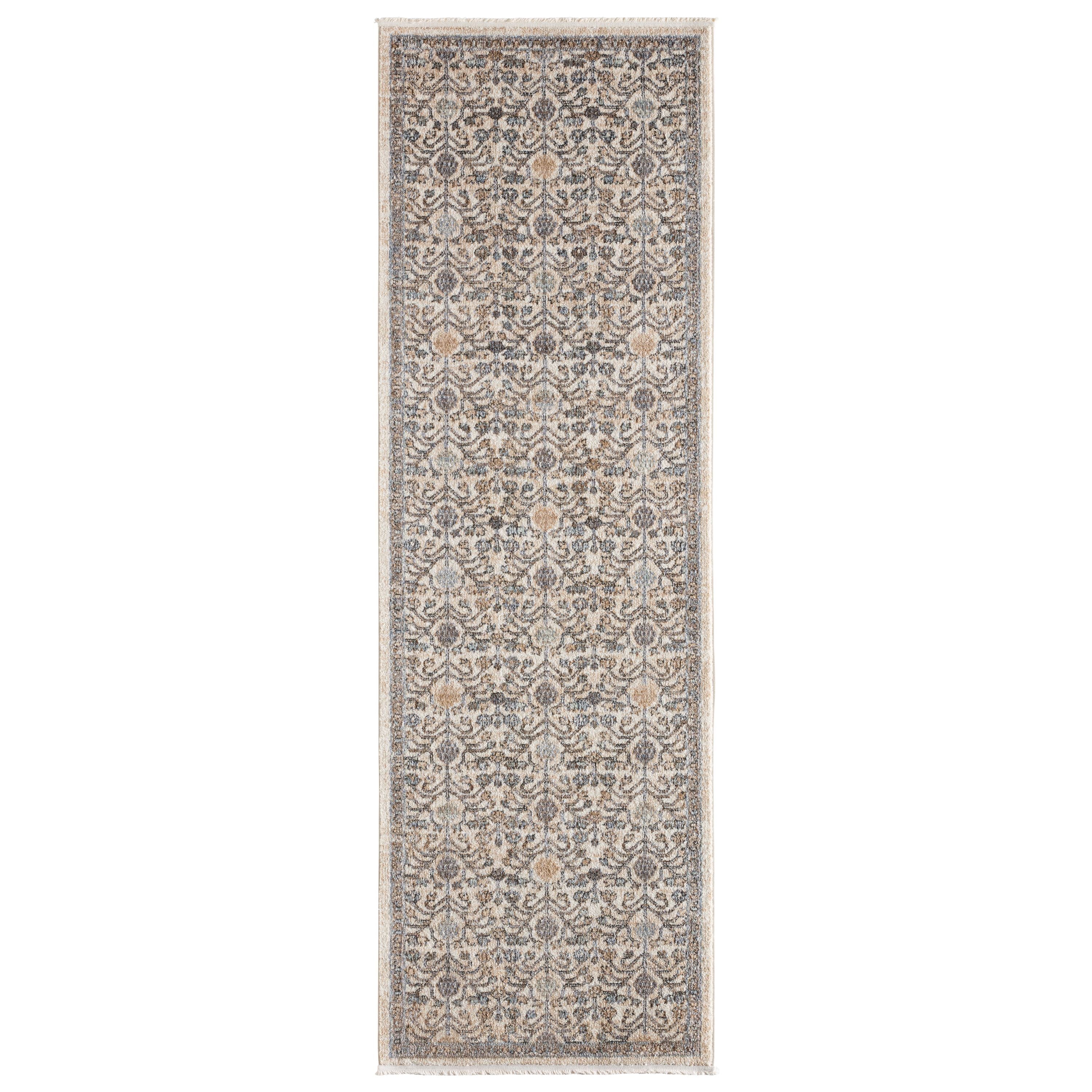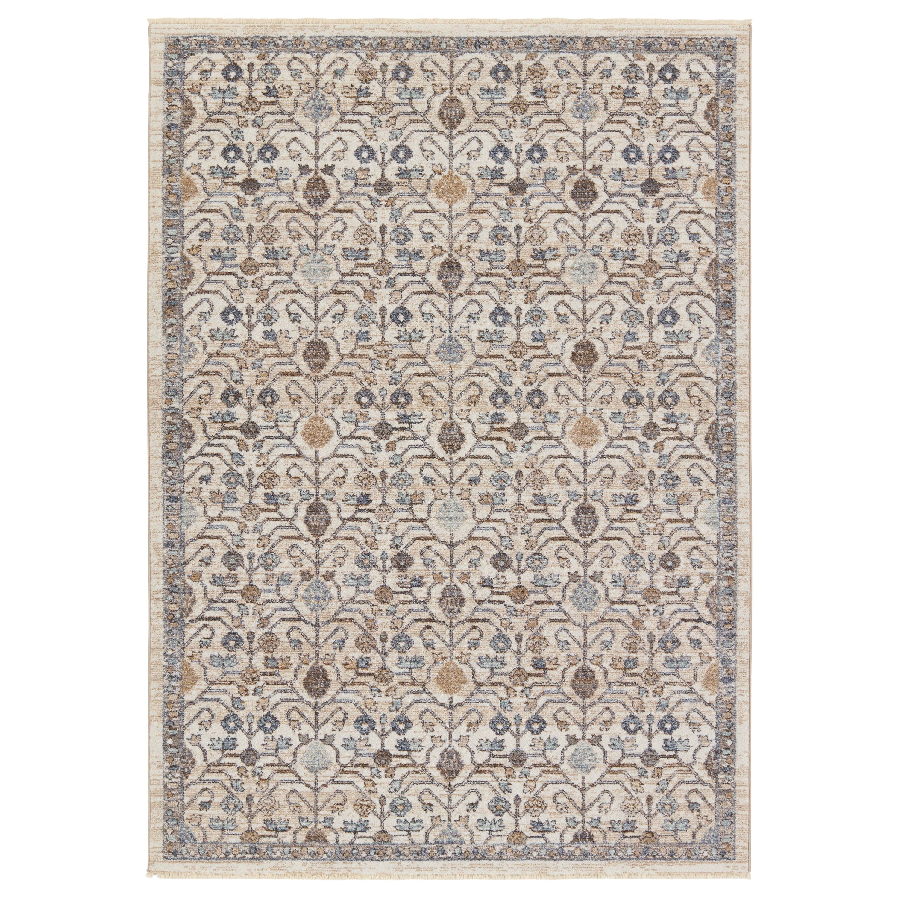Inspired by the distressed perfection of antique textiles, the Lark collection is warm and inviting with rich, updated hues. The updated traditional Primrose area rug showcases an intricate, floral trellis design paired with short, cream fringe. The flower details spring to life in hues of blue, gold, brown, cream, and taupe. This indoor rug thrives in high and low trafficked areas of the home such as living rooms, halls, entryways, bedrooms, and dining areas.