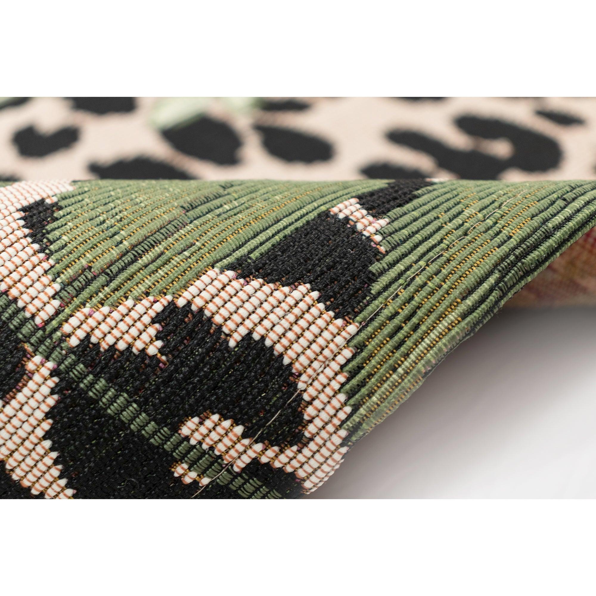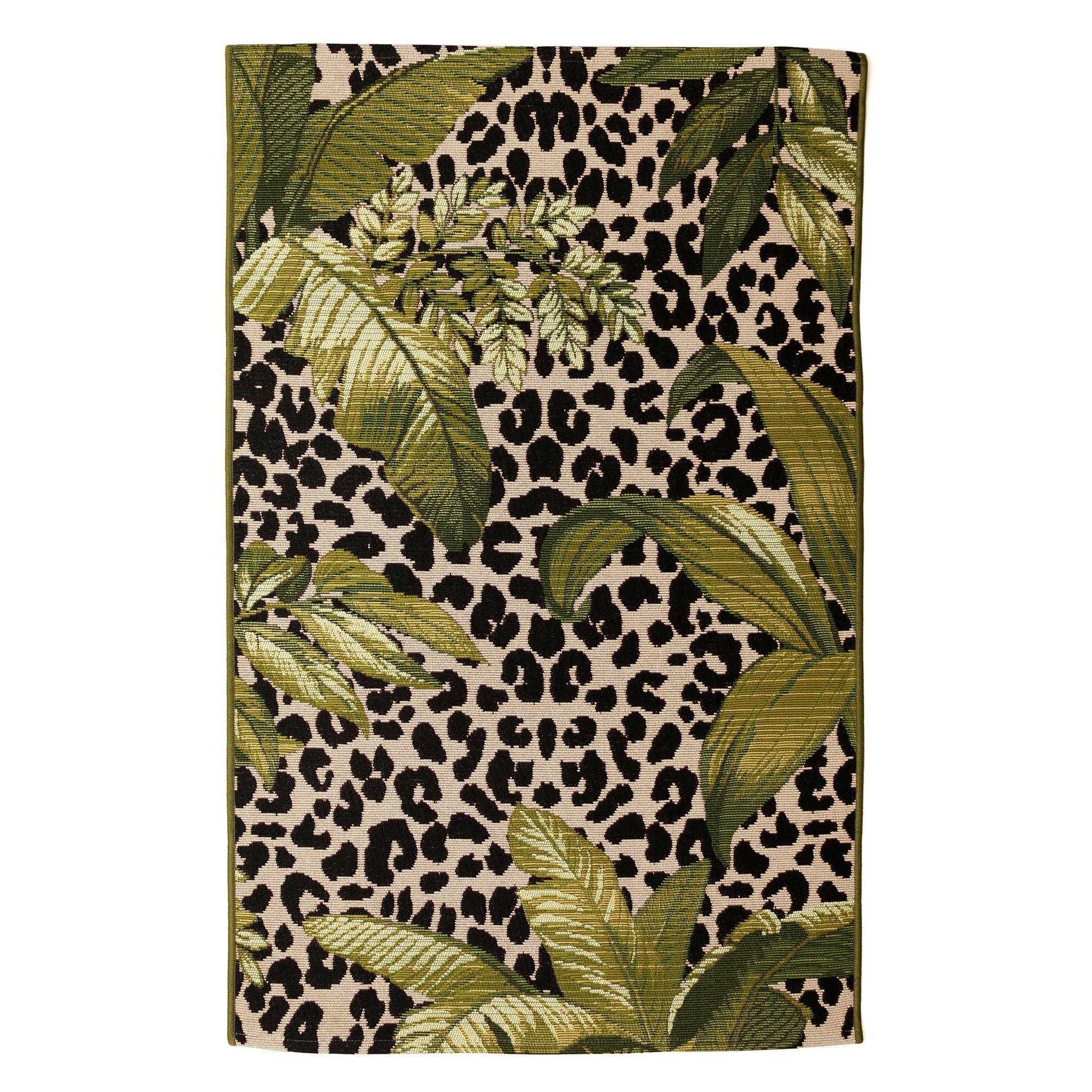 Marina Safari Green area rug, a stunning blend of leopard print and tropical leaves that brings a touch of modernity and boldness to any space. The classic beige and black leopard pattern is beautifully complemented by intricate green foliage, creating a harmonious nod to nature. Crafted in Egypt from 100% polypropylene, the Marina Collection boasts detailed designs with a wide color range and a premium finish.