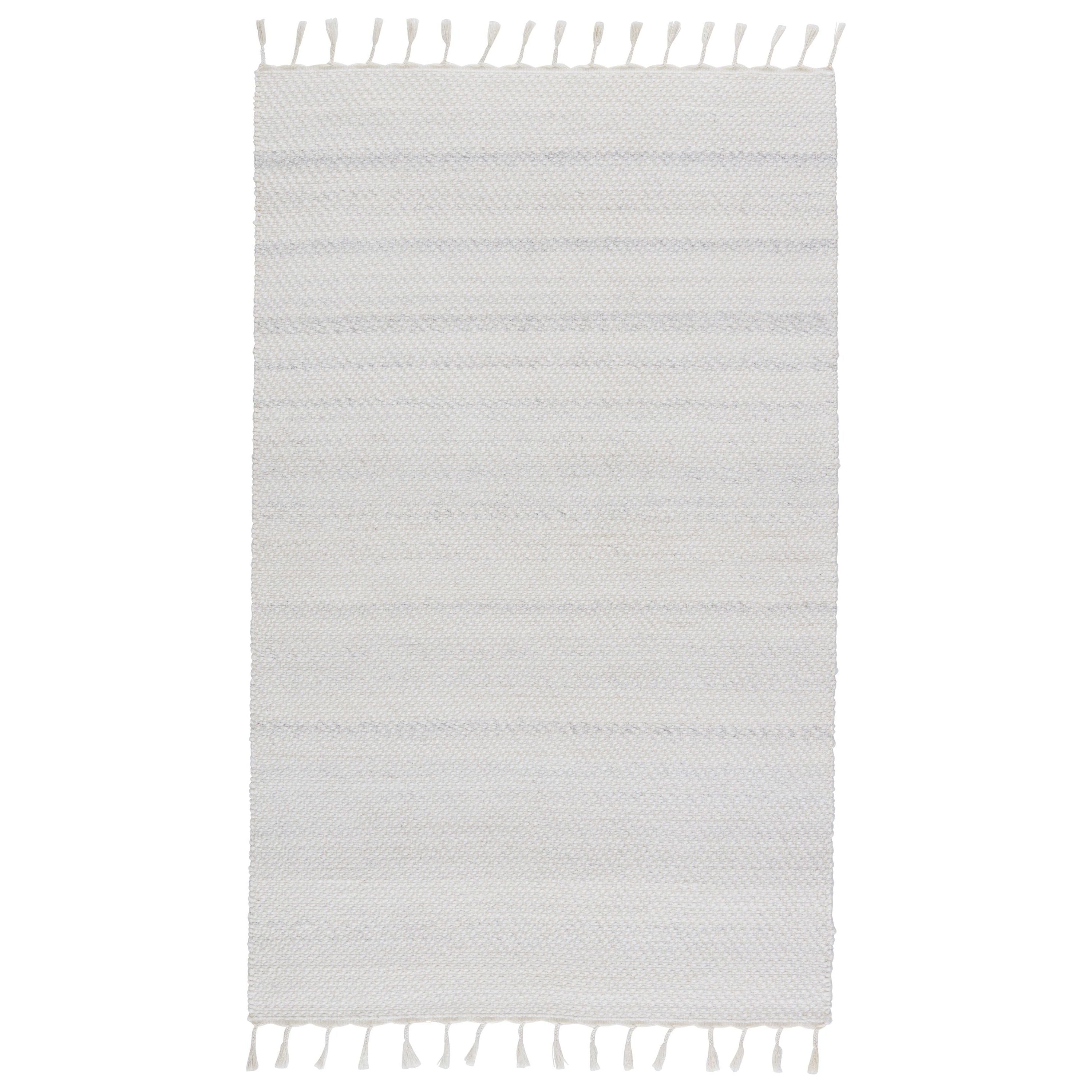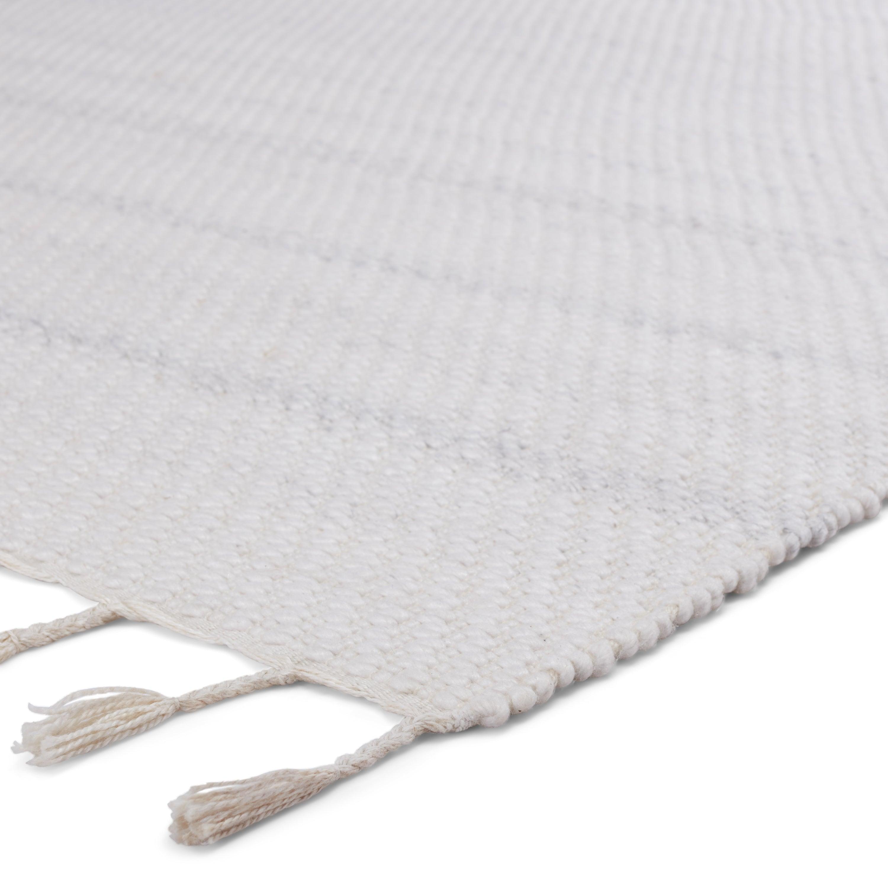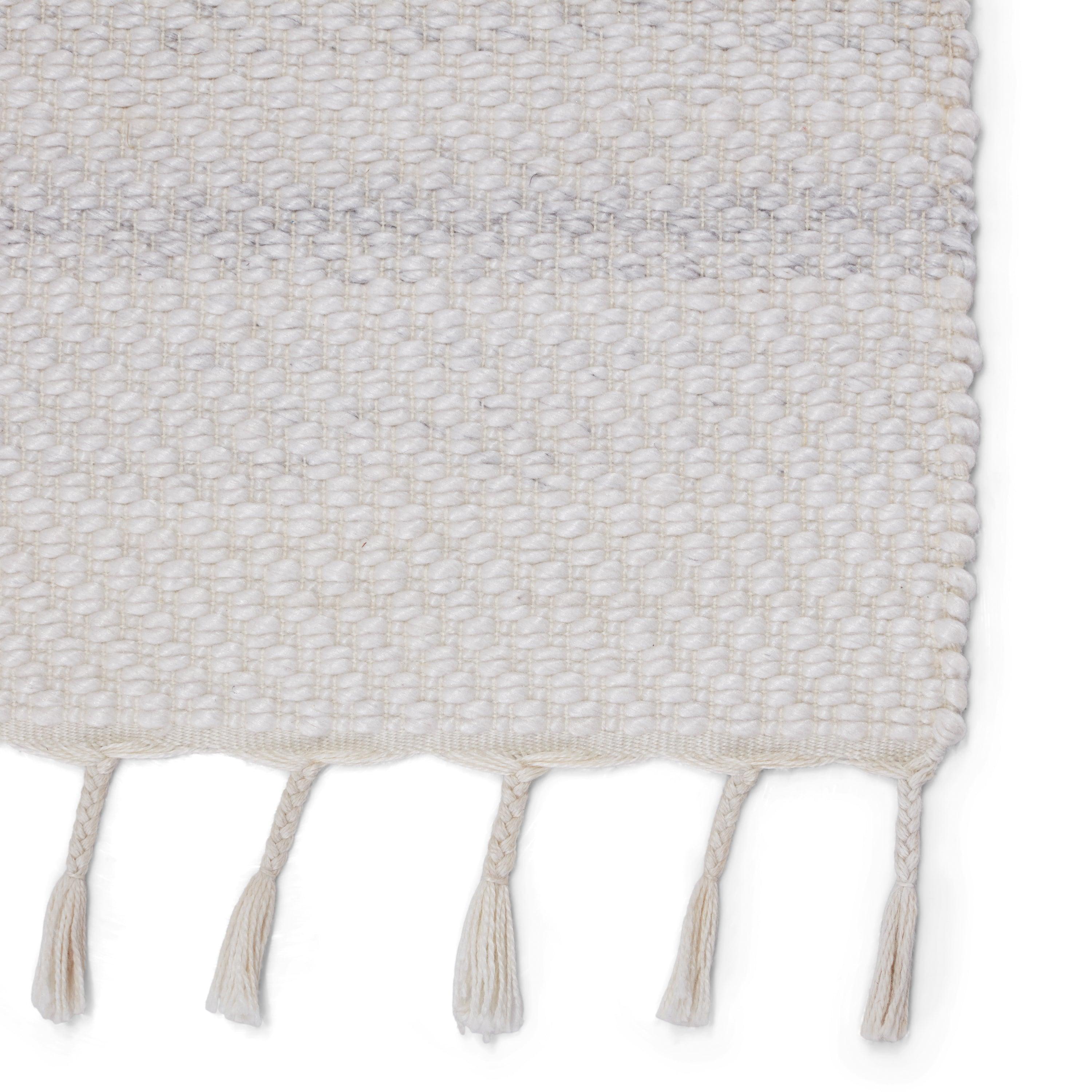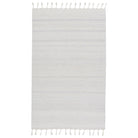Coronado CND02 Encanto area rug, a modern and adaptable addition to any space. Crafted with a handwoven, heathered design, this rug is perfect for high-traffic areas and outdoor settings. Made with durable PET yarn, it offers a relaxed and grounding accent for patios, kitchens, or dining rooms. The soft white and light gray color scheme creates a light and airy atmosphere, while the braided fringe detail adds a unique global flair.