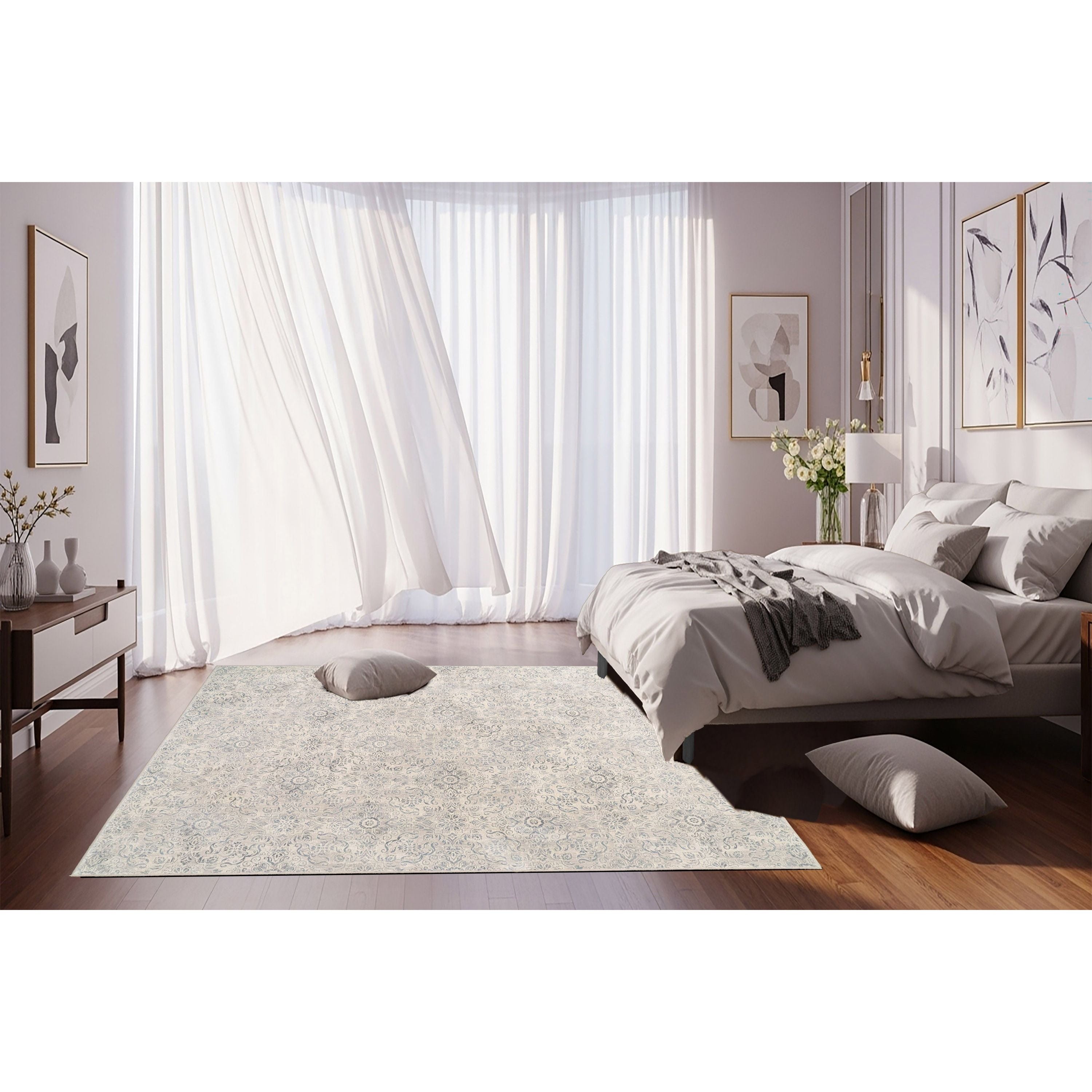 Ancient Garden 57162 Silver Grey rug, a stunning fusion of traditional Persian design and contemporary flair. This rug effortlessly blends classic patterns with a modern aesthetic, showcasing a sophisticated color palette that emphasizes antique hues and intricate details. Crafted with care using Decolan, a luxurious wool-like heat set polypropylene material, the Ancient Garden rug exudes a refined, hand-knotted appearance that sets it apart from typical machine-made rugs.