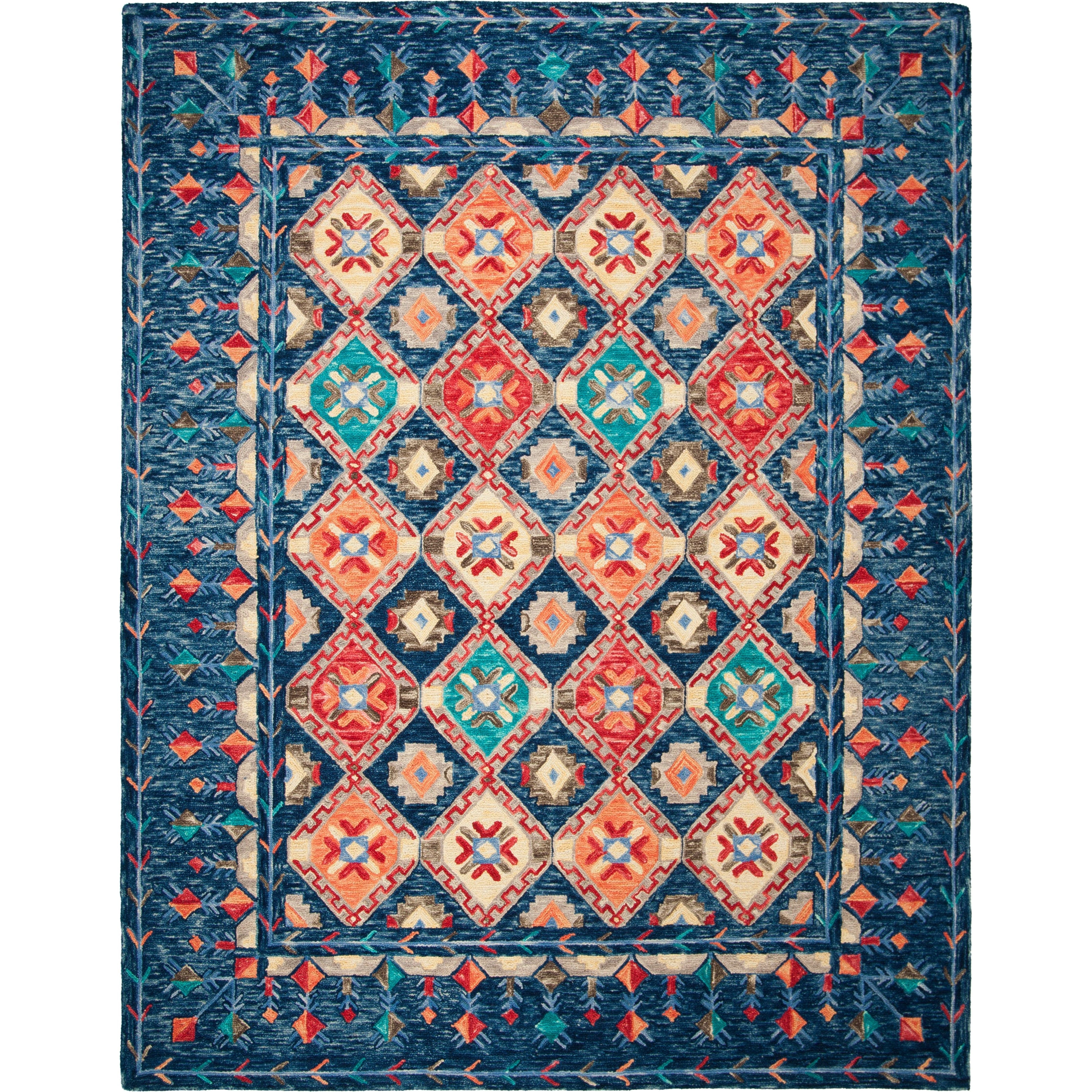 Aspen APN515N Navy Orange rug from the stylish Aspen Collection, perfectly blending rustic-chic decor with tribal-inspired designs. This rug features a sublime color palette and a soft, comfortable feel underfoot, adding a touch of sophistication to your home. Crafted using pure wool in a low loop pile, the striking design and approximate thickness of 0.5 inches make it an ideal choice for classy-casual home decor settings.