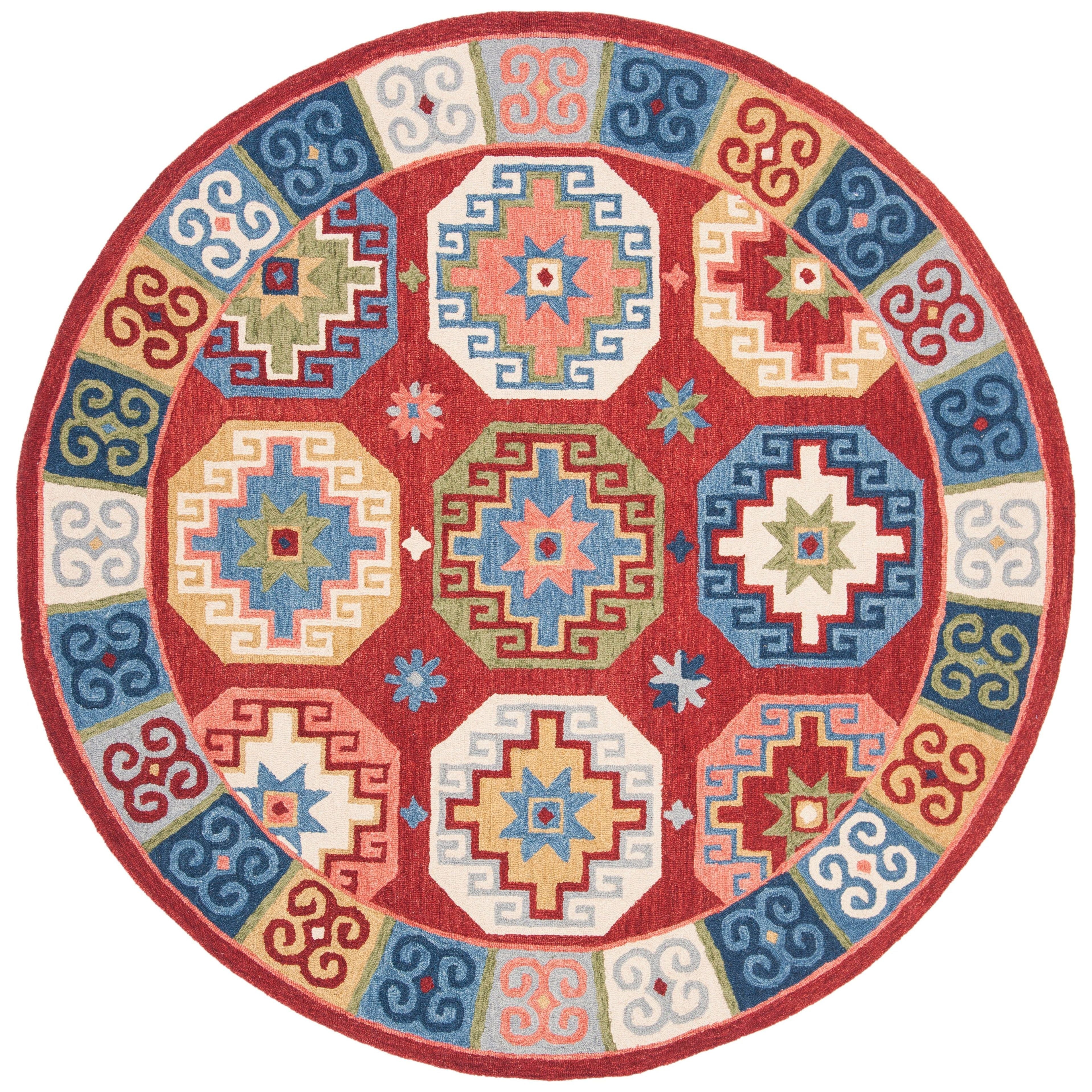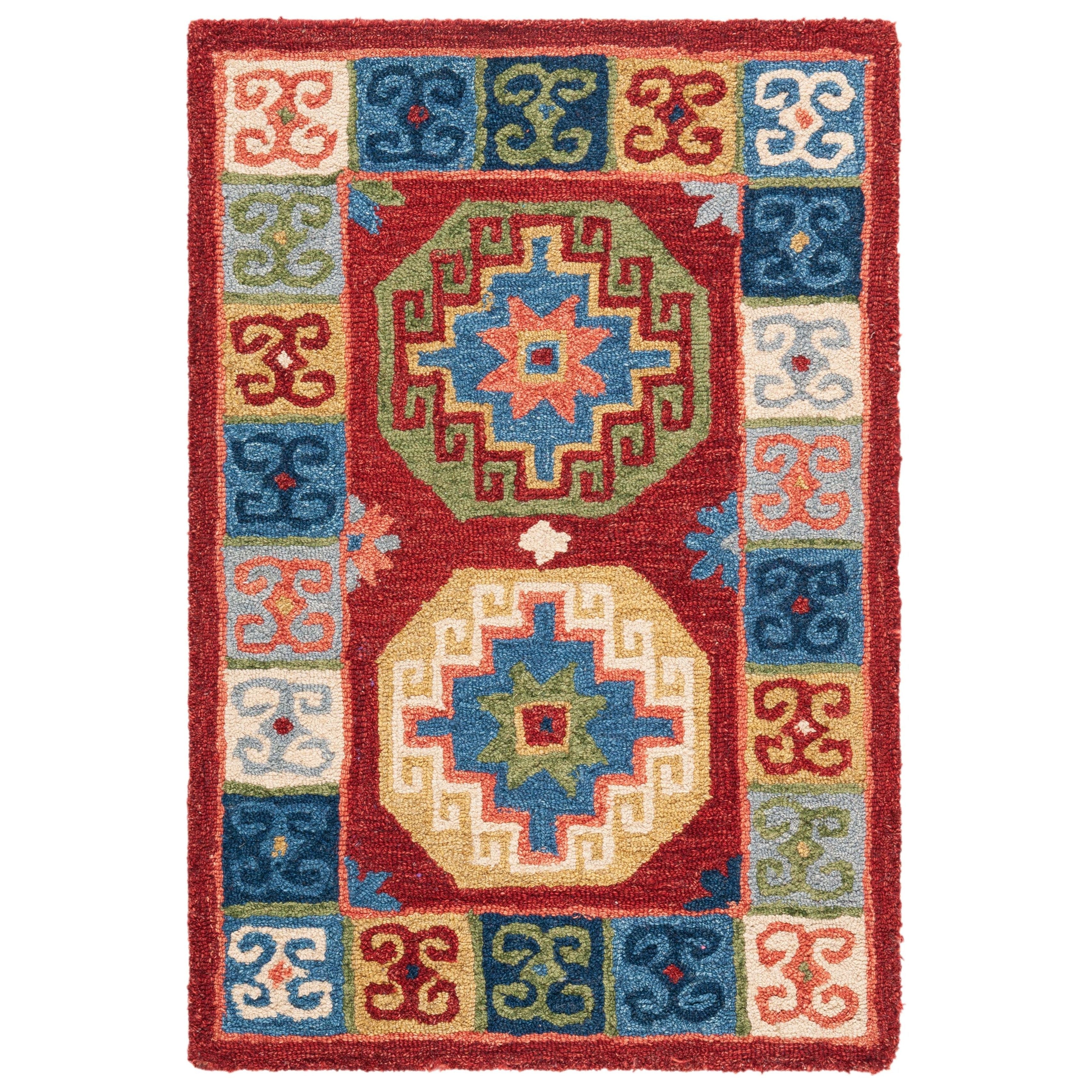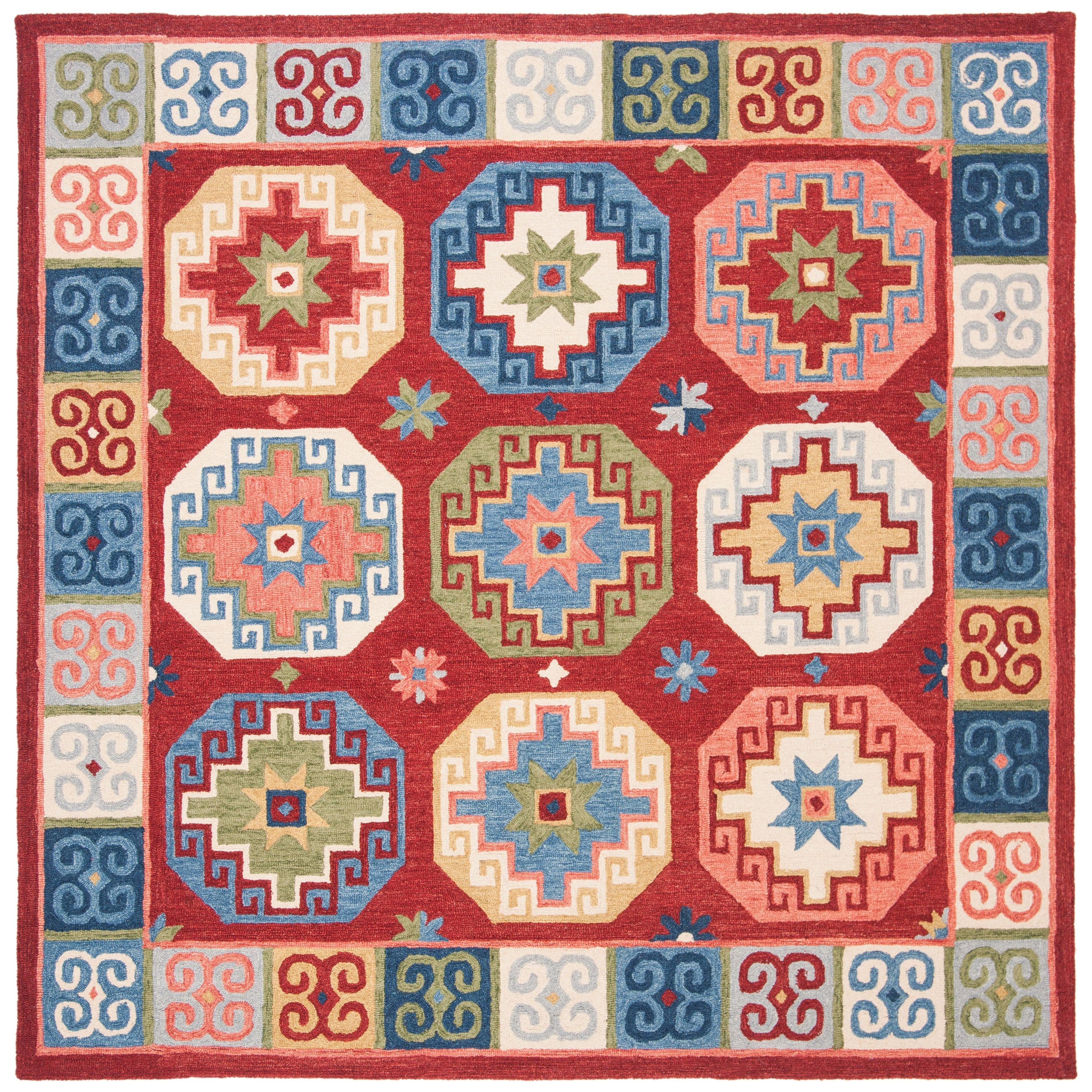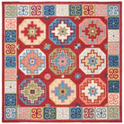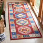 Aspen APN802Q Red Blue rug from the Aspen Collection, a perfect blend of rustic-chic charm and tribal-inspired artistry. This trendy rug features expressive tribal motifs in a sublime color palette, adding a touch of fashion-forward style to your home decor. Crafted from pure wool with a low loop pile, the Aspen rug offers both durability and comfort underfoot, measuring approximately 0.5 inches in thickness.
